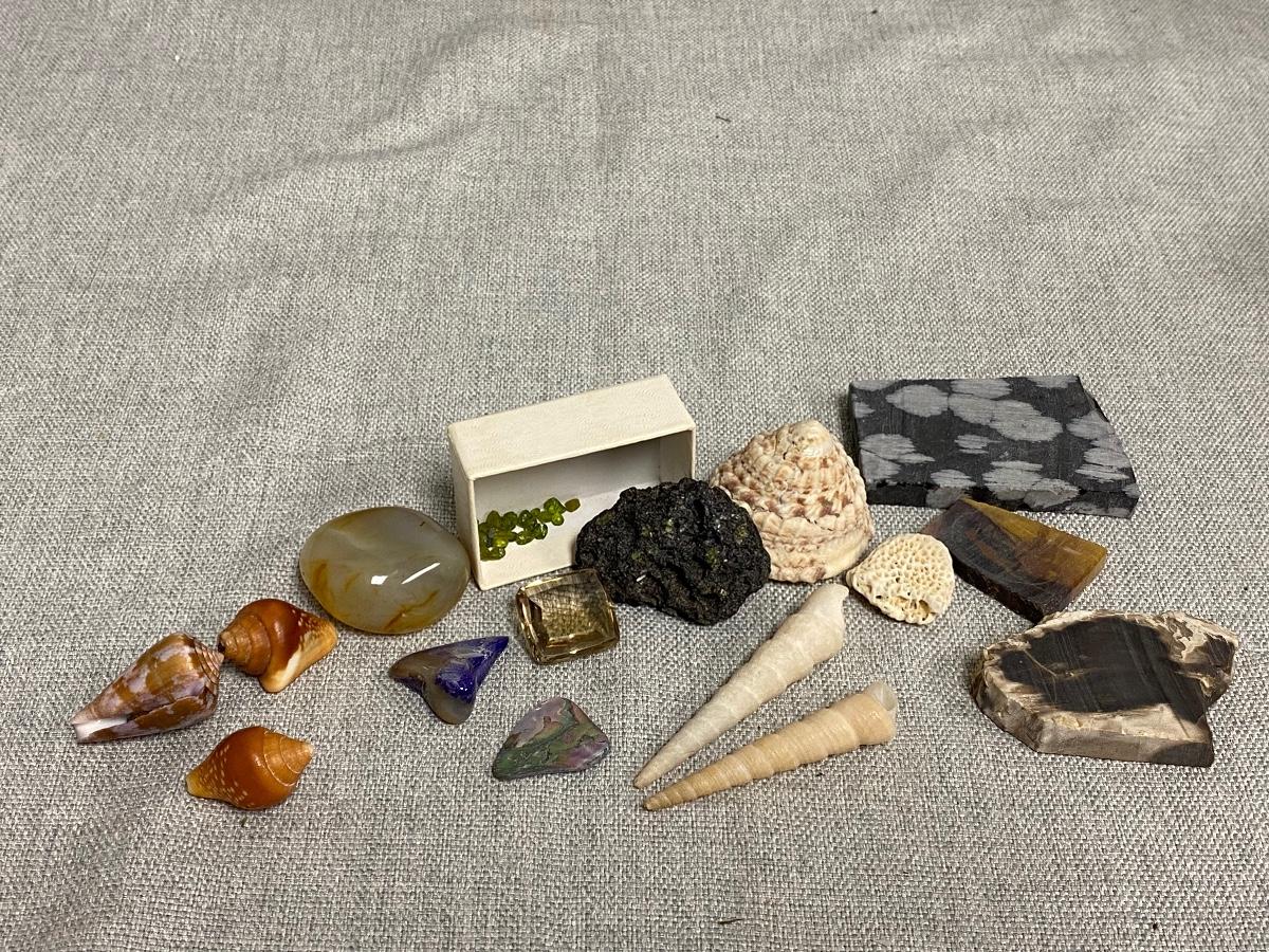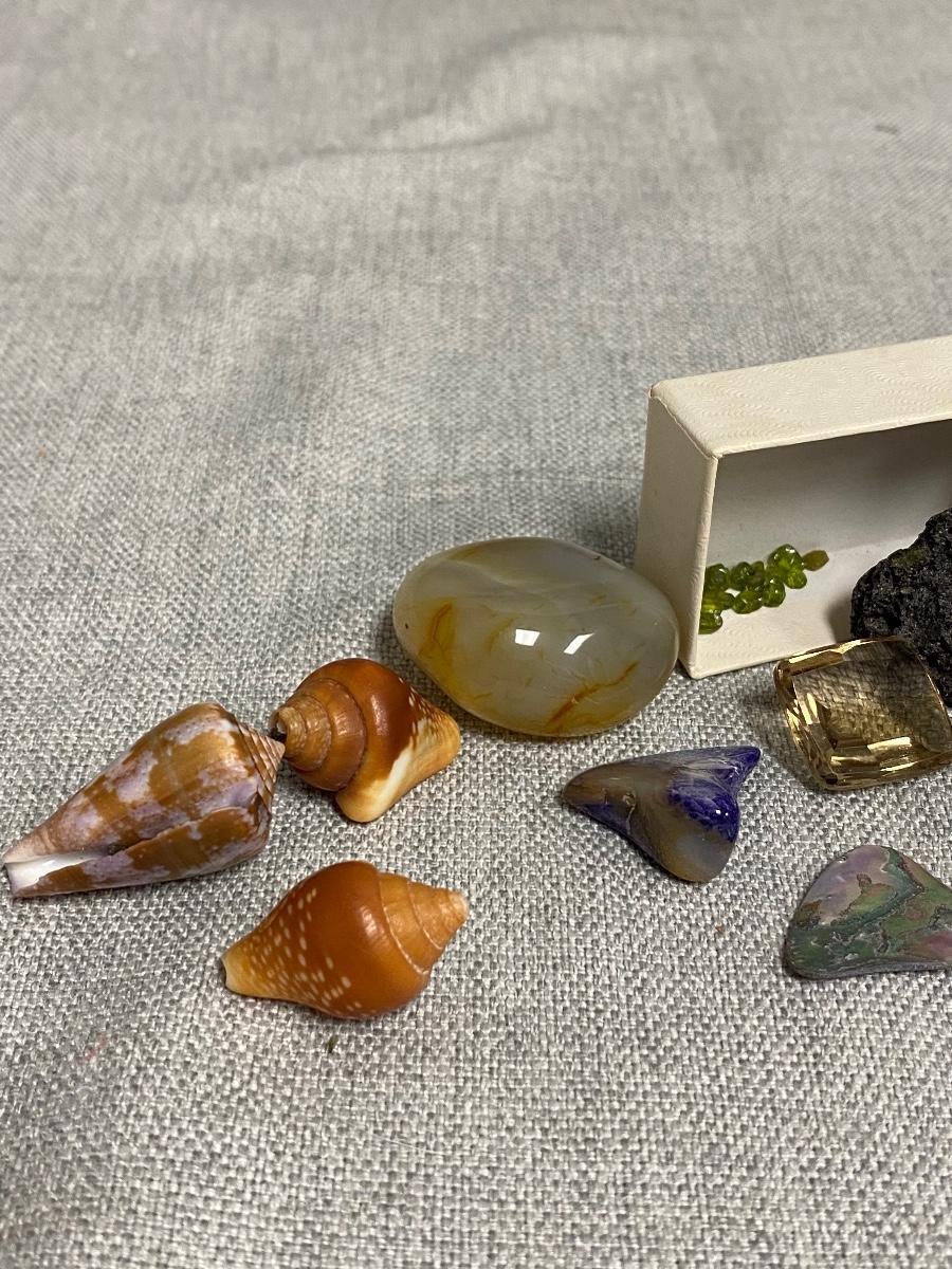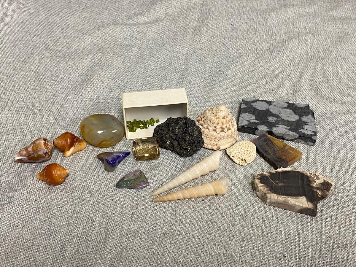 Lot of Shells, Stones, & Rocks. Nice mix of items. The lava rock has small flecks of what looks like peridot in it, same with the small pieces in box.