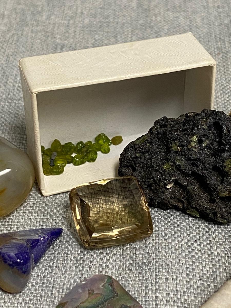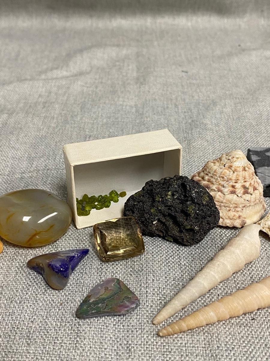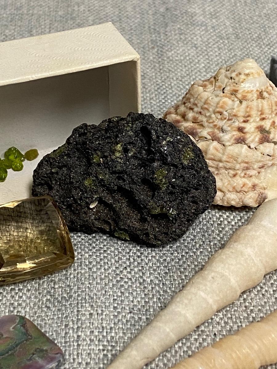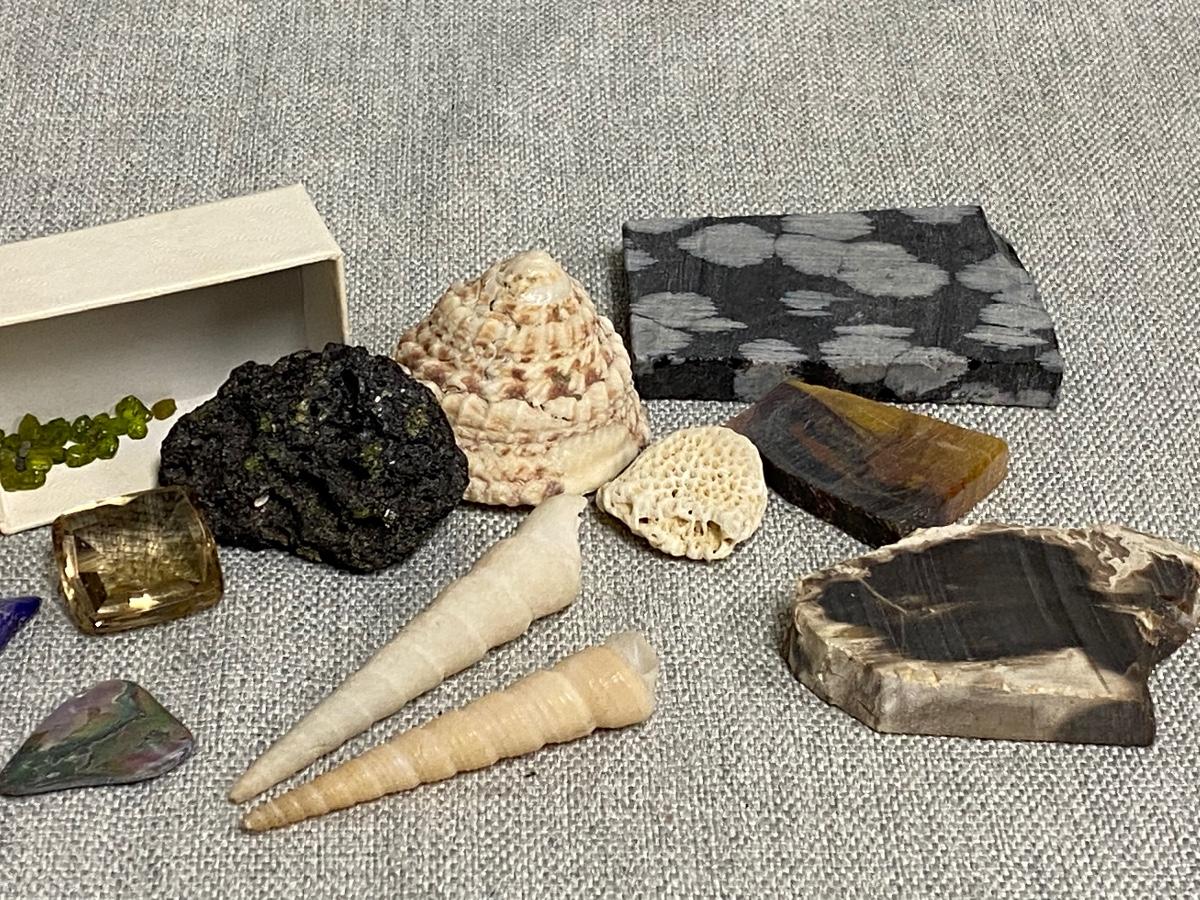 Lot of Shells, Stones, & Rocks. Nice mix of items. The lava rock has small flecks of what looks like peridot in it, same with the small pieces in box.