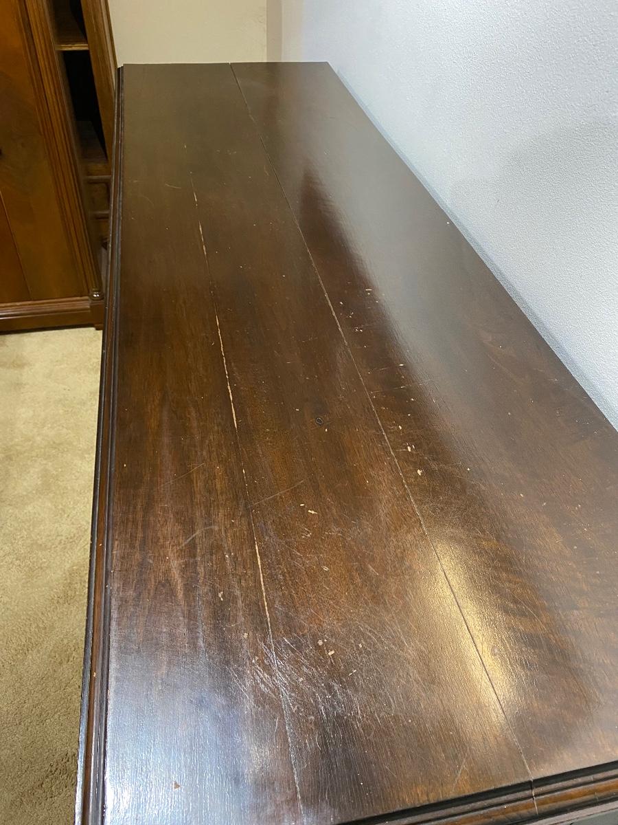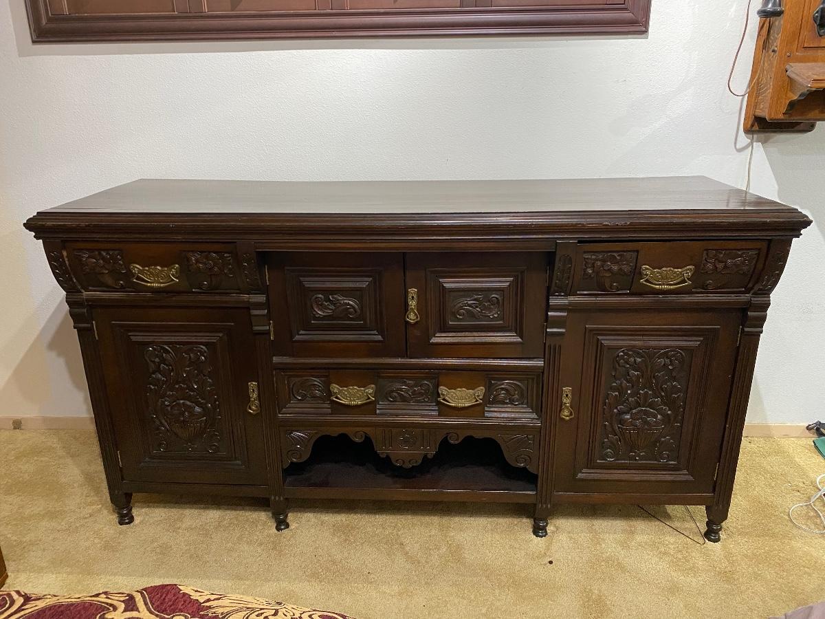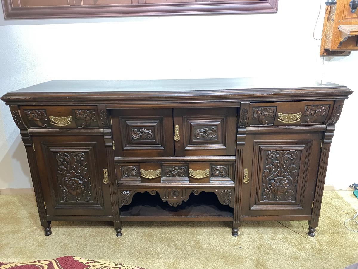 Vintage dark finish carved wood buffet. Was being used as a dresser by previous owner. Multiple drawers and cabinets. In good vintage condition. Center cabinet doors are a little tweaked but open/close fine. Great carved details. LOCAL PICK UP IN FULLERTON.