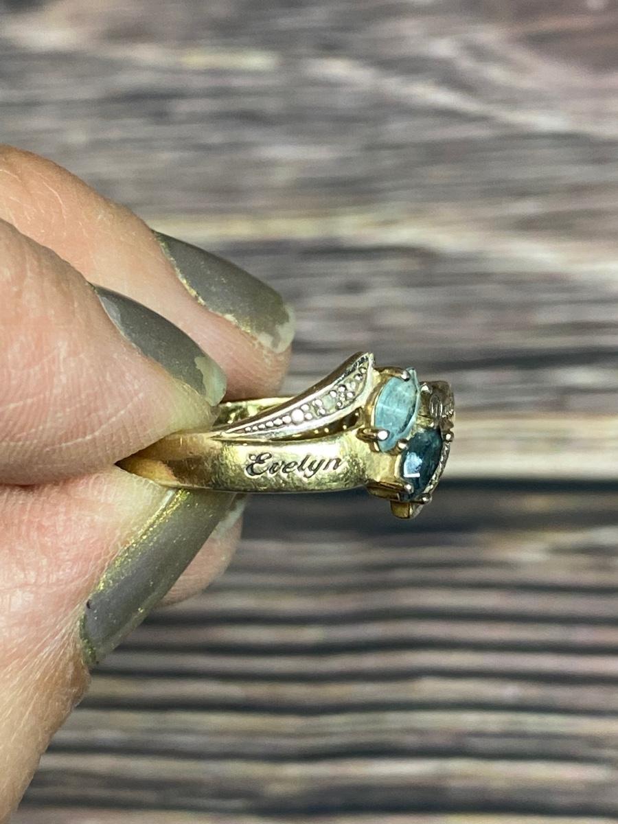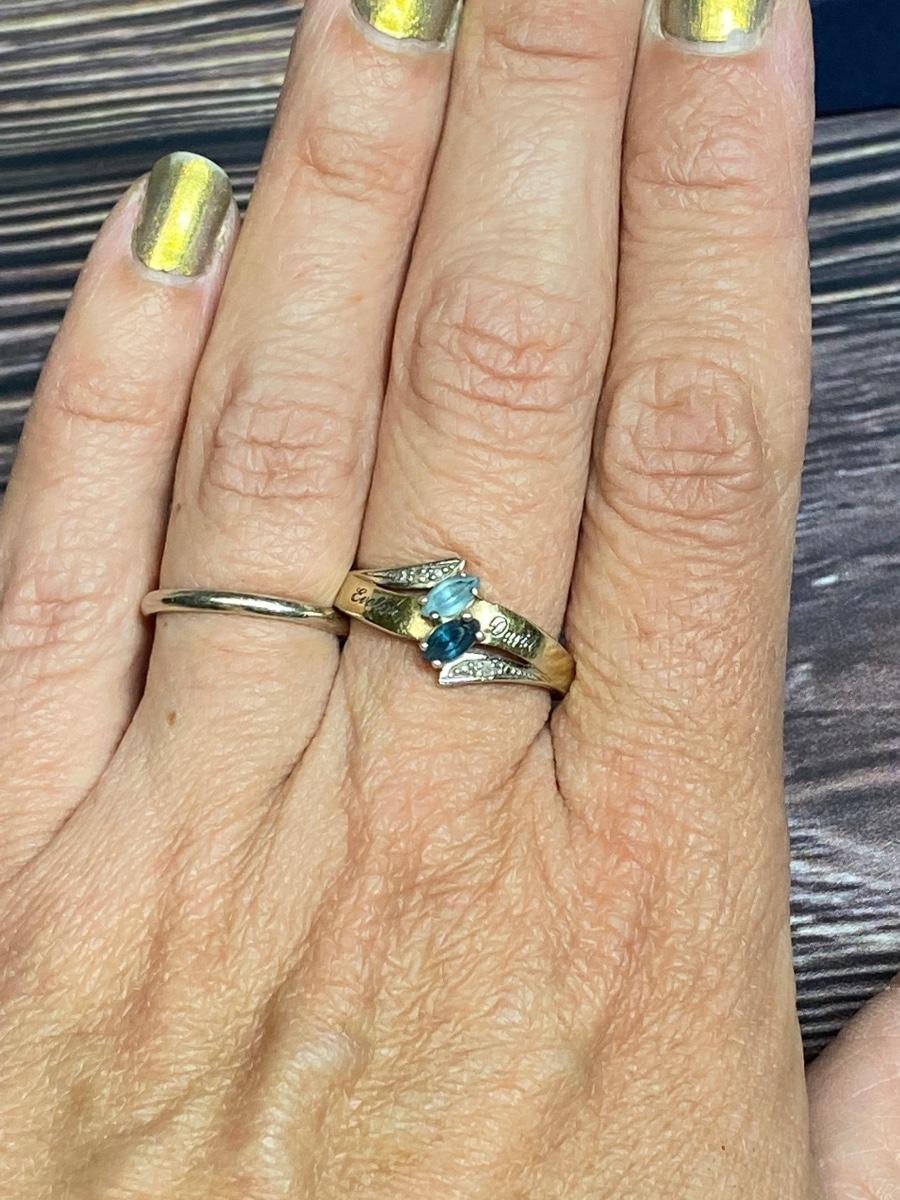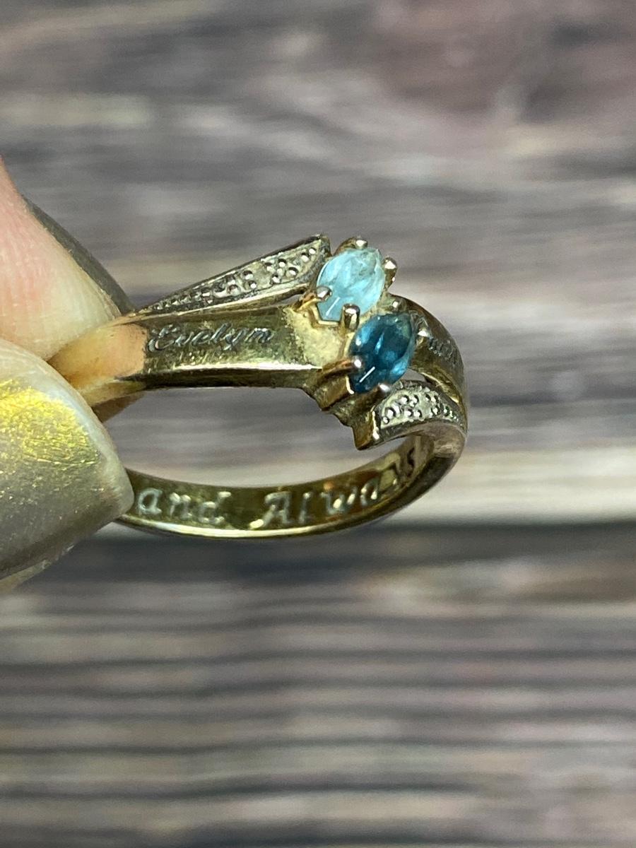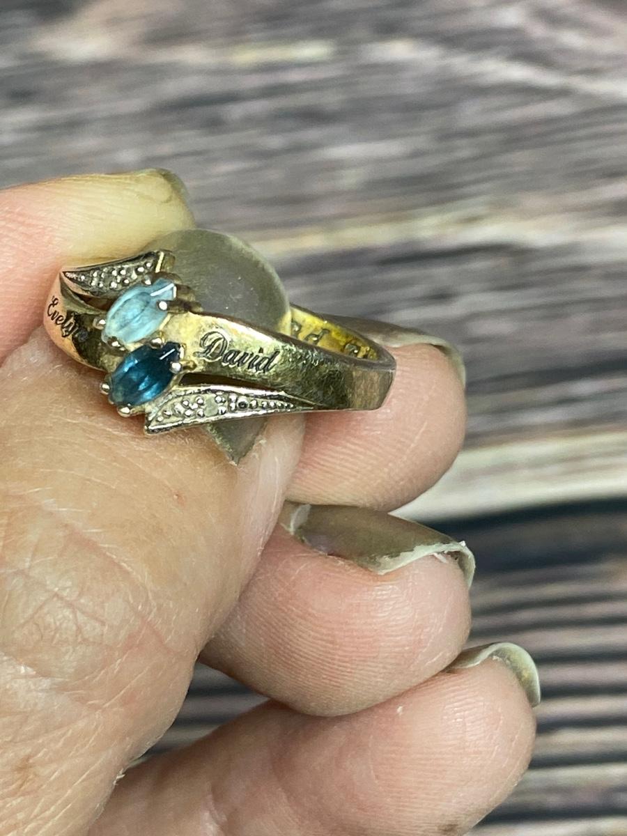 Bradford Exchange Sterling Silver Engraved Couples Ring. Gold tone sterling silver, Previous owners names are etched in the top "Evelyn & David" inside it is etched Forever and Always. Two Blue gem stones, maybe topaz and sapphire. There is wear to the finish, needs to be cleaned.