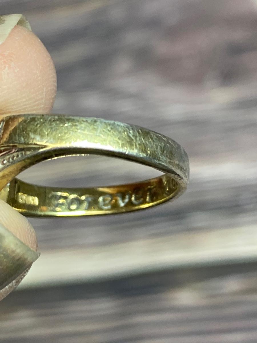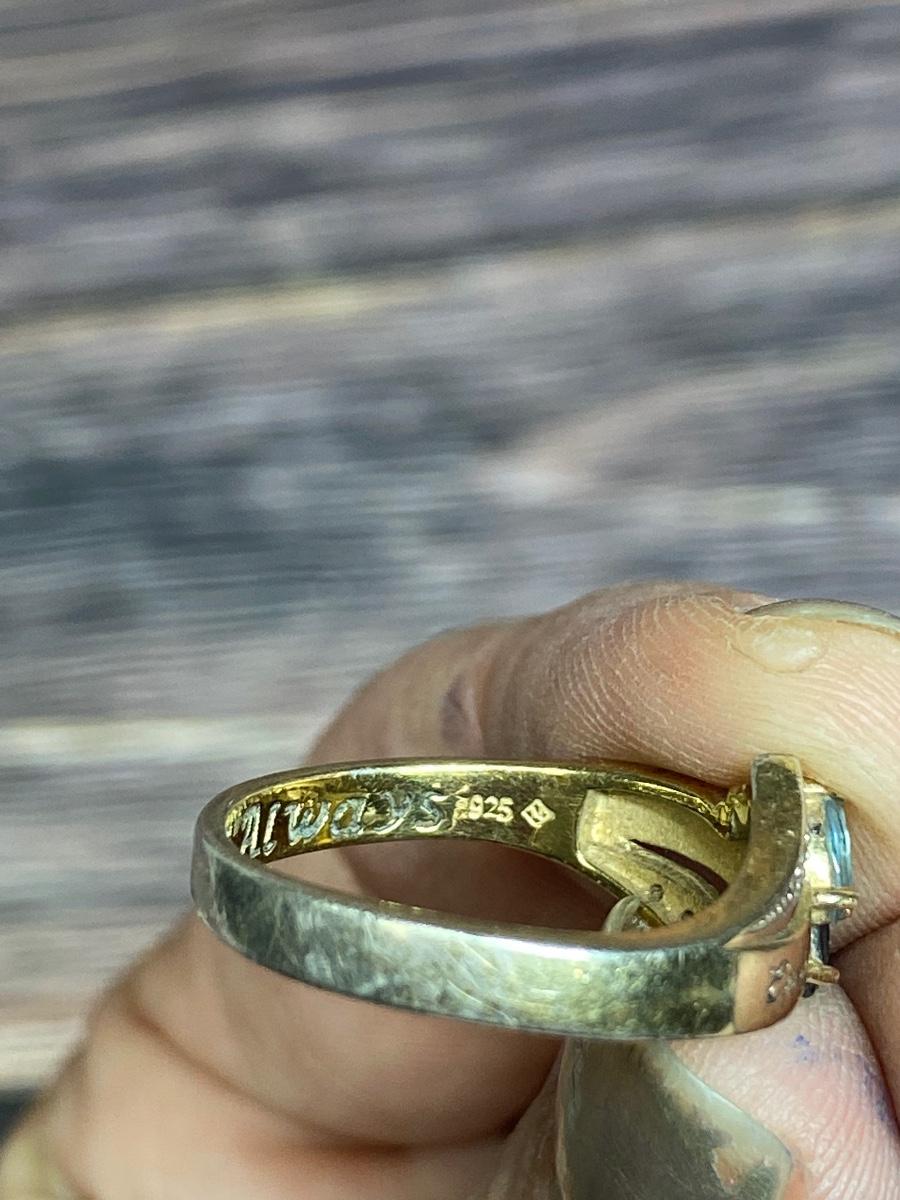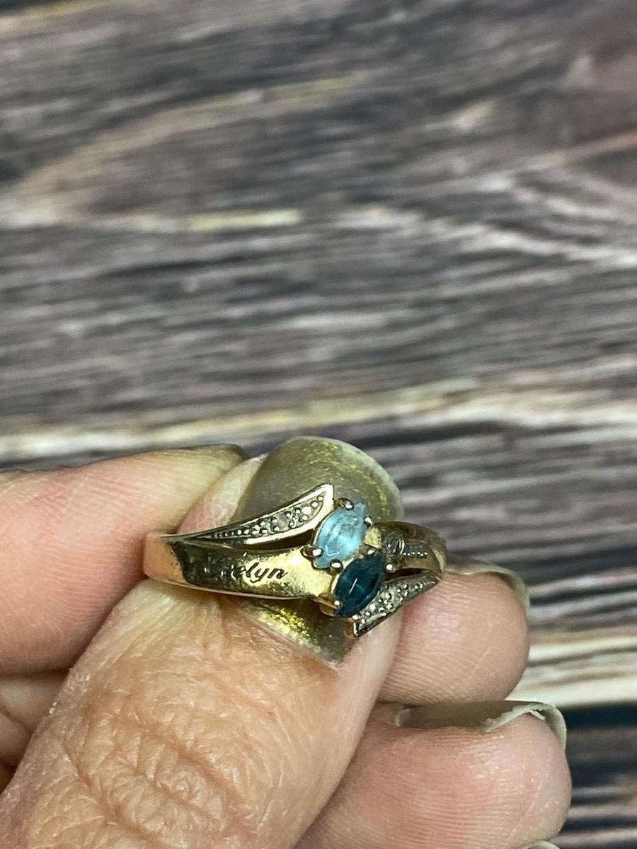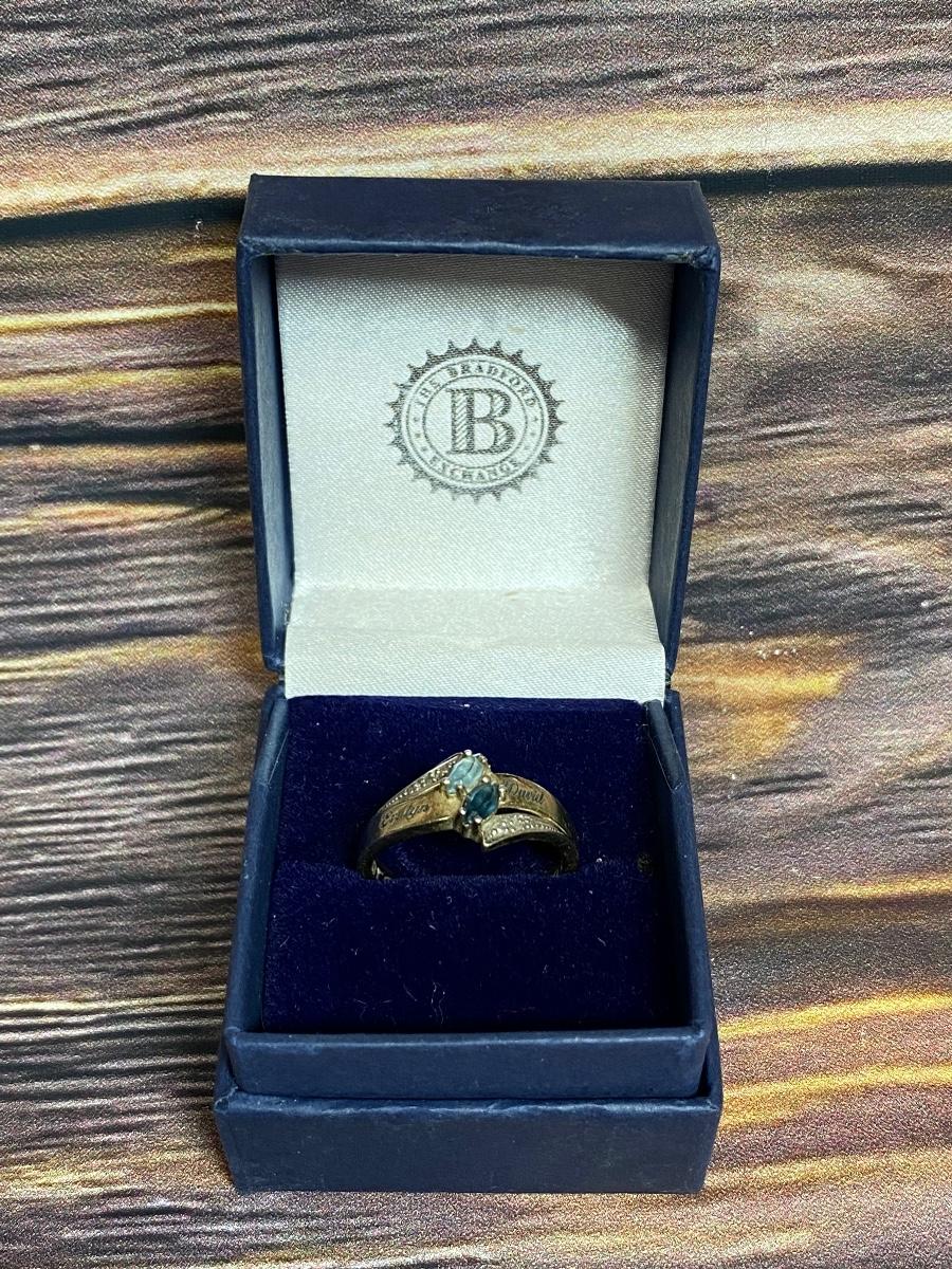 Bradford Exchange Sterling Silver Engraved Couples Ring. Gold tone sterling silver, Previous owners names are etched in the top "Evelyn & David" inside it is etched Forever and Always. Two Blue gem stones, maybe topaz and sapphire. There is wear to the finish, needs to be cleaned.