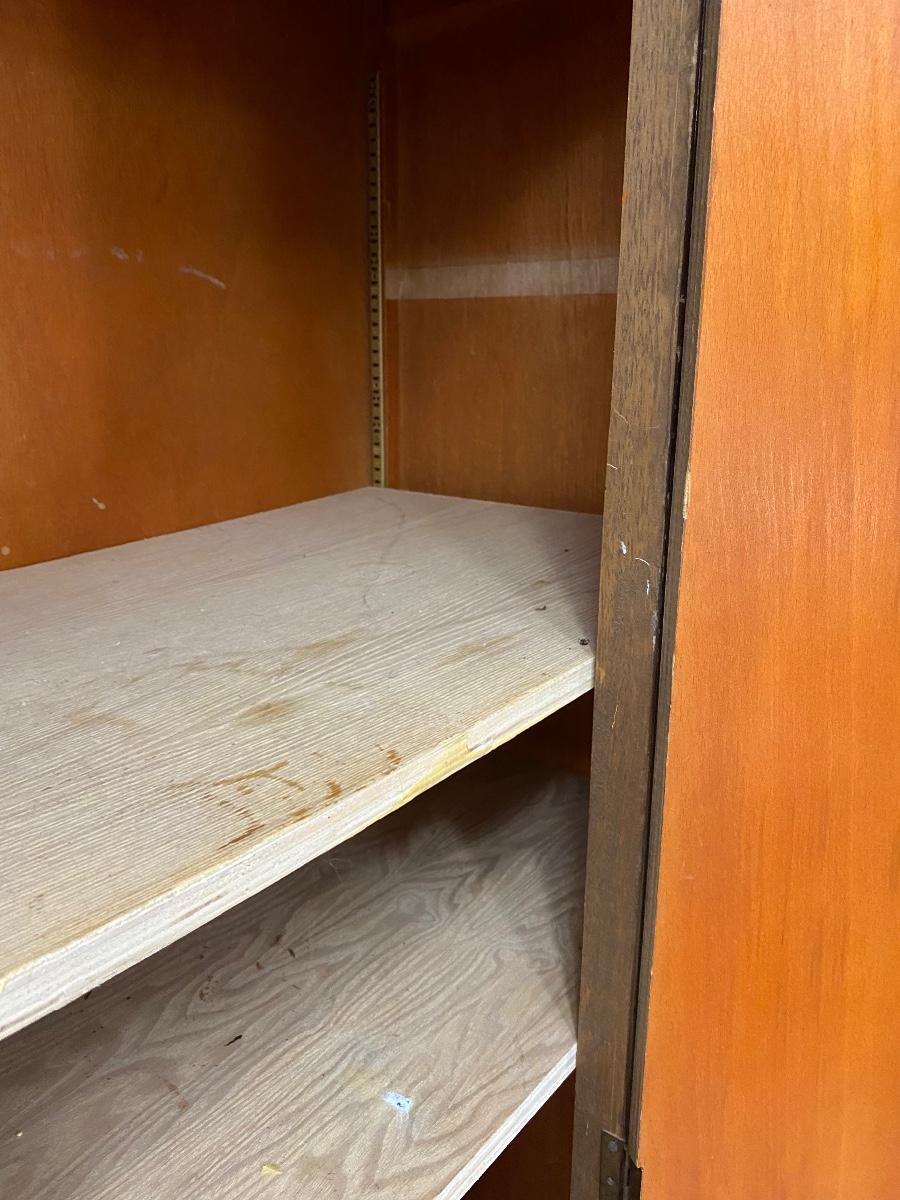 Art Deco walnut veneered wood chifforobe cabinet. Box front door. Adjustable shelving inside are not original. Great wood grain patterns. About 3' to 4' wide and 6' tall. LOCAL PICK UP IN FULLERTON.