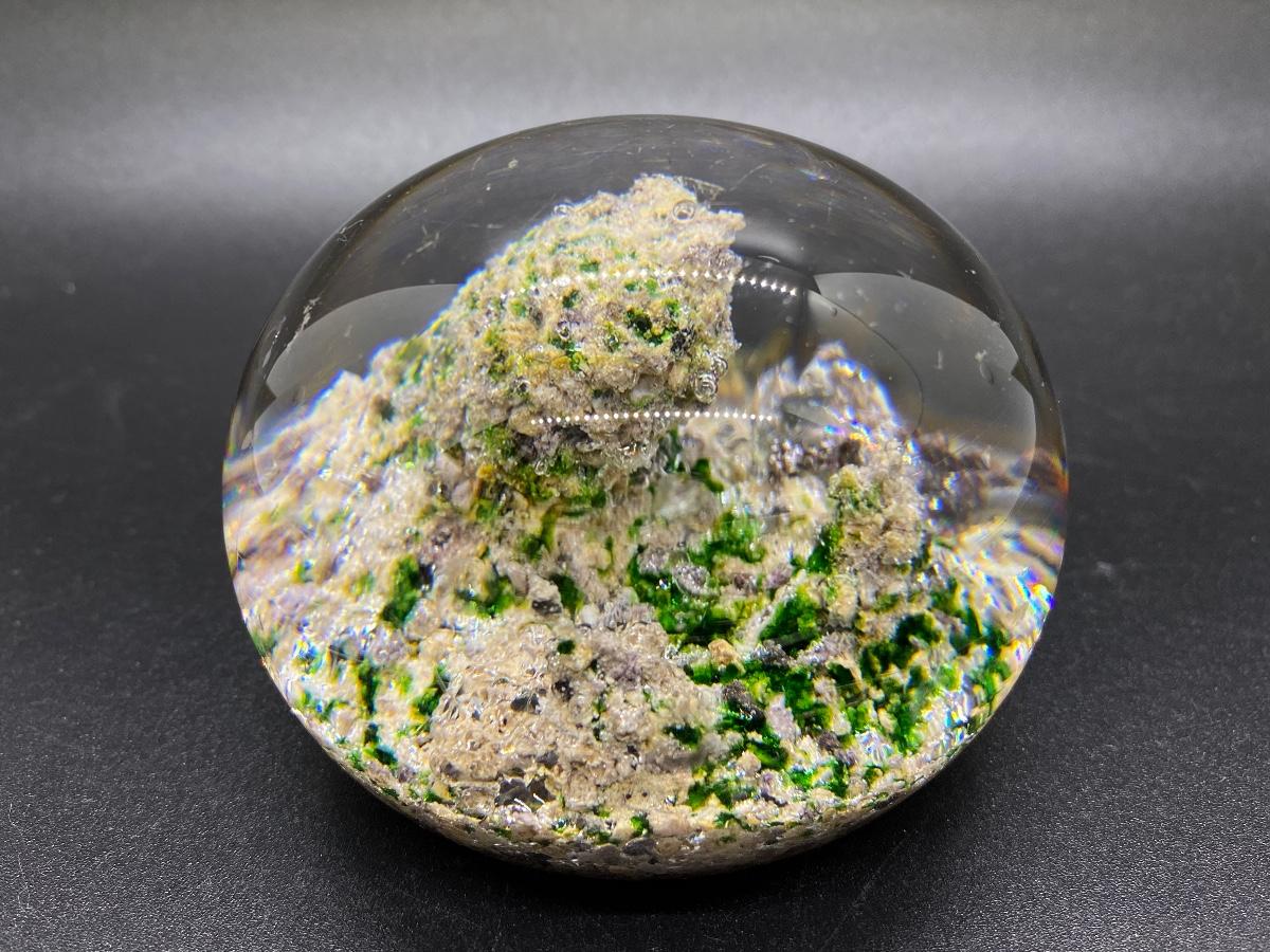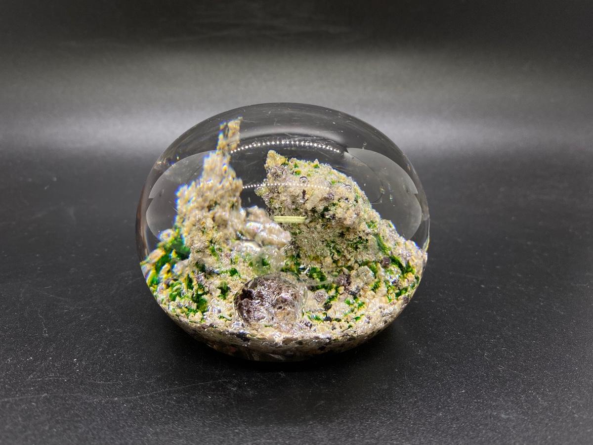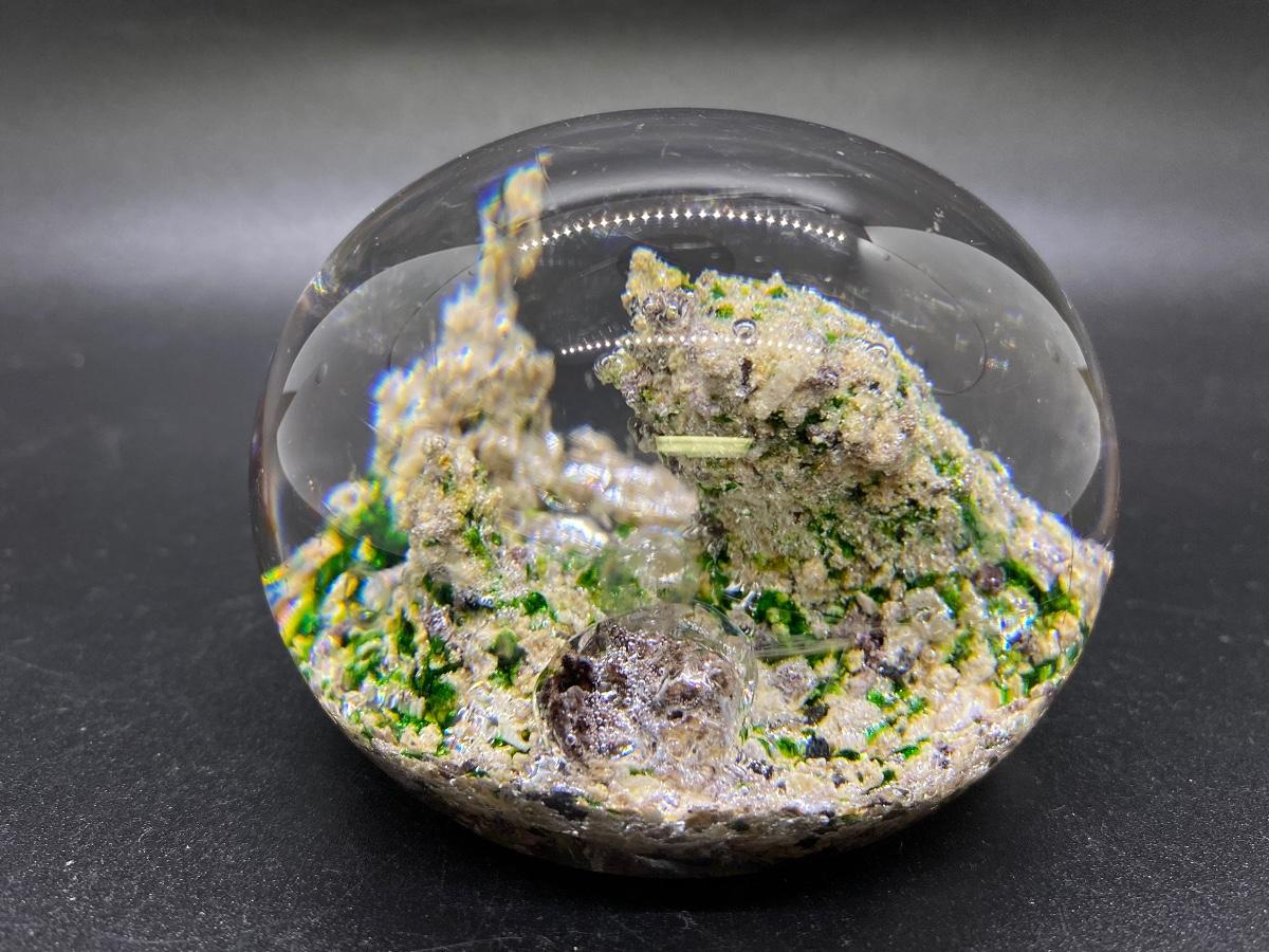 Interesting glass orb paperweight. Not sure what is inside, looks like rock with moss or something similar. A couple scratches and dings, but no major damage. About 3" size.