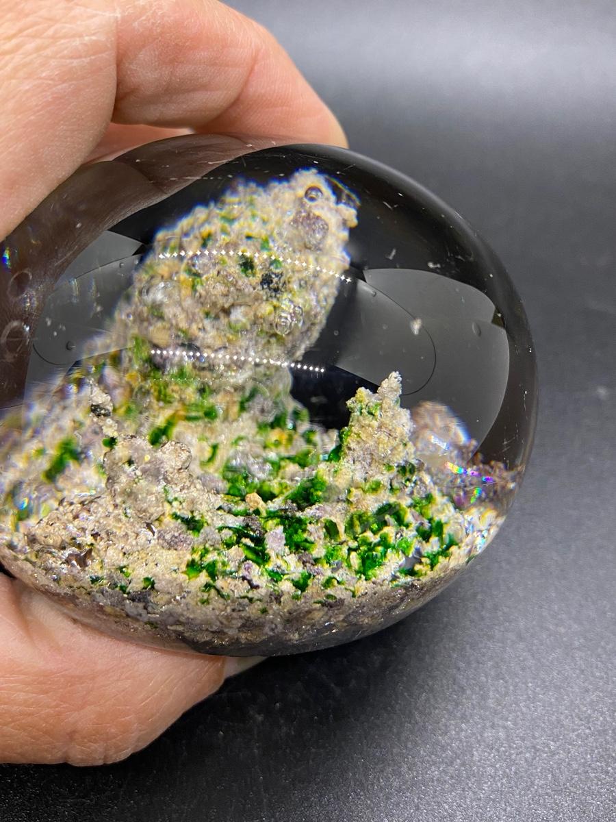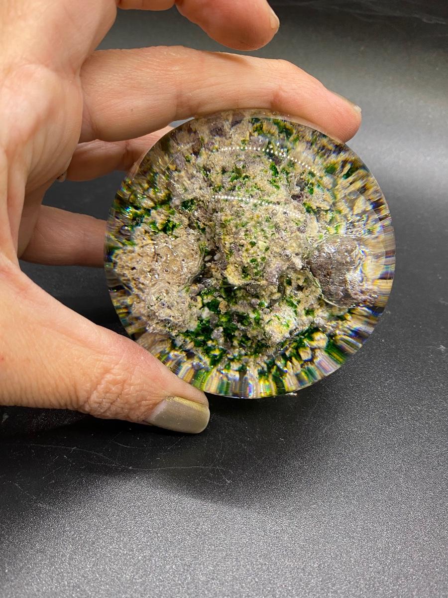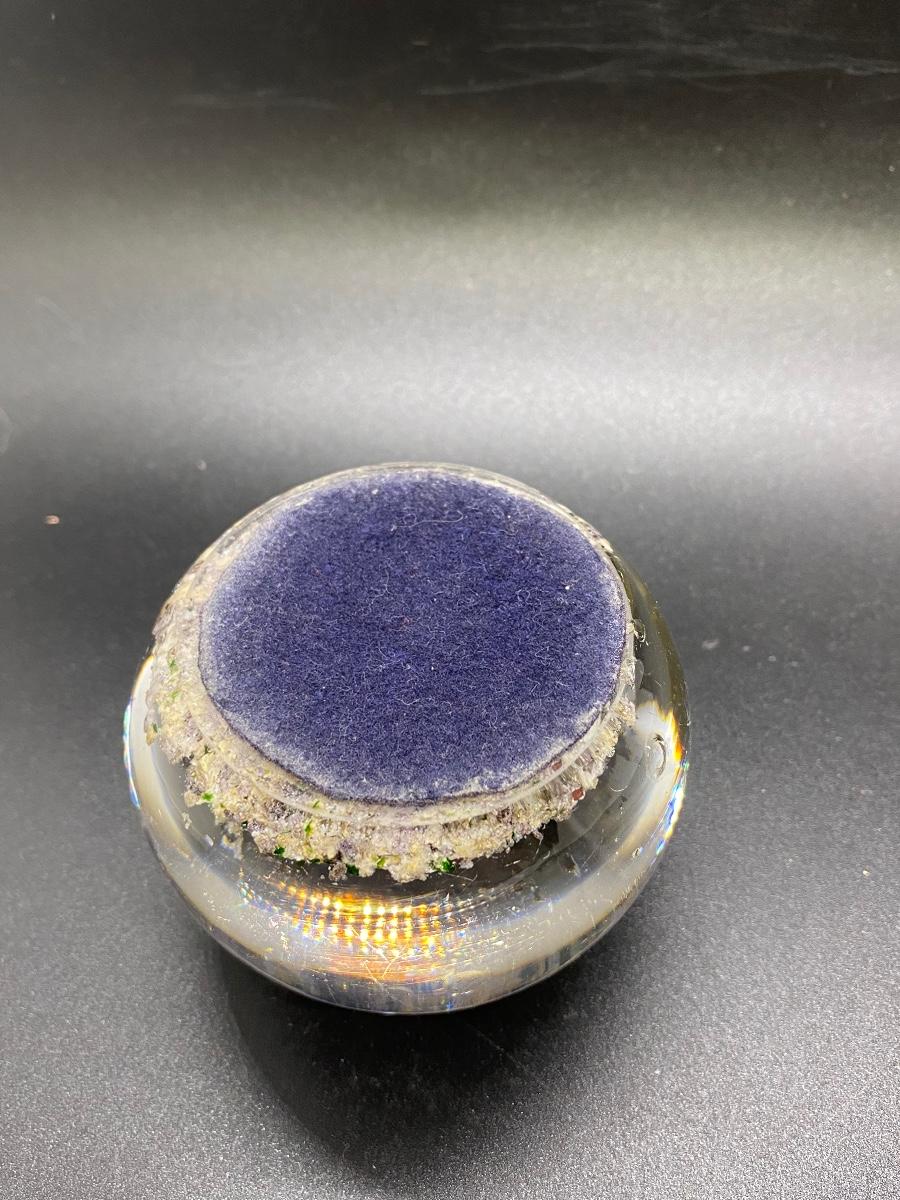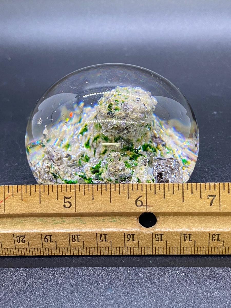 Interesting glass orb paperweight. Not sure what is inside, looks like rock with moss or something similar. A couple scratches and dings, but no major damage. About 3" size.
