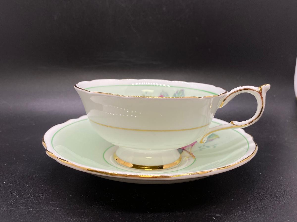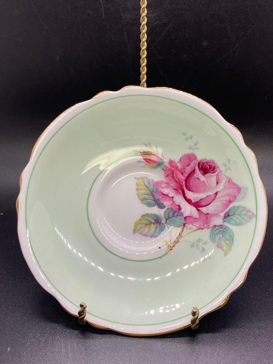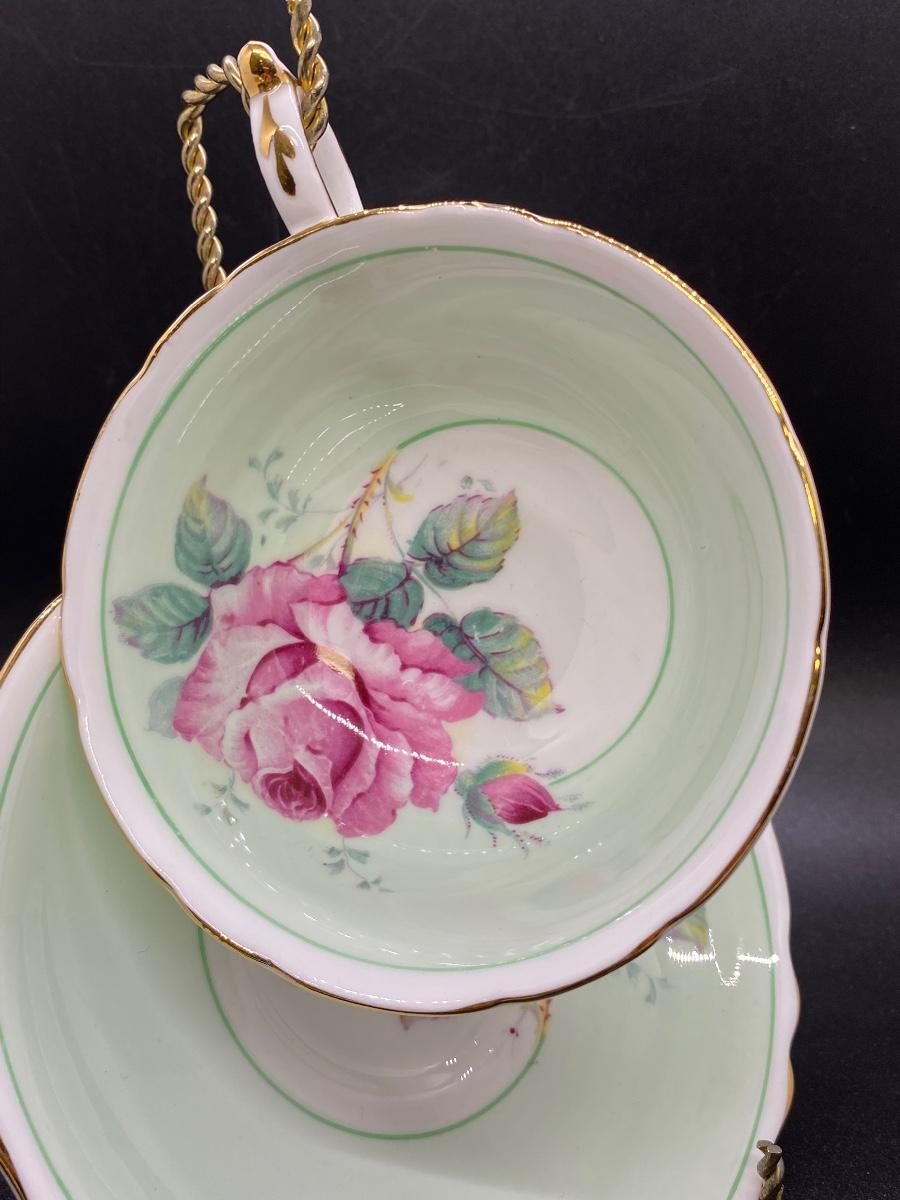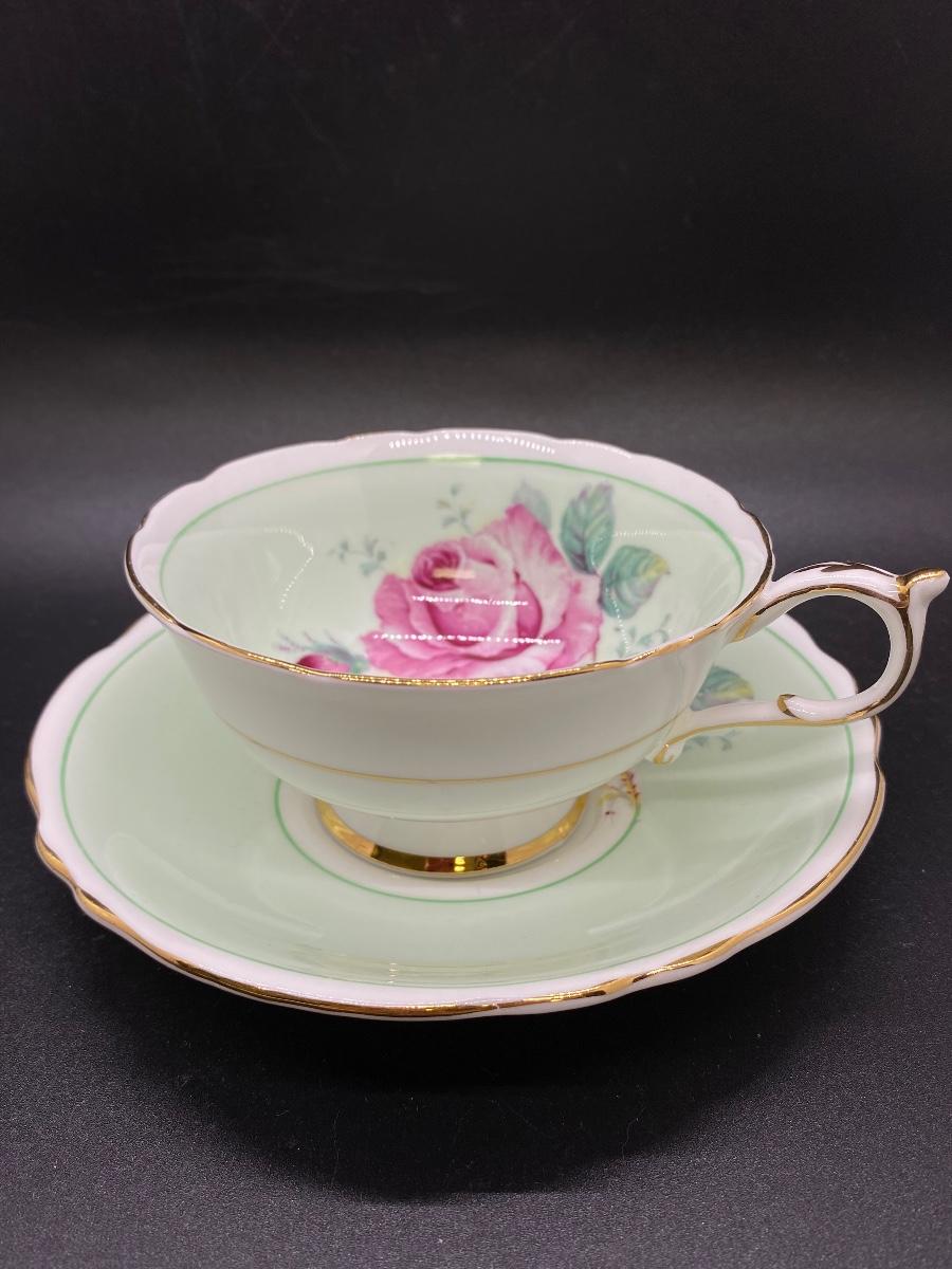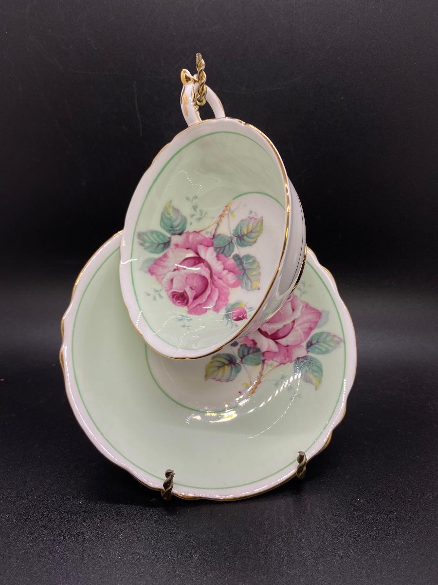 Pale Green w Pink Rose Paragon Teacup & Saucer