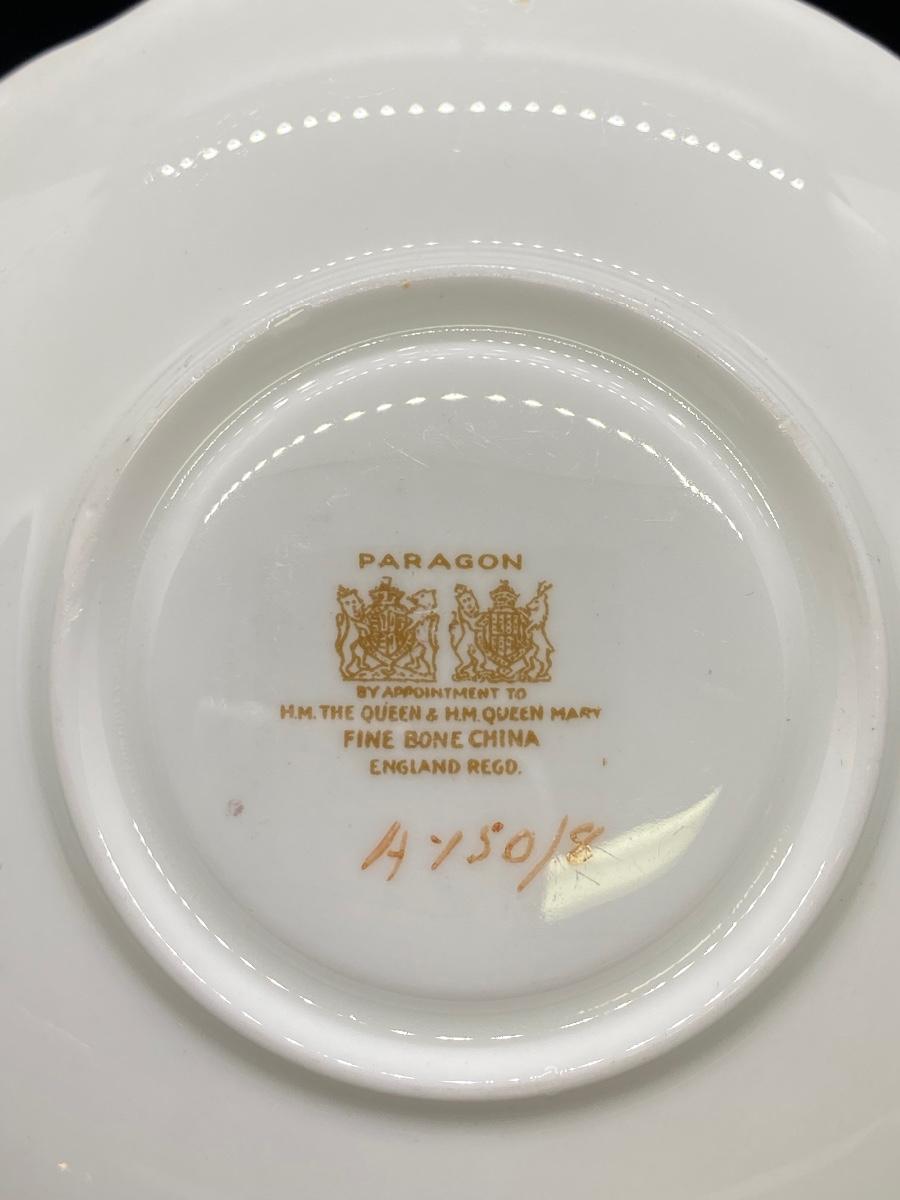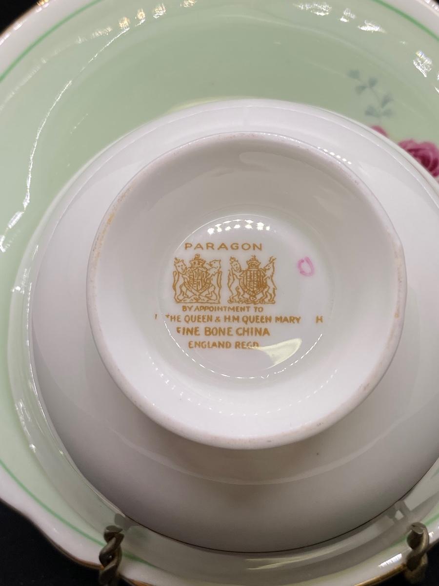 Beautiful pale green band with large pink rose Paragon teacup & saucer set. Gold rim and details. In good condition, no damage, little to no wear to pattern. Brown Paragon mark on the bottom.