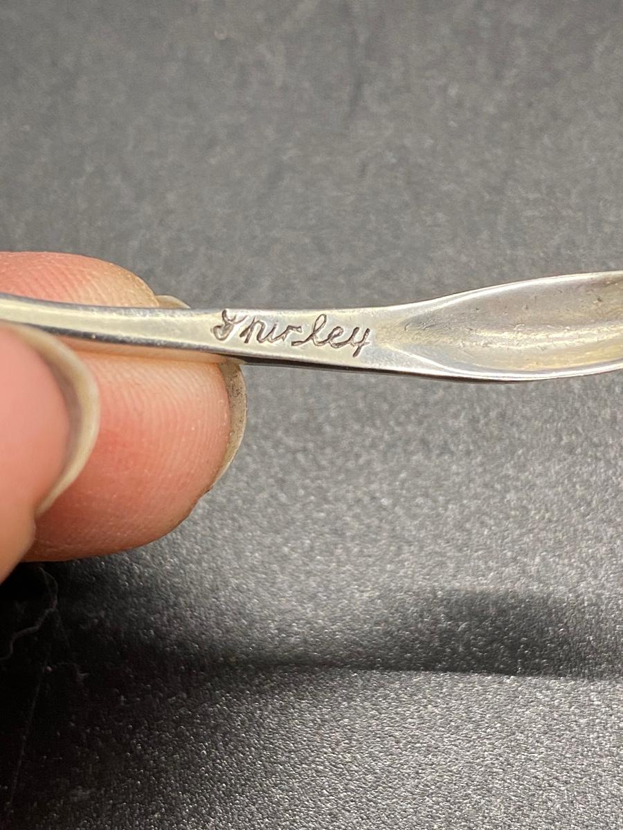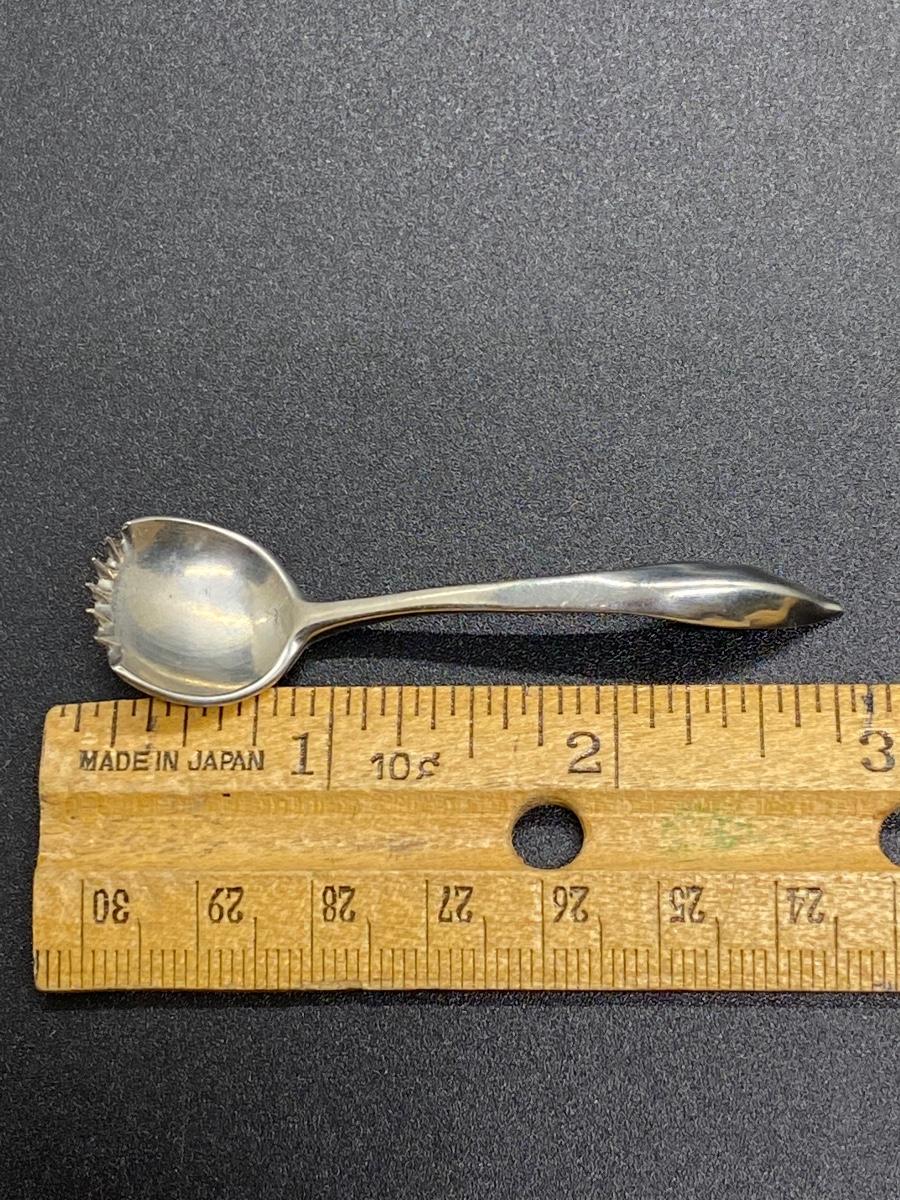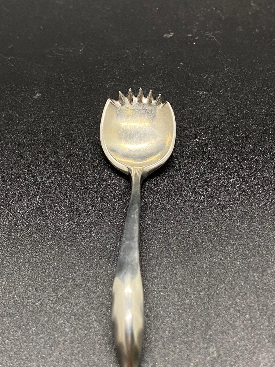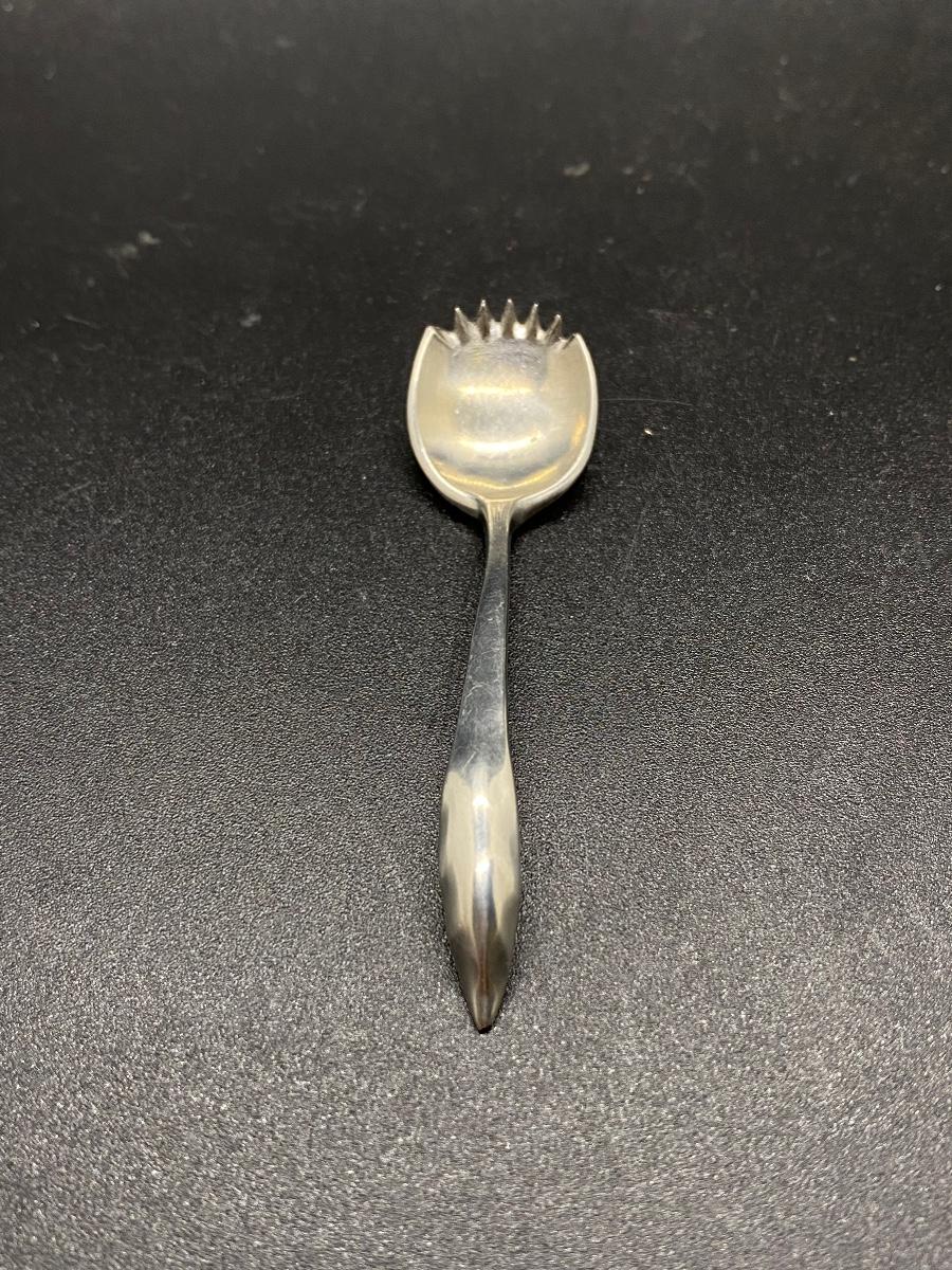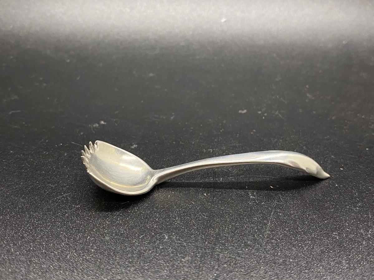 Vintage Silver Salt Spork Spoon. Not sure why it is a spork, being salt spoon size. Engraved with a name on handle back, but can not make it out. No sterling marks. Under 3" size.