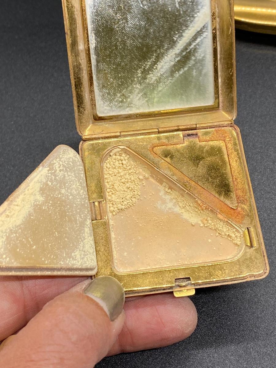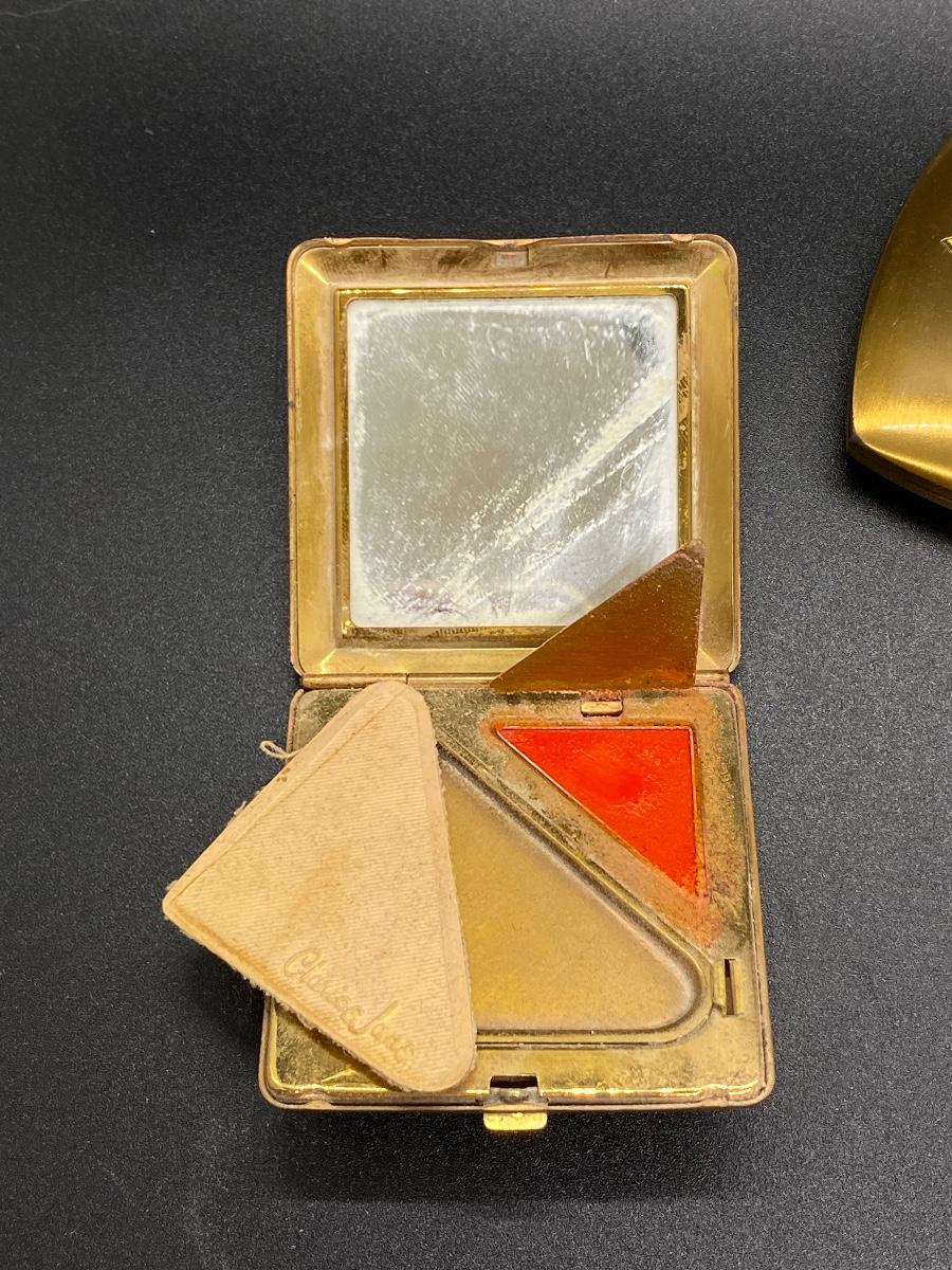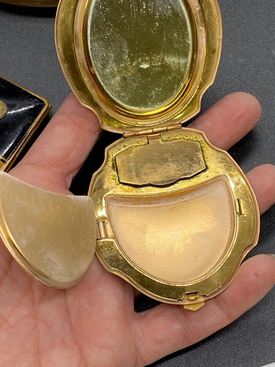 Set of 3 vintage makeup compacts. Two are powder & lipstick/rogue compacts with makeup in them. All are in used conditions, need to be cleaned a little.