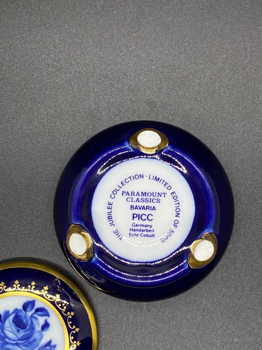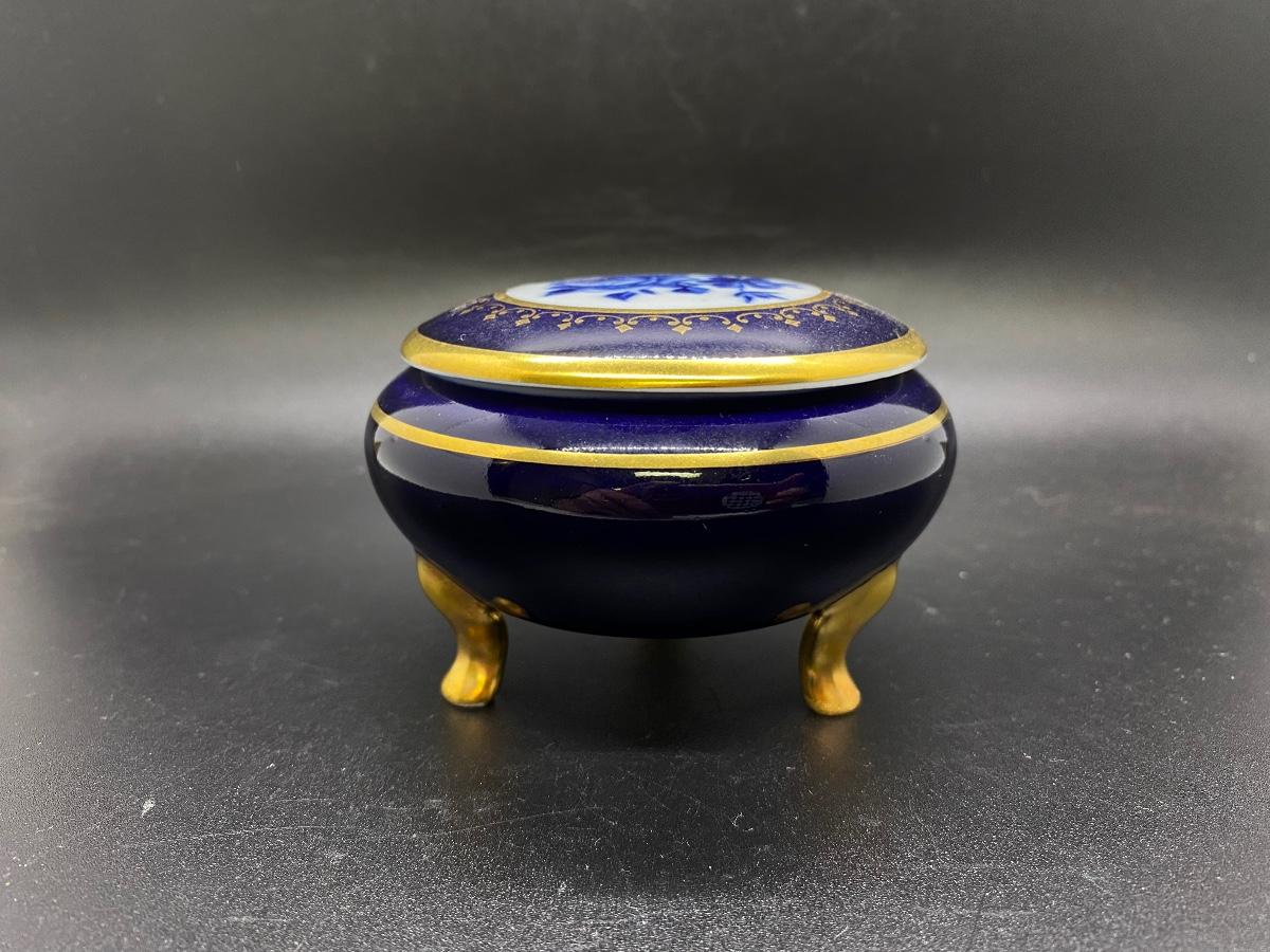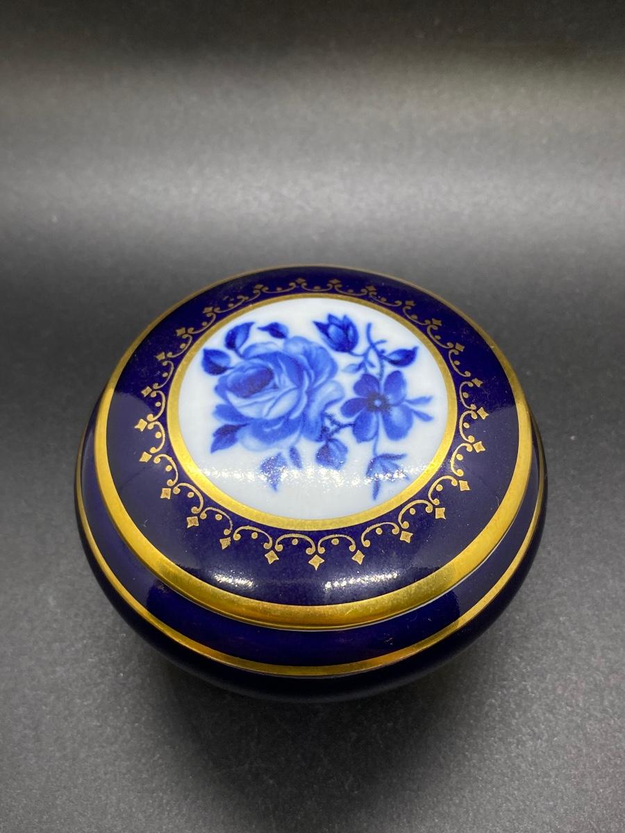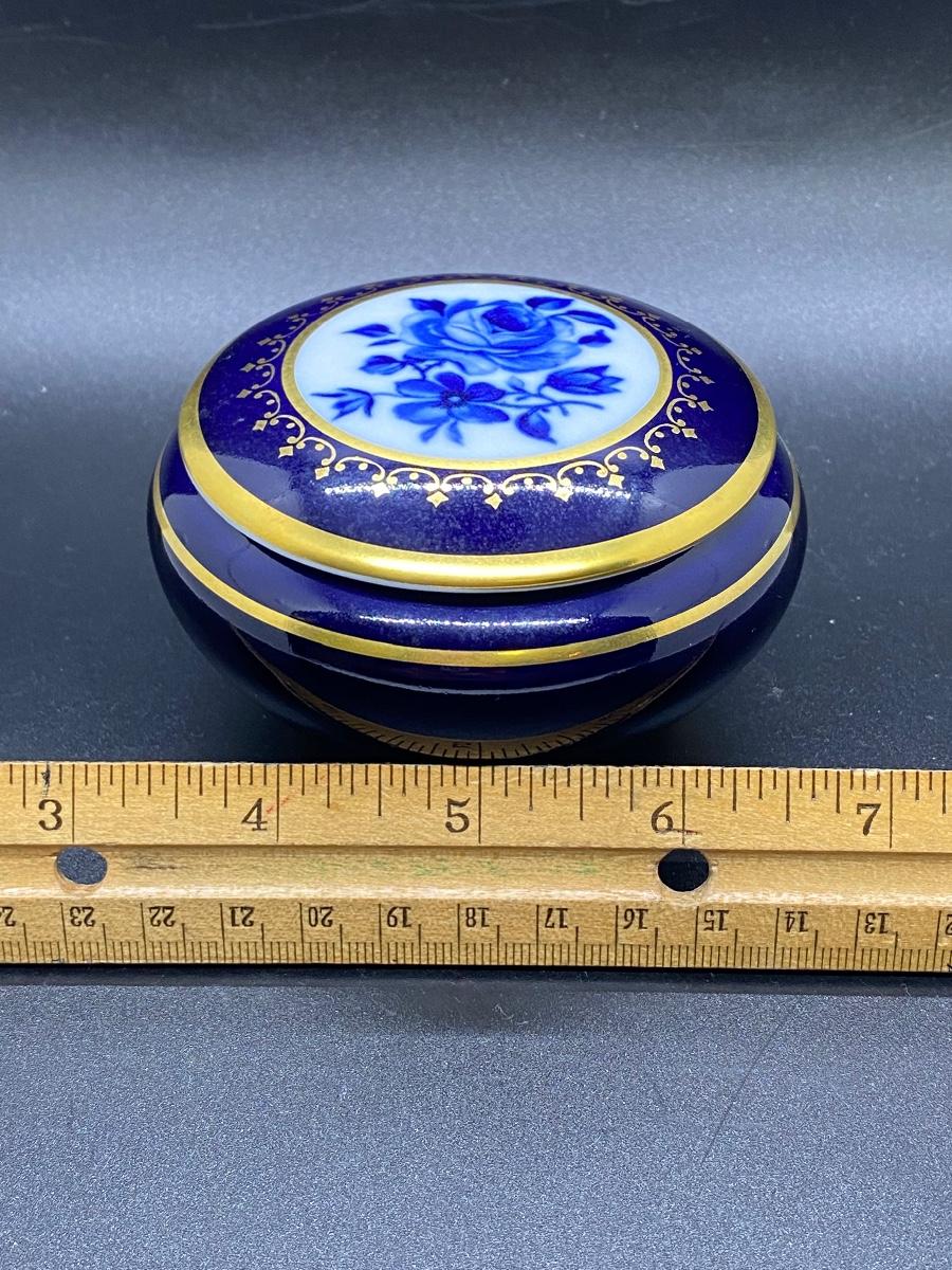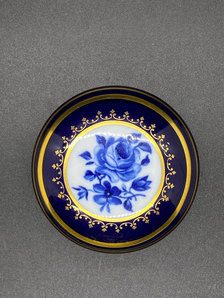 The Jubilee Collection footed trinket dish. Cobalt with painted rose top, gold accents. Made by Paramount Classics Bavaria. About 2" size.