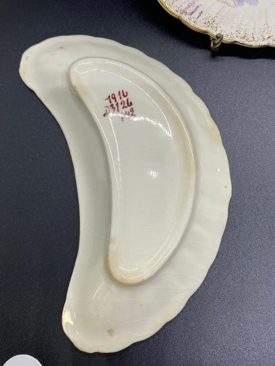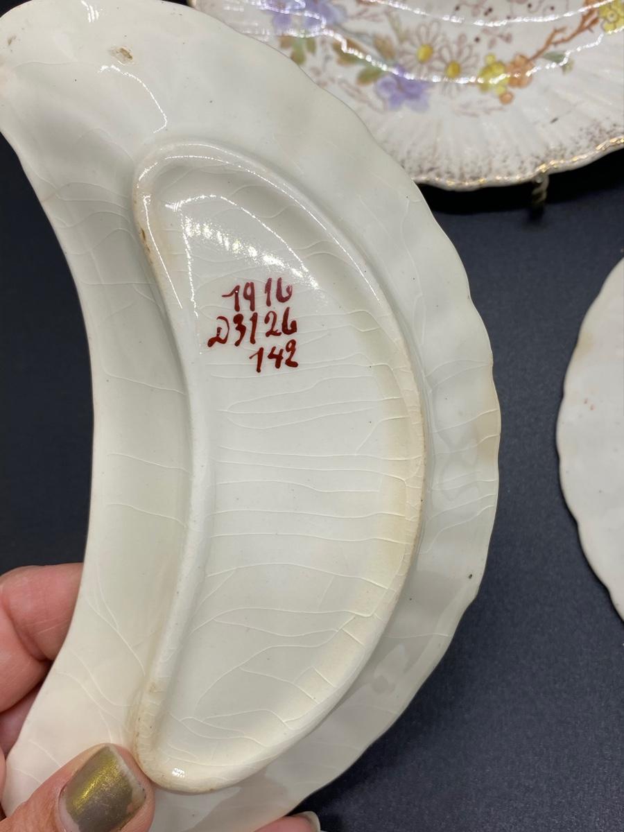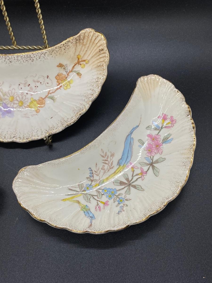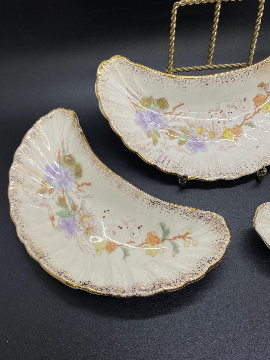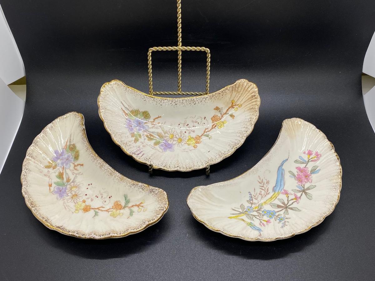 Set of 3 Antique China Crescent Bone Plates. Floral patterns, two are matching. Signs of age, crazing and discolor. Numbers on the bottoms but no maker name.