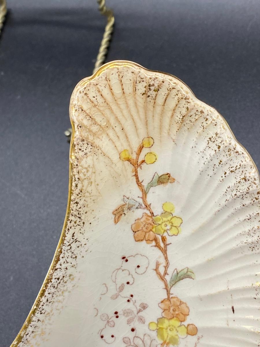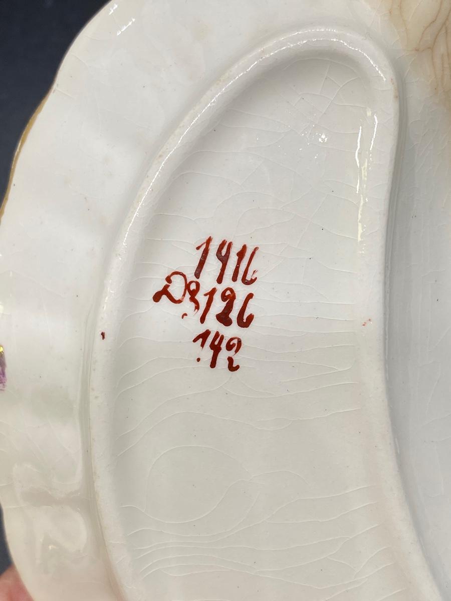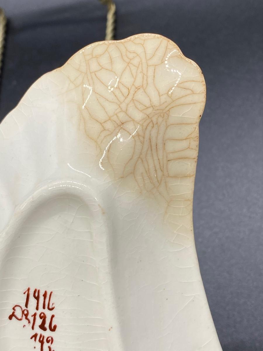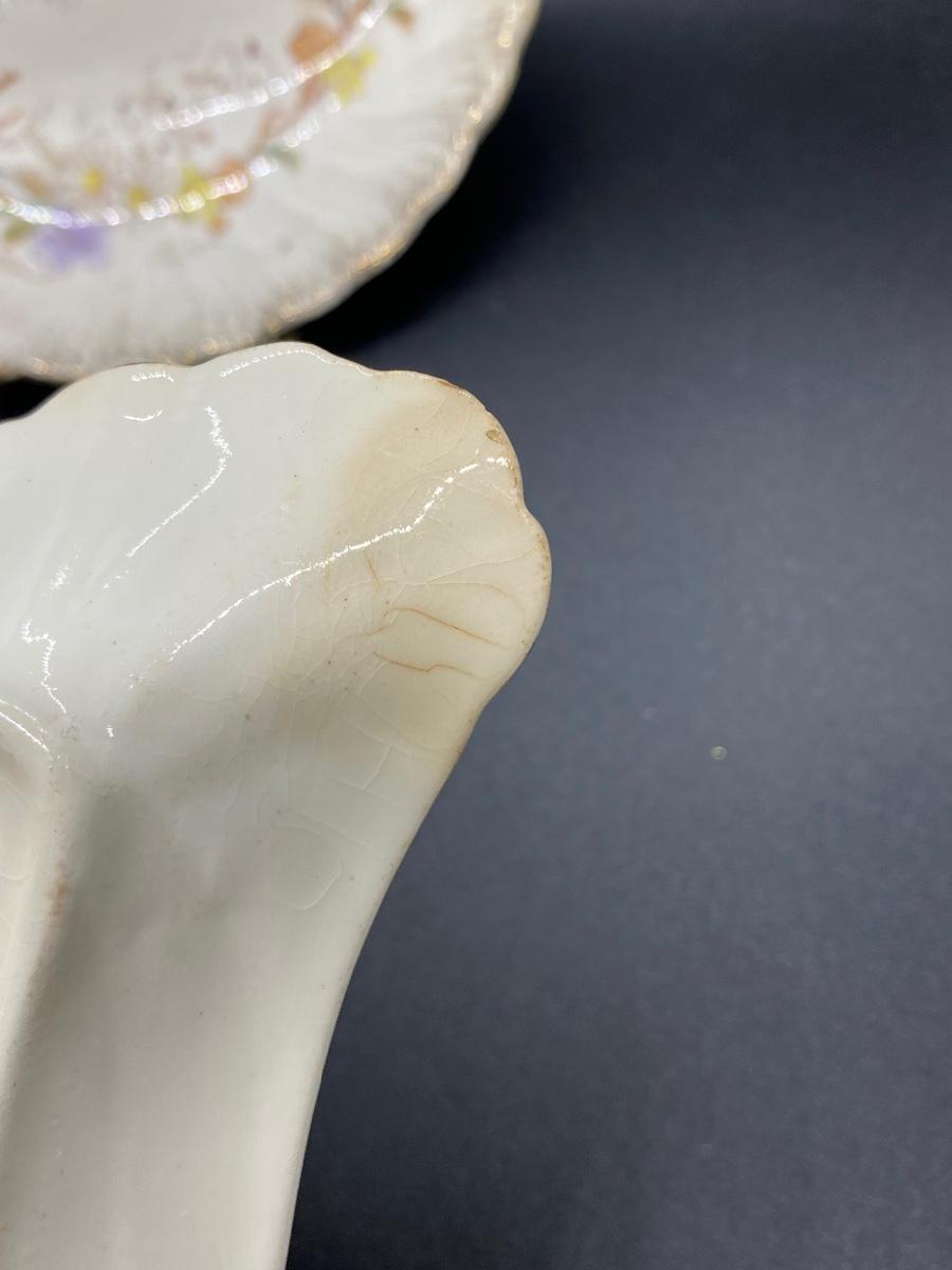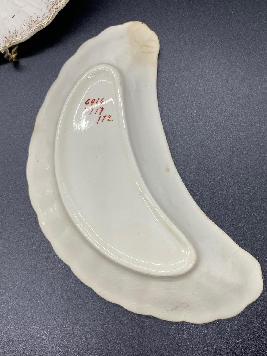 Set of 3 Antique China Crescent Bone Plates. Floral patterns, two are matching. Signs of age, crazing and discolor. Numbers on the bottoms but no maker name.