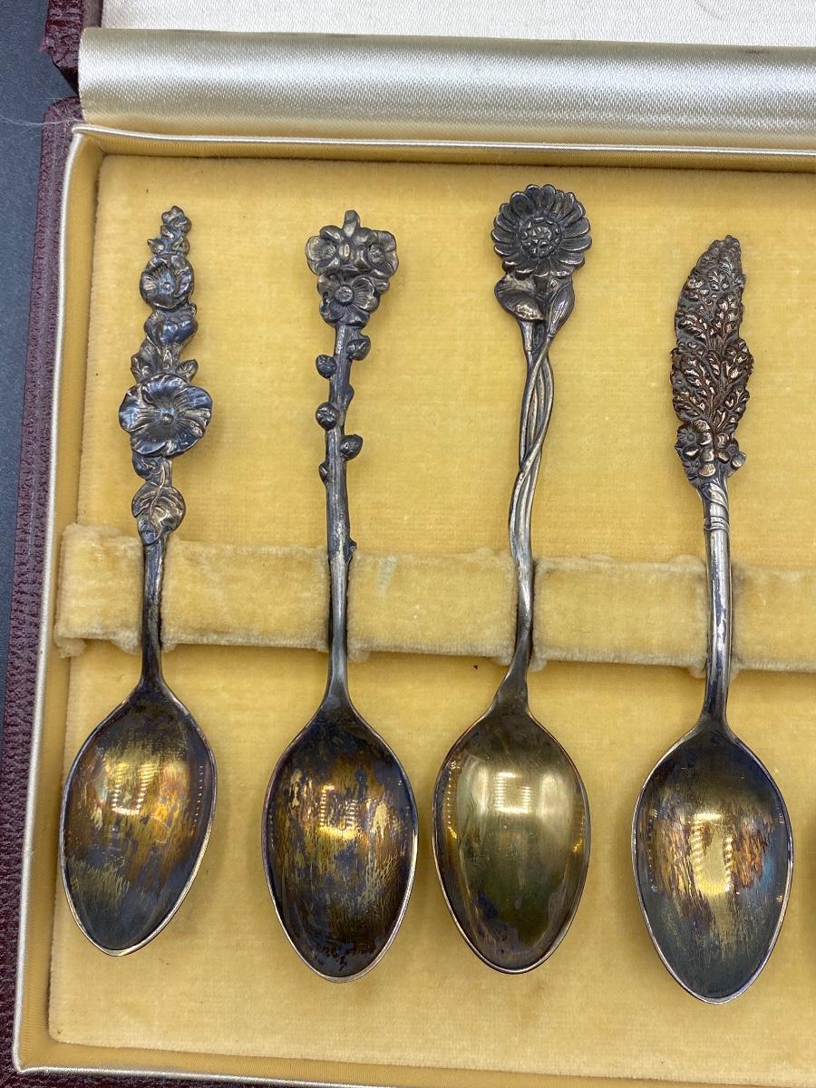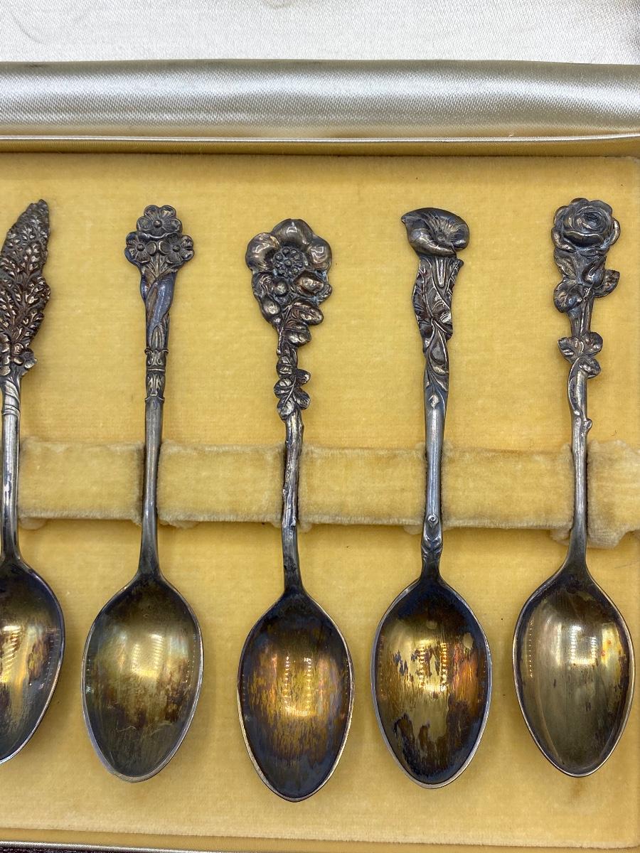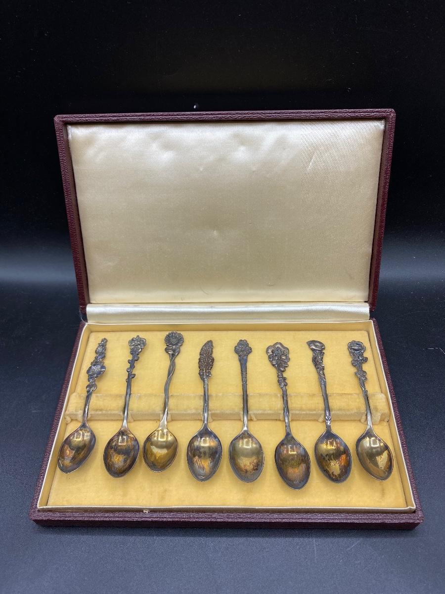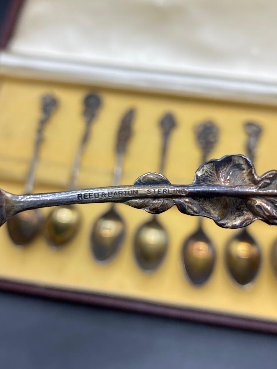 Vintage Reed & Barton sterling silver demitasse spoon set. 8 spoons each one with a different floral handle. All are marked. Come in case. About 4" length spoons.