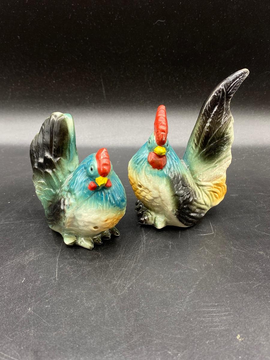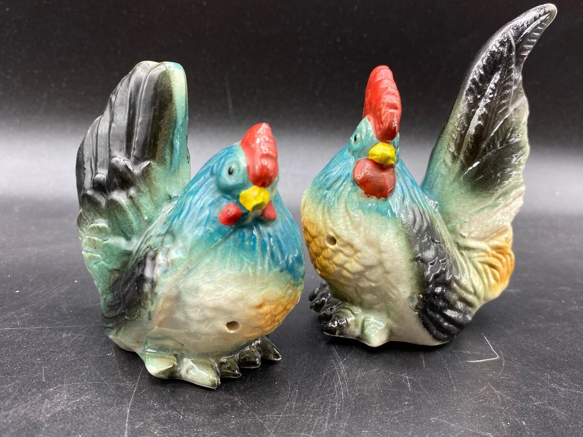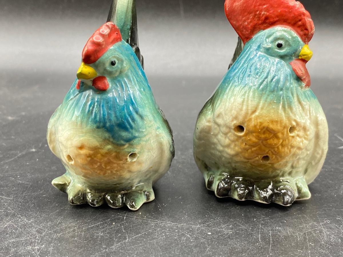 Vintage ceramic chicken salt & pepper shakers. Colorful hen and rooster pair. Corked bottoms. Some paint wear and crazing but damage.
