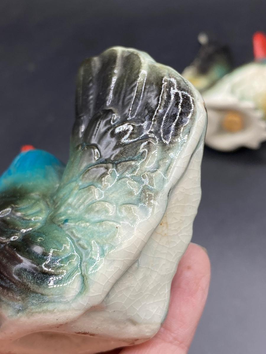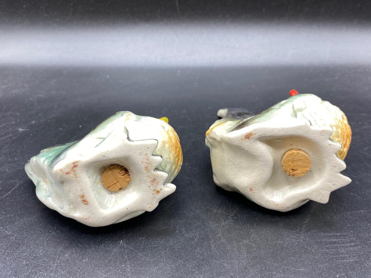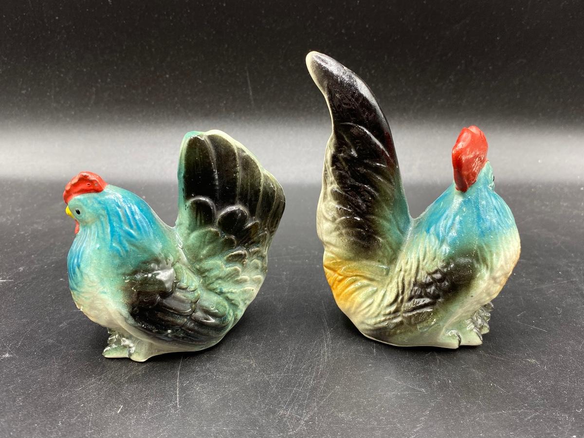 Vintage ceramic chicken salt & pepper shakers. Colorful hen and rooster pair. Corked bottoms. Some paint wear and crazing but damage.