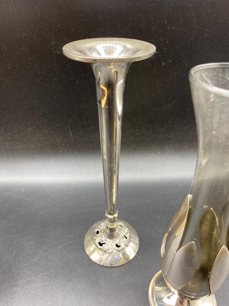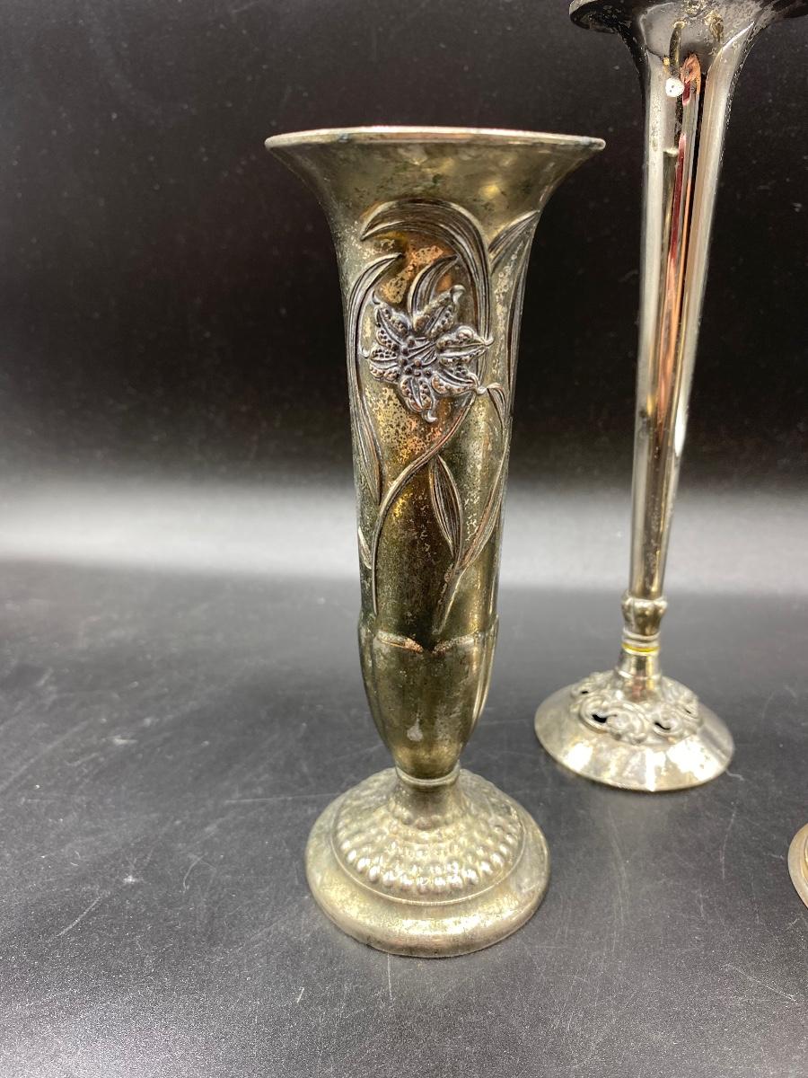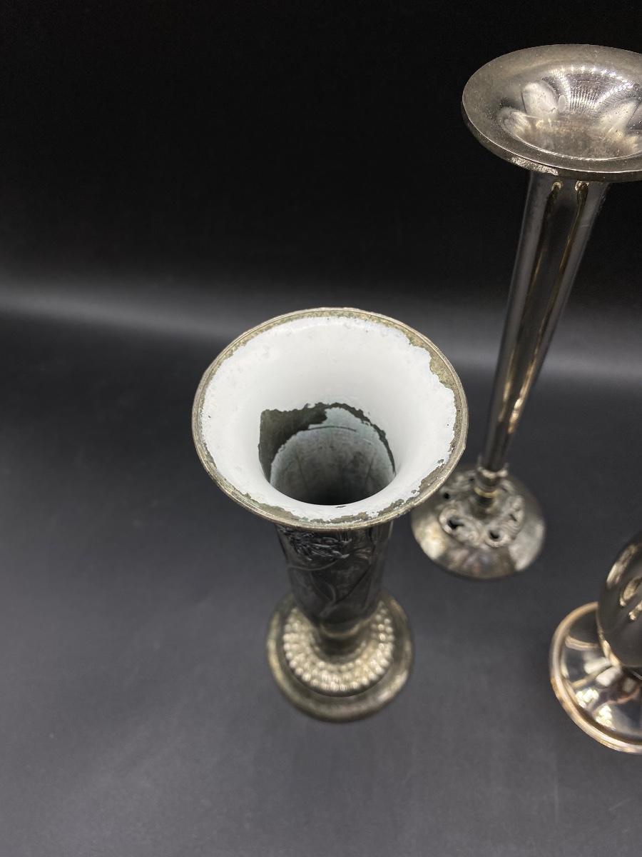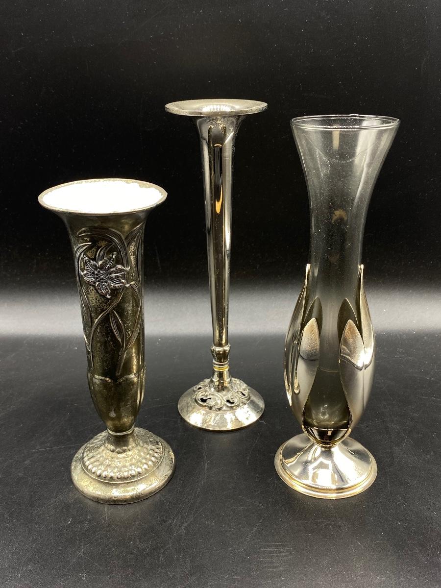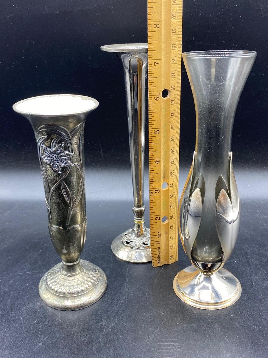 Set of 3 vintage bud vases. Silver plate, Art nouveau style. About 6" to 8" size. Light wear but display great.