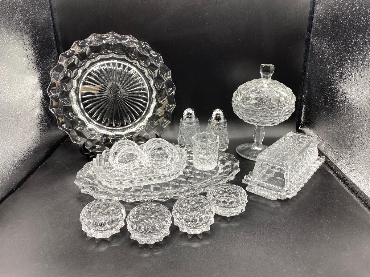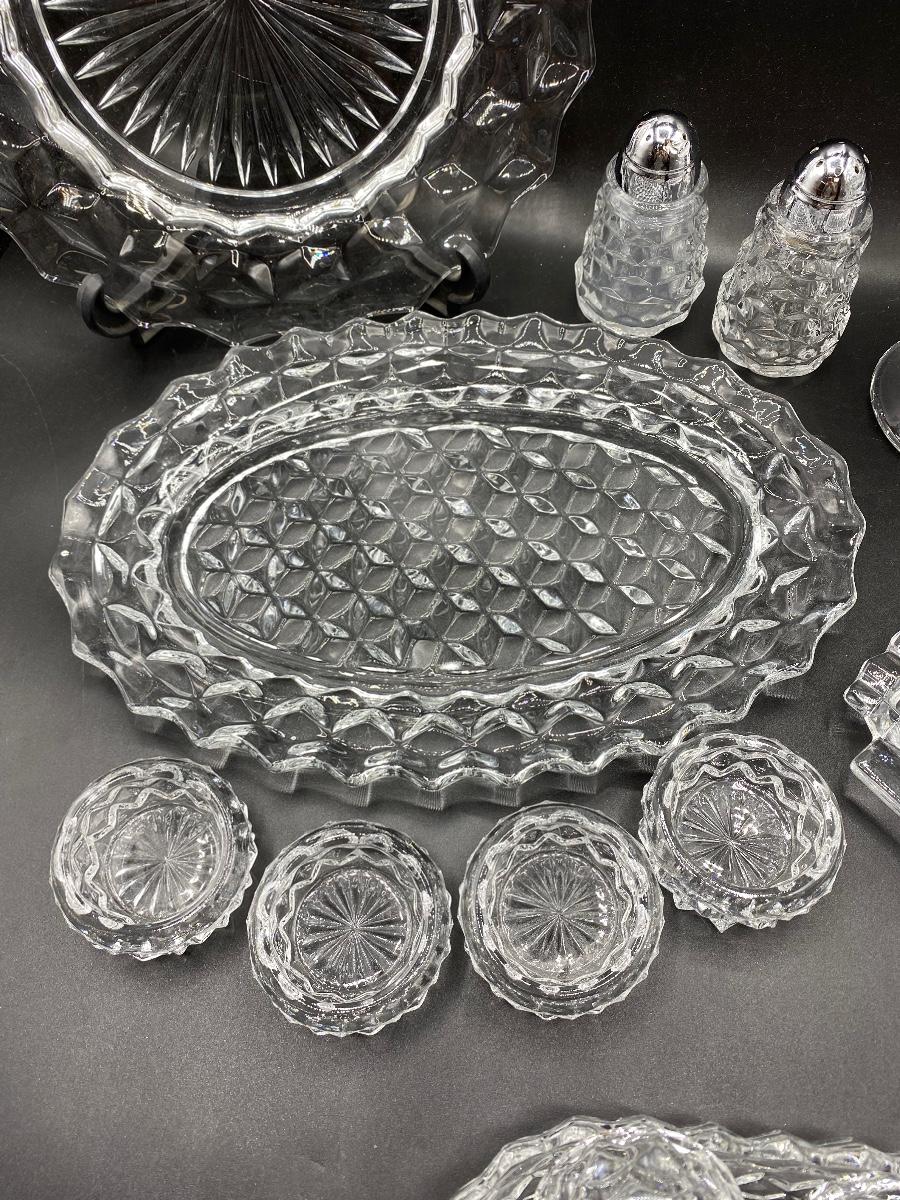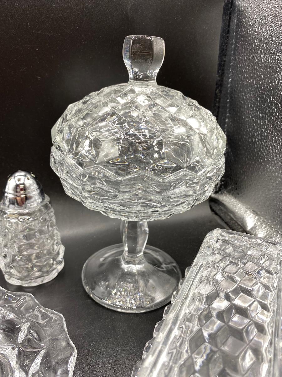 Vintage Fostoria Glass in American pattern tableware lot. Great for any occasion, mix with other dish sets. Includes a round serving plate, oval plate, covered butter dish, shakers, toothpick cup, salt cellars, napkin holders, uncovered butter plate, and small lidded compote/candy dish. No damage noticed on any piece.