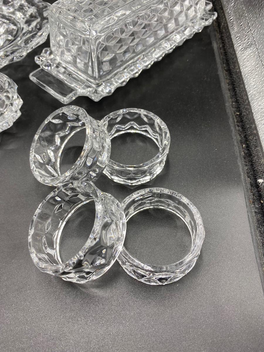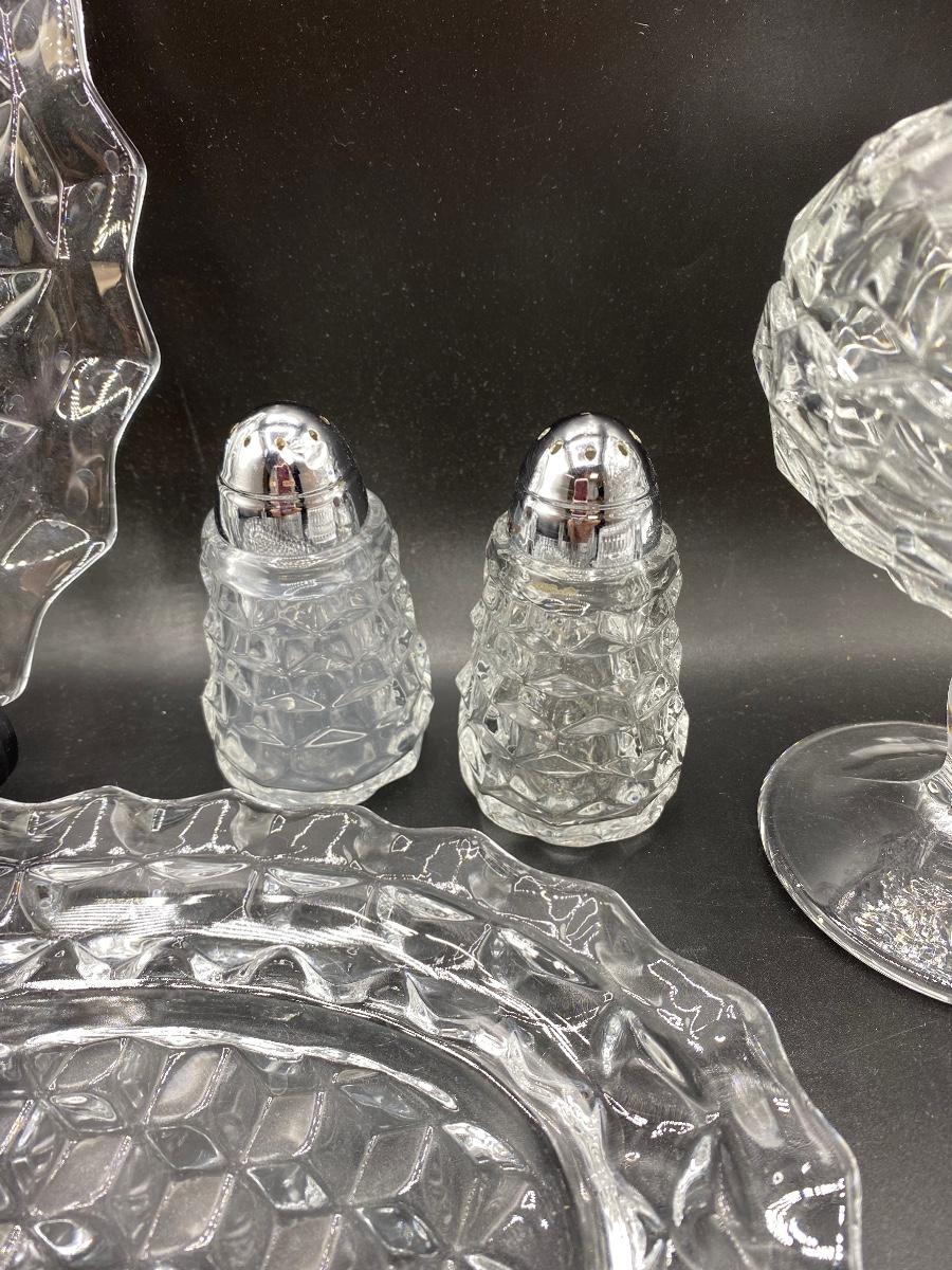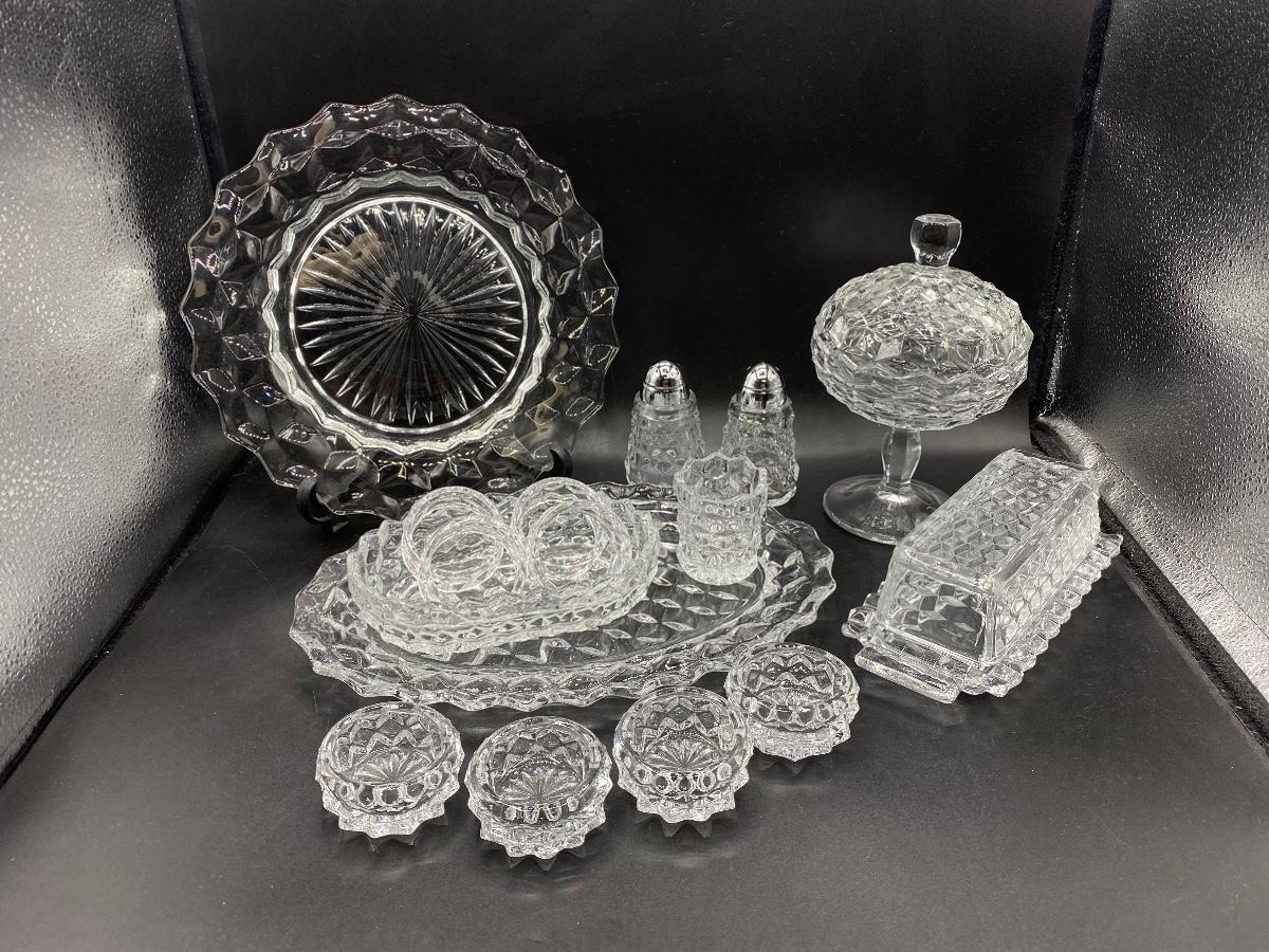 Vintage Fostoria Glass in American pattern tableware lot. Great for any occasion, mix with other dish sets. Includes a round serving plate, oval plate, covered butter dish, shakers, toothpick cup, salt cellars, napkin holders, uncovered butter plate, and small lidded compote/candy dish. No damage noticed on any piece.