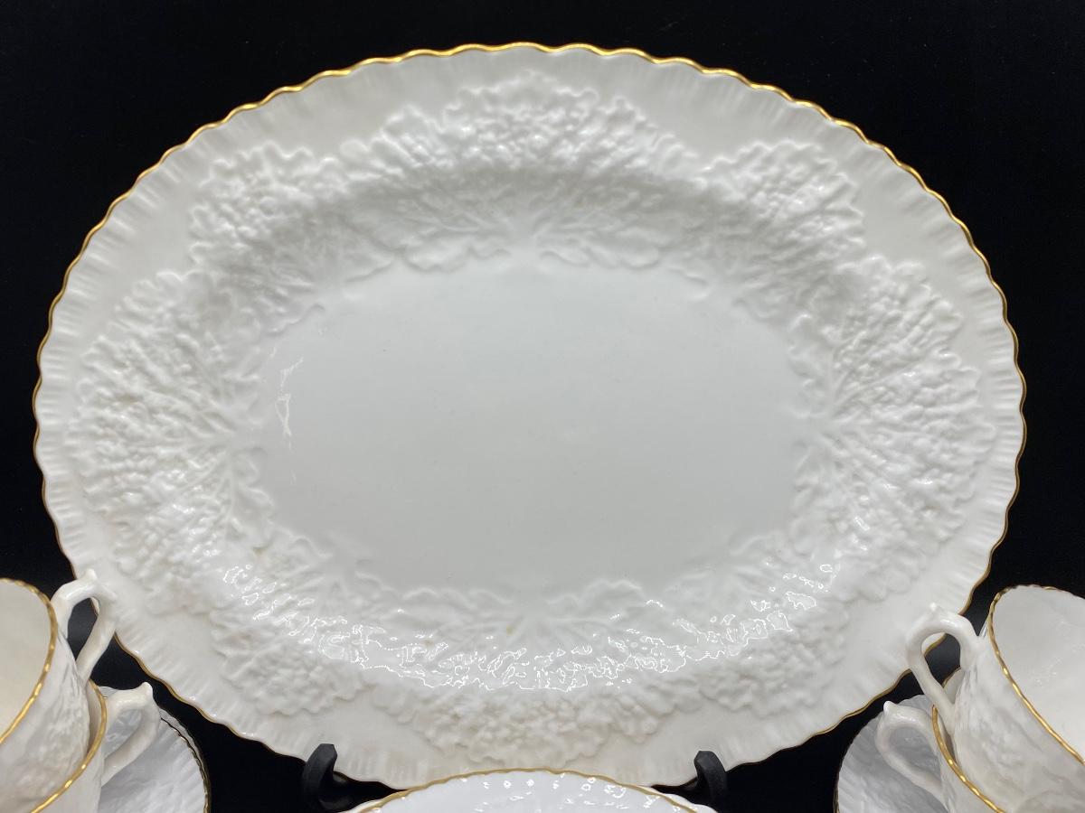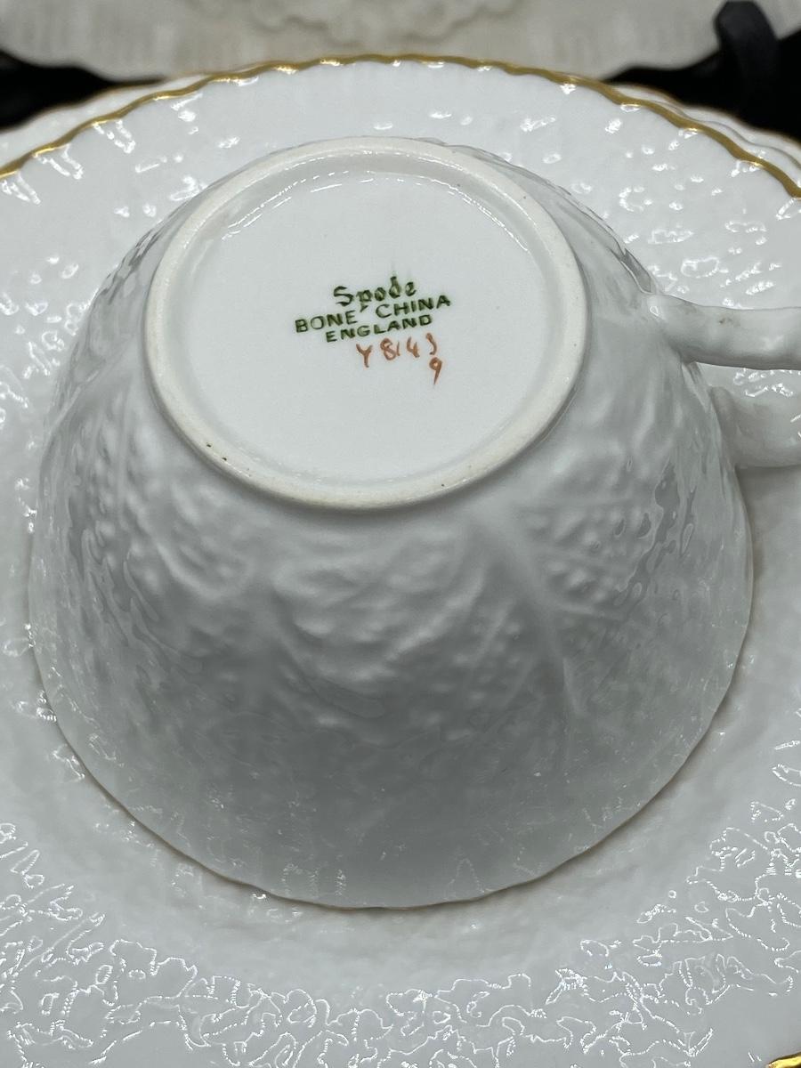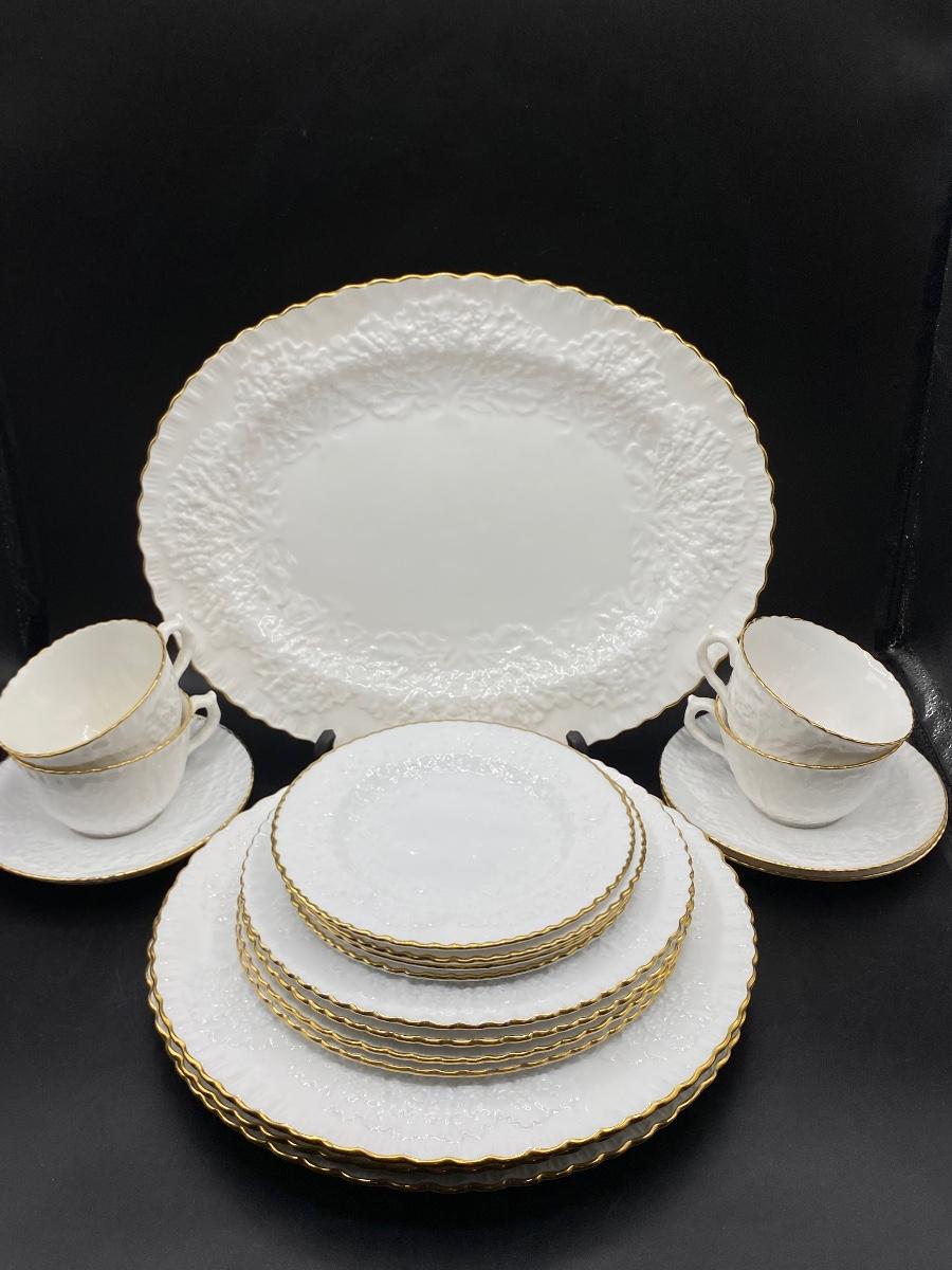 Vintage Spode Savoy bone china dinnerware. Service for 4 but missing a dinner plate. Has an Oval serving platter included. White with embossed cabbage leaf pattern, gold edge. No bowls in this set.