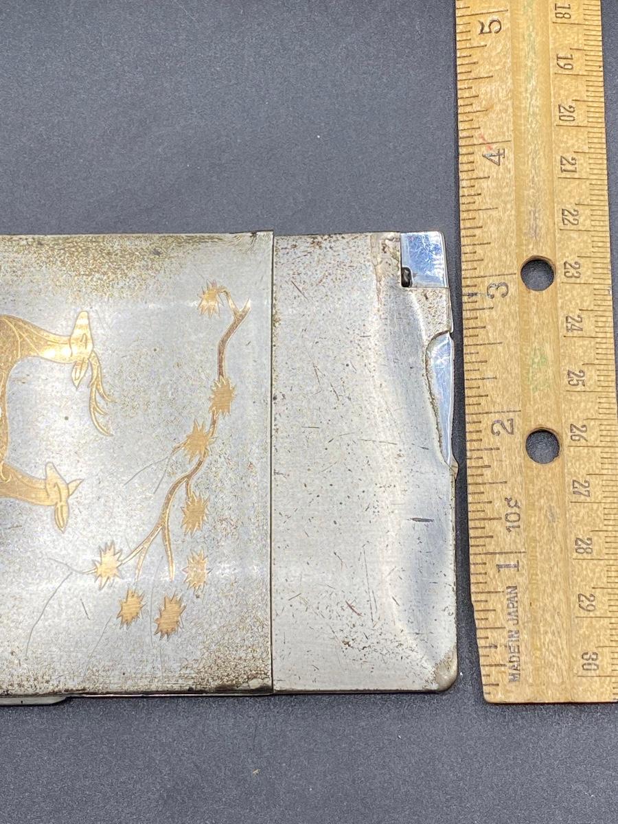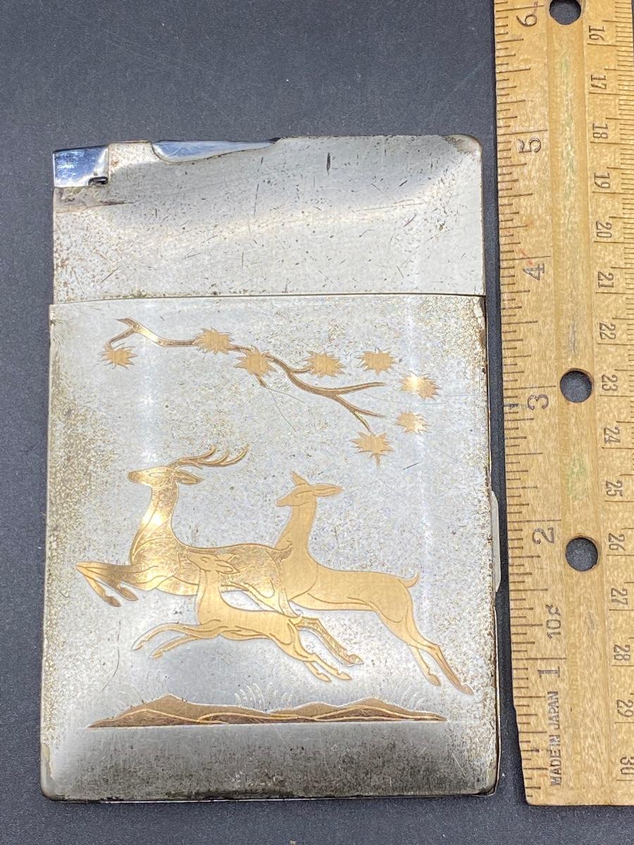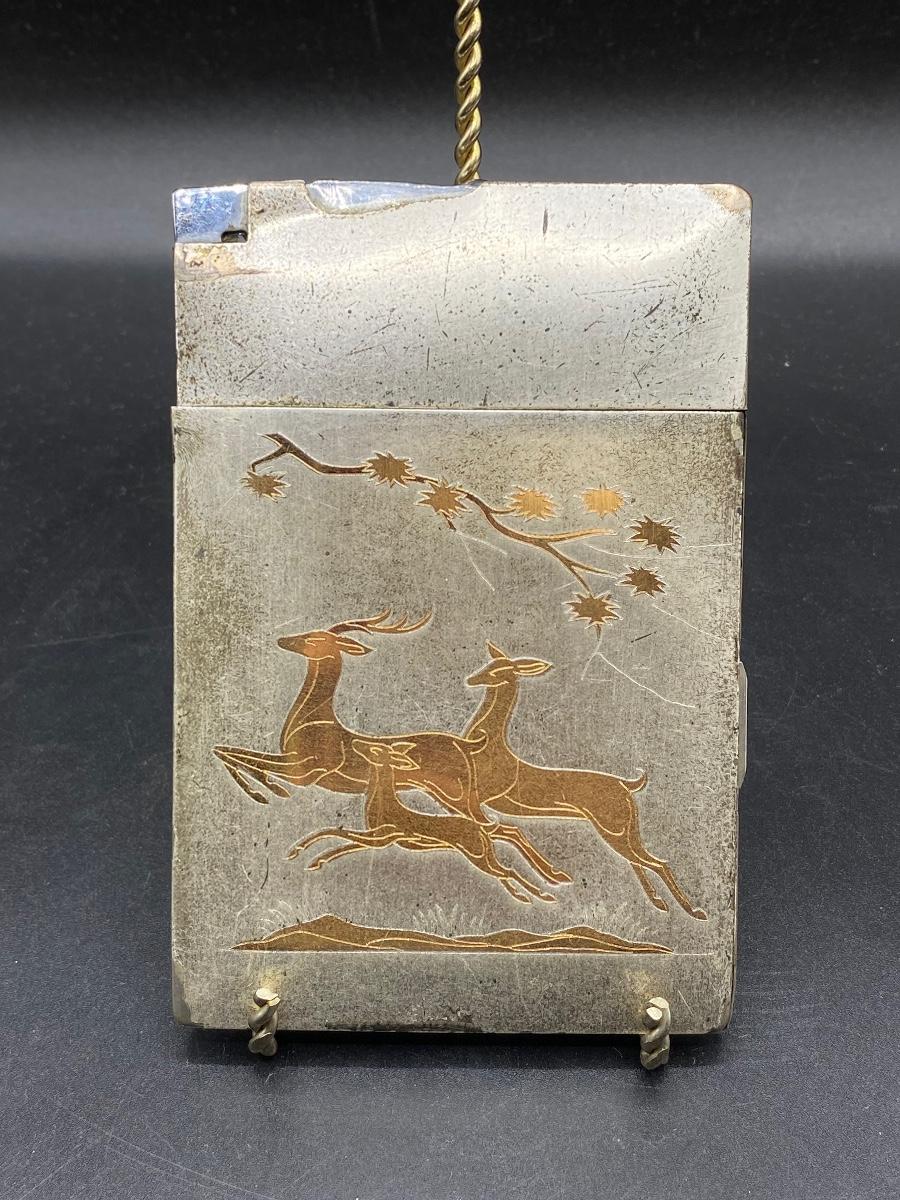 Vintage Cigarette holder lighter combination from Elgin American. Silver tone metal with a copper deer running design. Has signs of age and use. Lighter looks lightly used, needs fluid. About 5"x3" size.