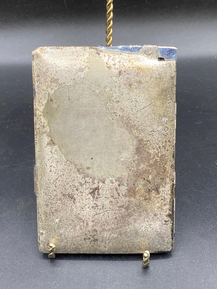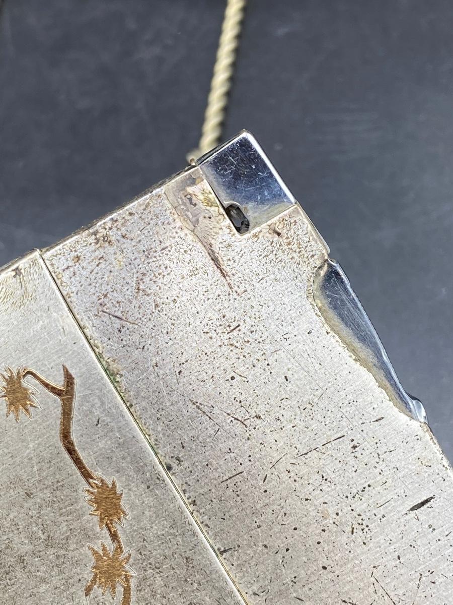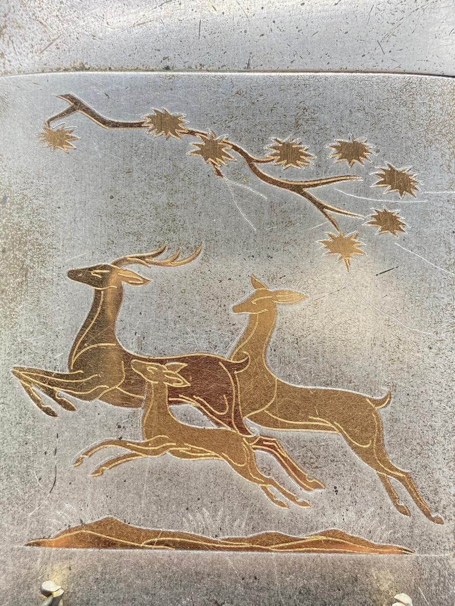 Vintage Cigarette holder lighter combination from Elgin American. Silver tone metal with a copper deer running design. Has signs of age and use. Lighter looks lightly used, needs fluid. About 5"x3" size.