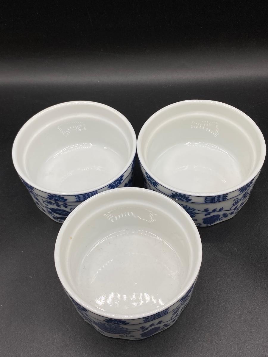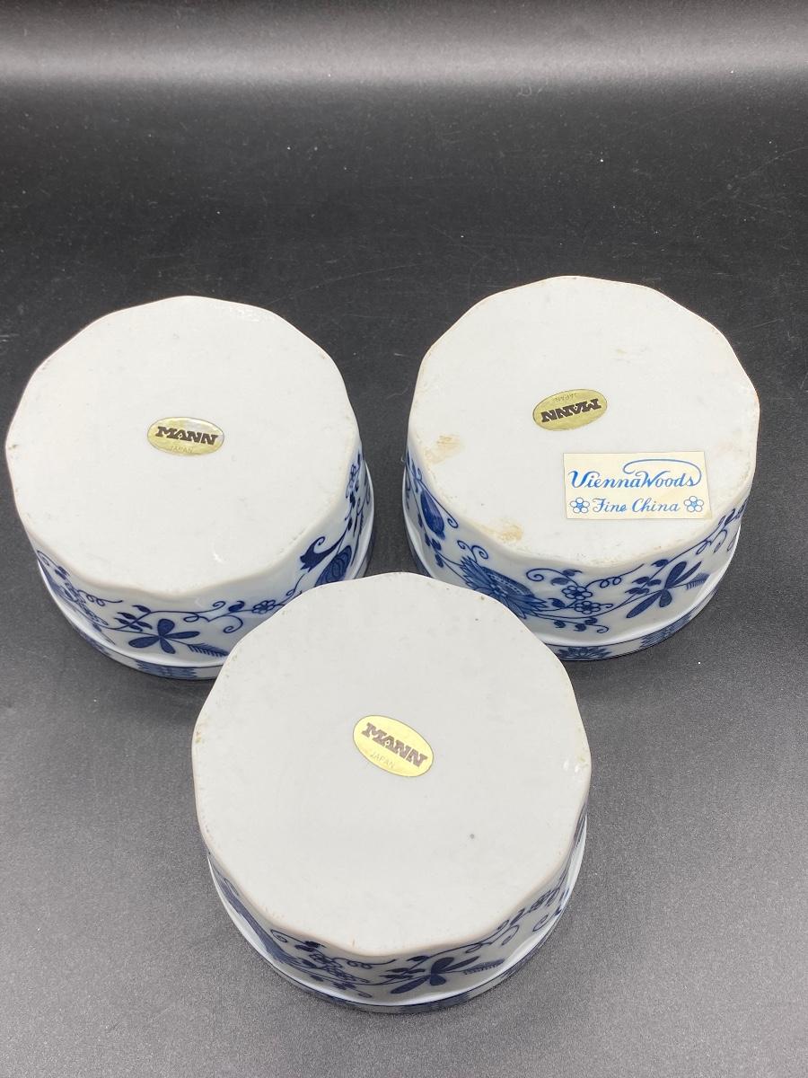 Set of 3 Blue Onion ramakin bowls by Mann. Good condition. About 3" size.