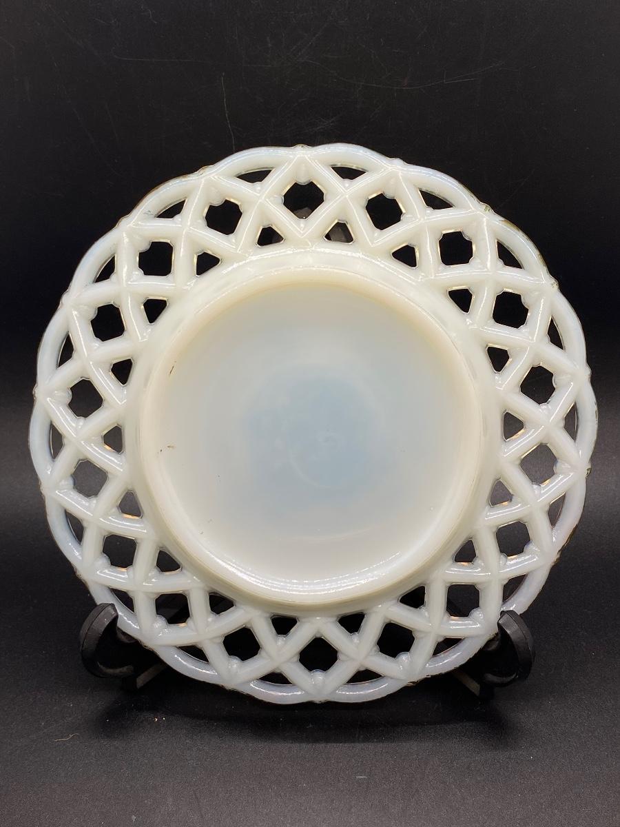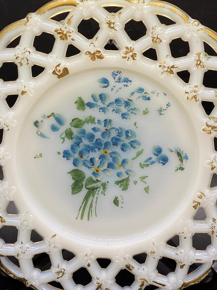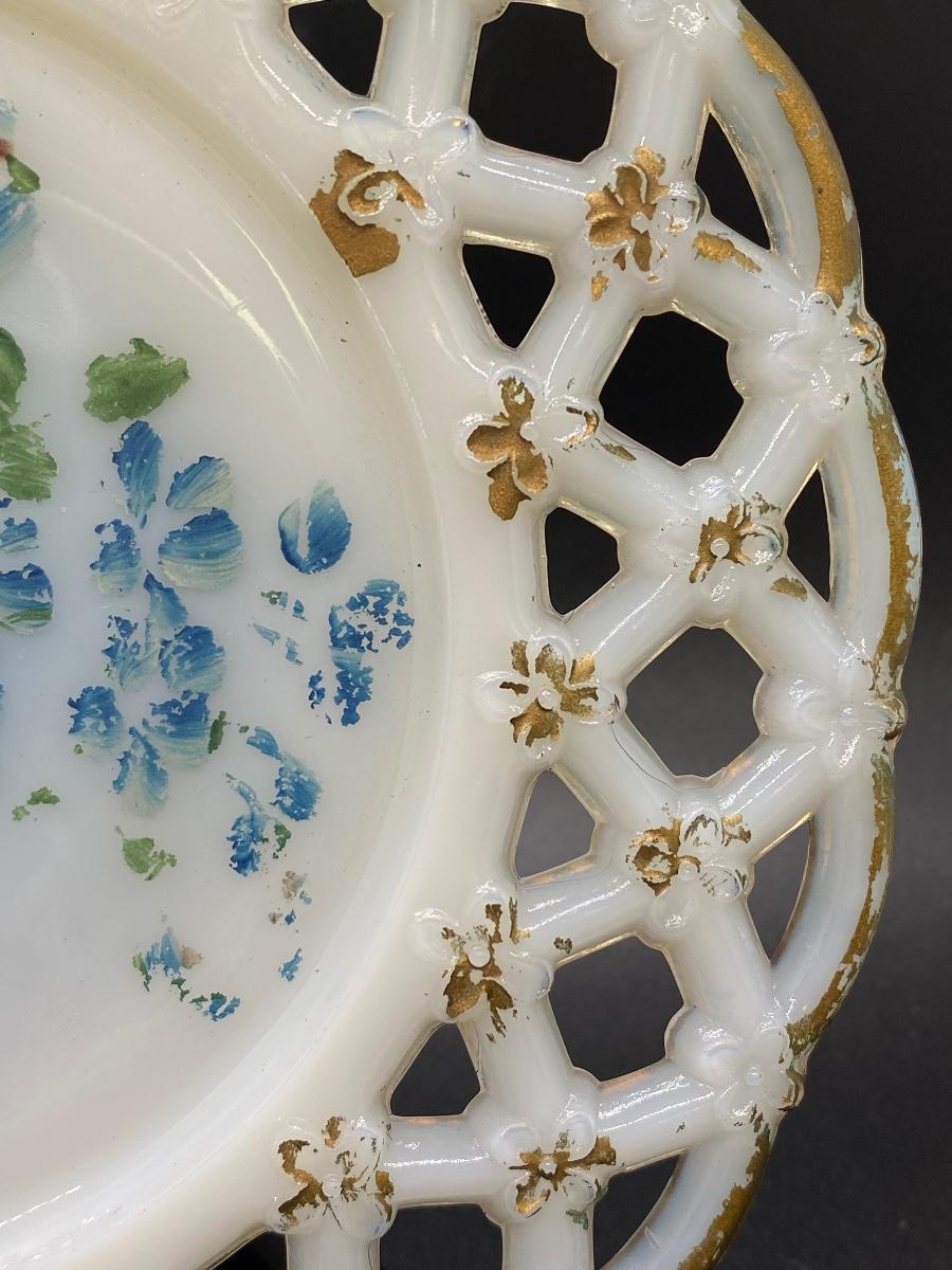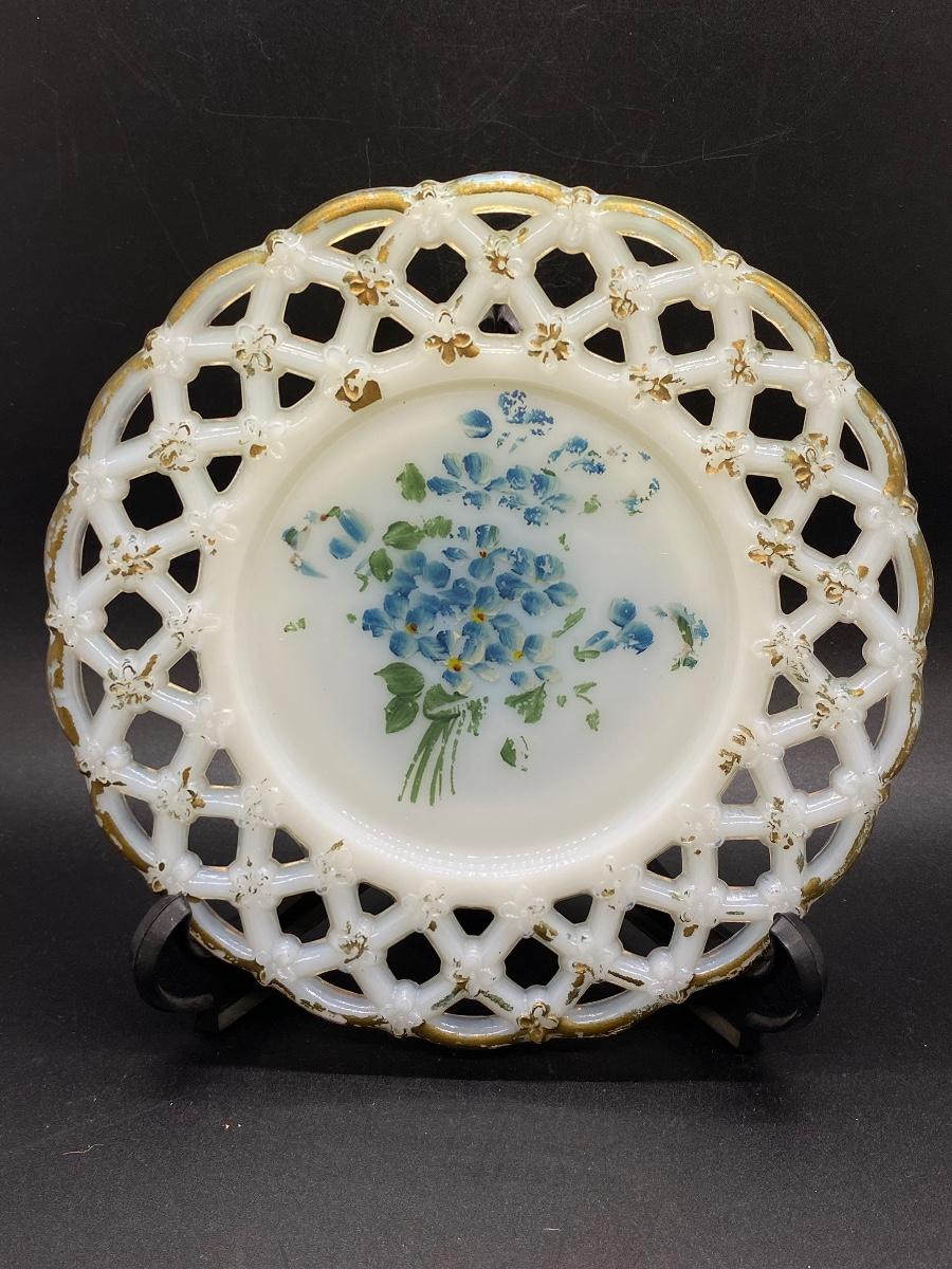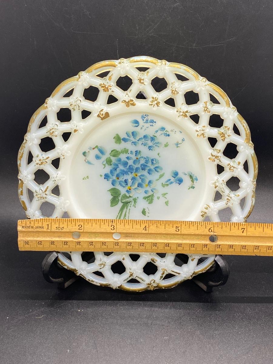 Vintage Flower Painted Opaque Milk Glass Lace Edge Plate
