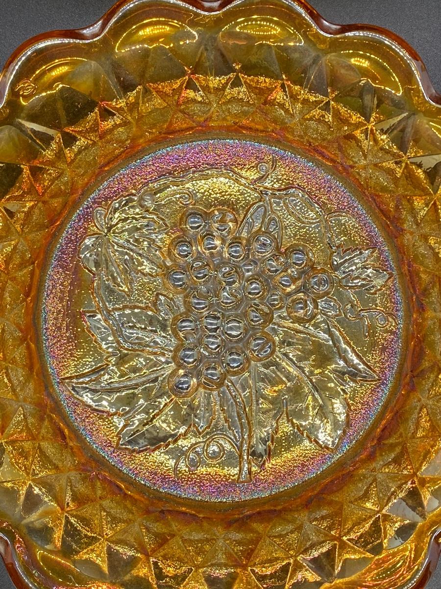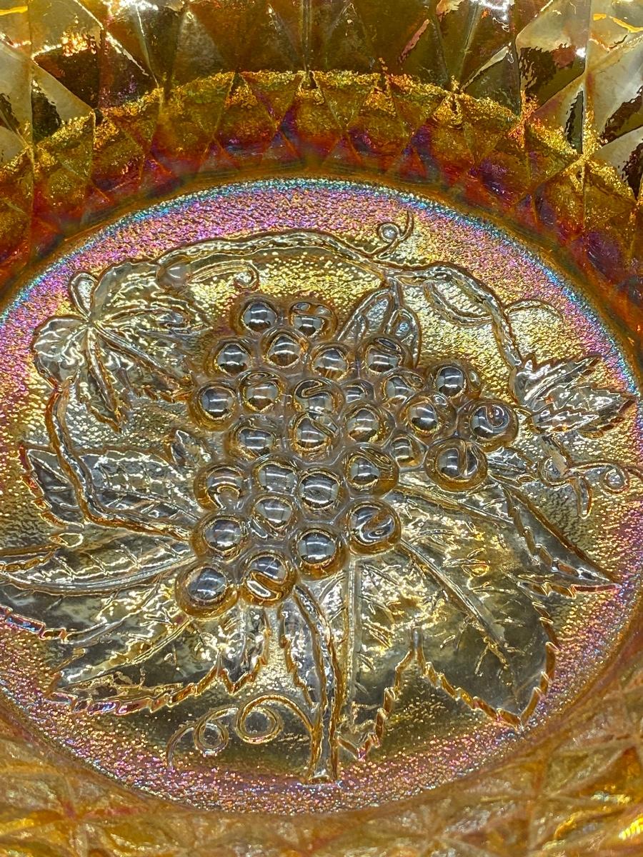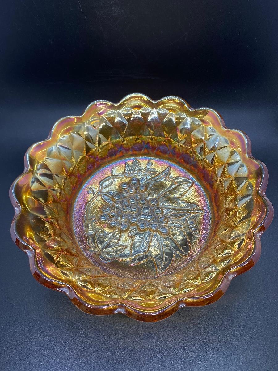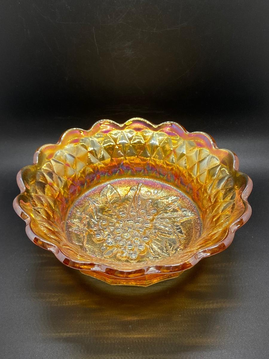 Vintage Imperial Glass Co marigold carnival glass serving bowl. Scalloped edge with embossed grape pattern at center of bowl. Good vintage condition, no chips. About 9" size.