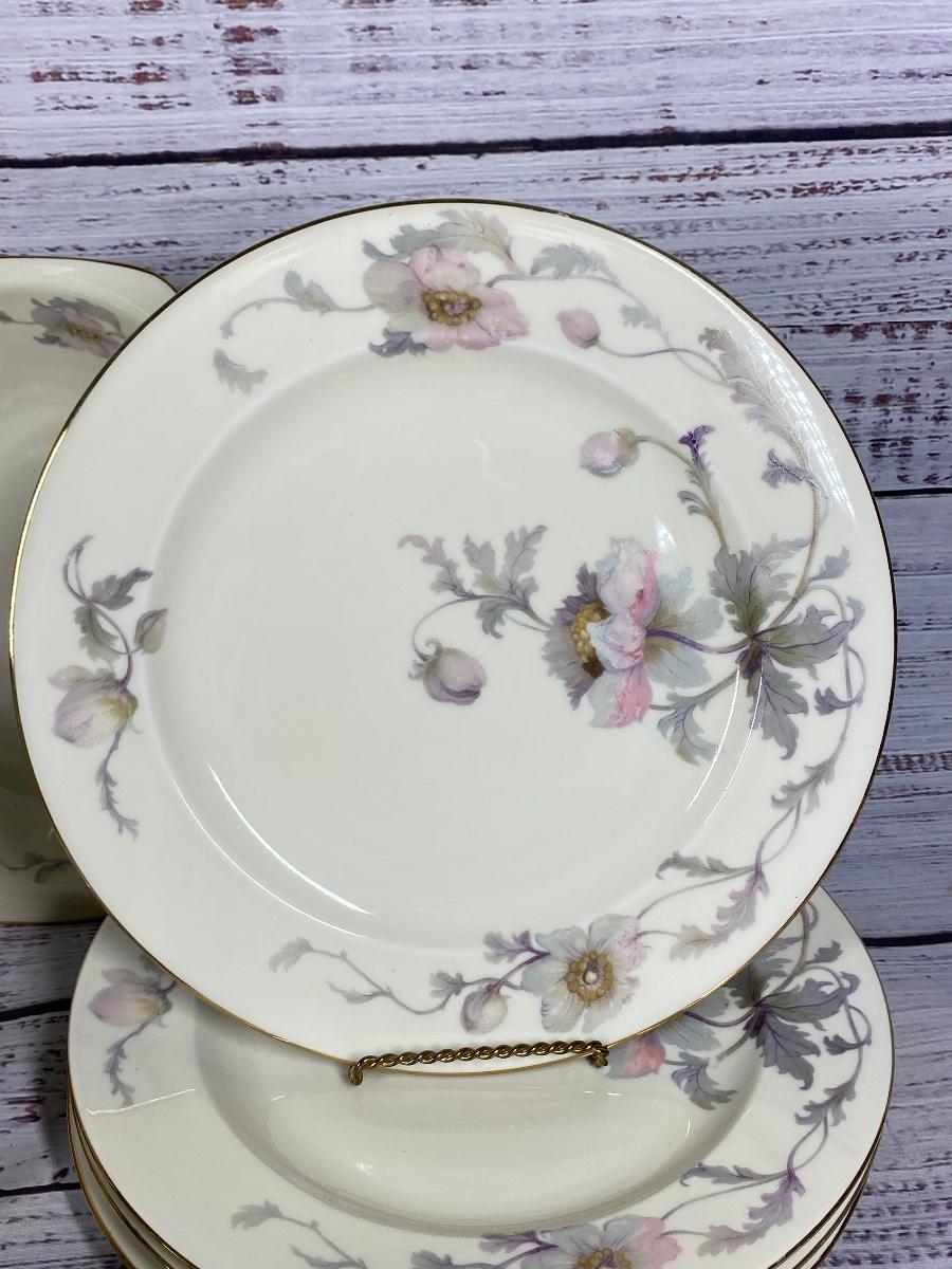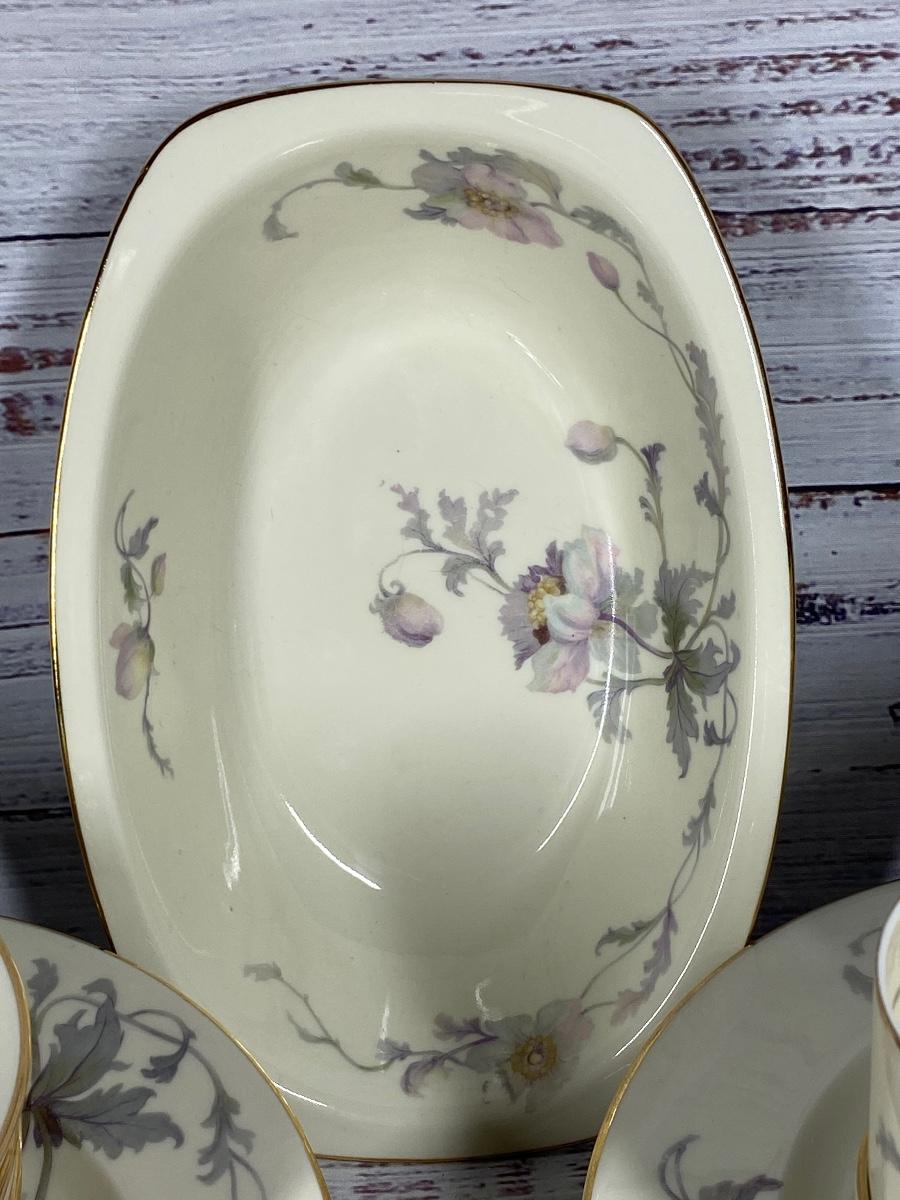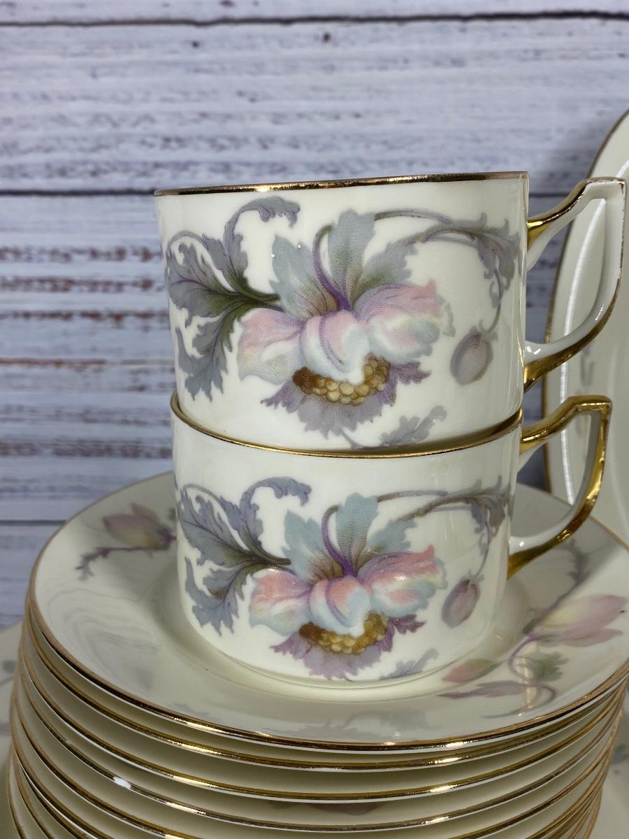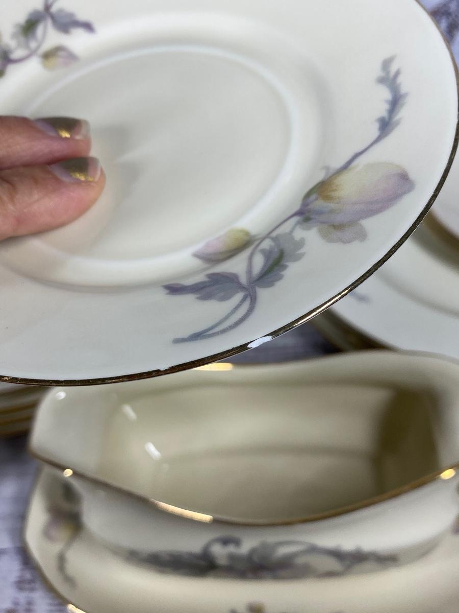 Vintage Epiag "Pastelle" china dish set. Made in Czechoslovakia. Ivory with a purple floral pattern. 26 pieces. 8 cups & saucers, 8 dinner plates, gravy boat, oval serving dish. One saucer has a small chip.
