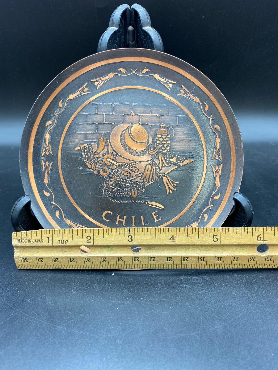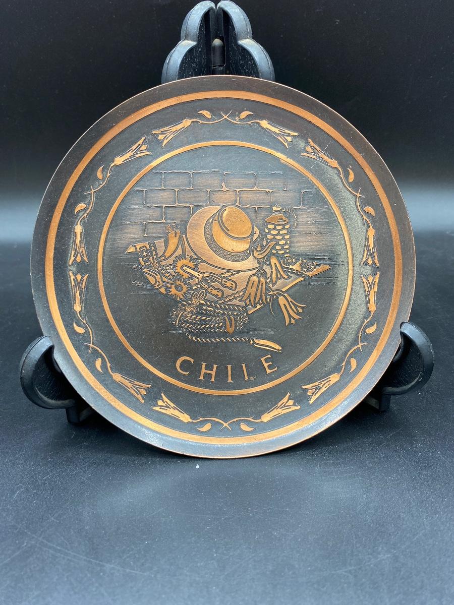 Metal souvenir wall plate from Chile. Small About 6" size, can be hung.