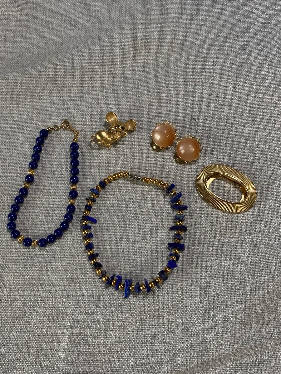 Gold tone jewelry lot. The little mouse pin is missing a rhinestone eye, but is still cute.