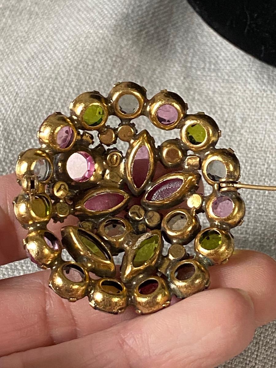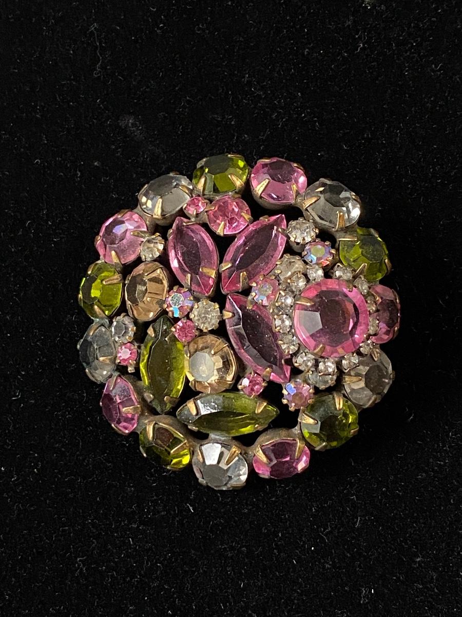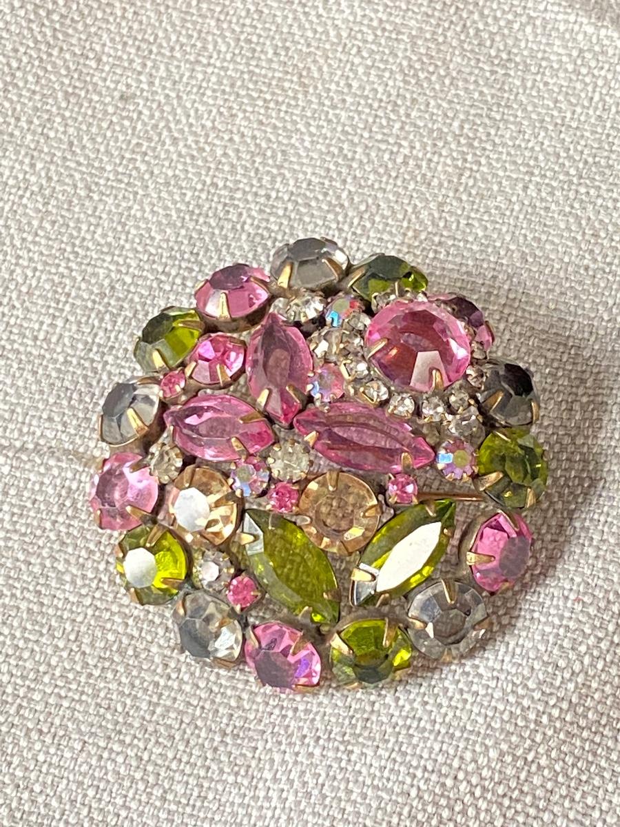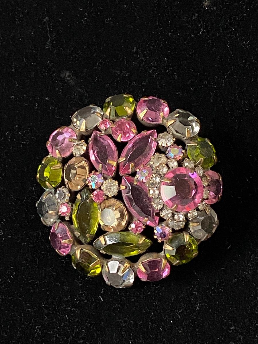 Vintage Round Pink & Green AB Rhinestone Brooch Pin