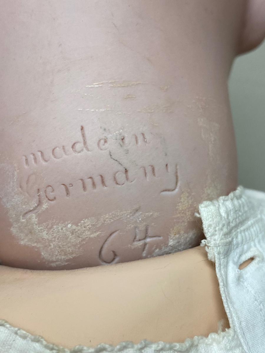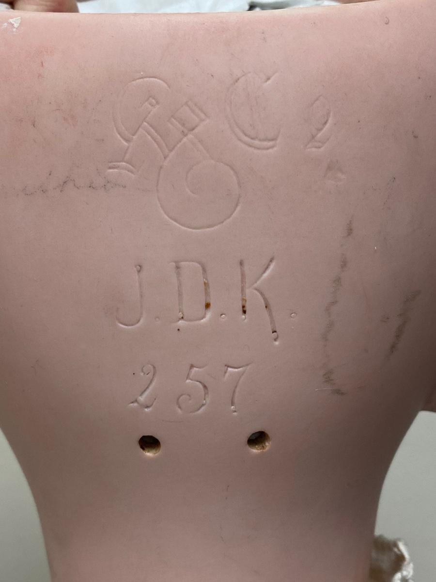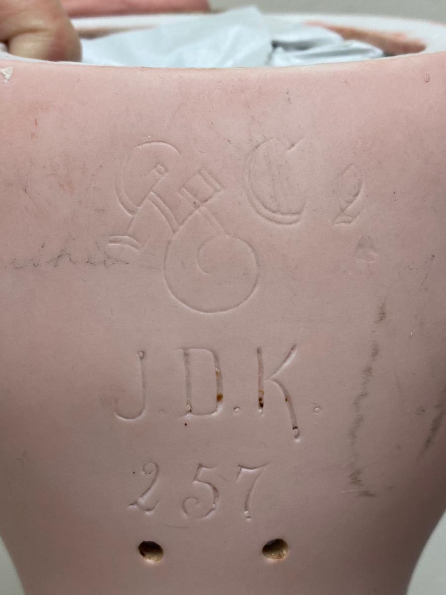 Large chubby cheek bisque and composite JDK repro doll. 31" sleep eye doll. Back of head marked, some of it is hard to read but you can read the JDK 257 made in Germany 64. In good vintage condition.