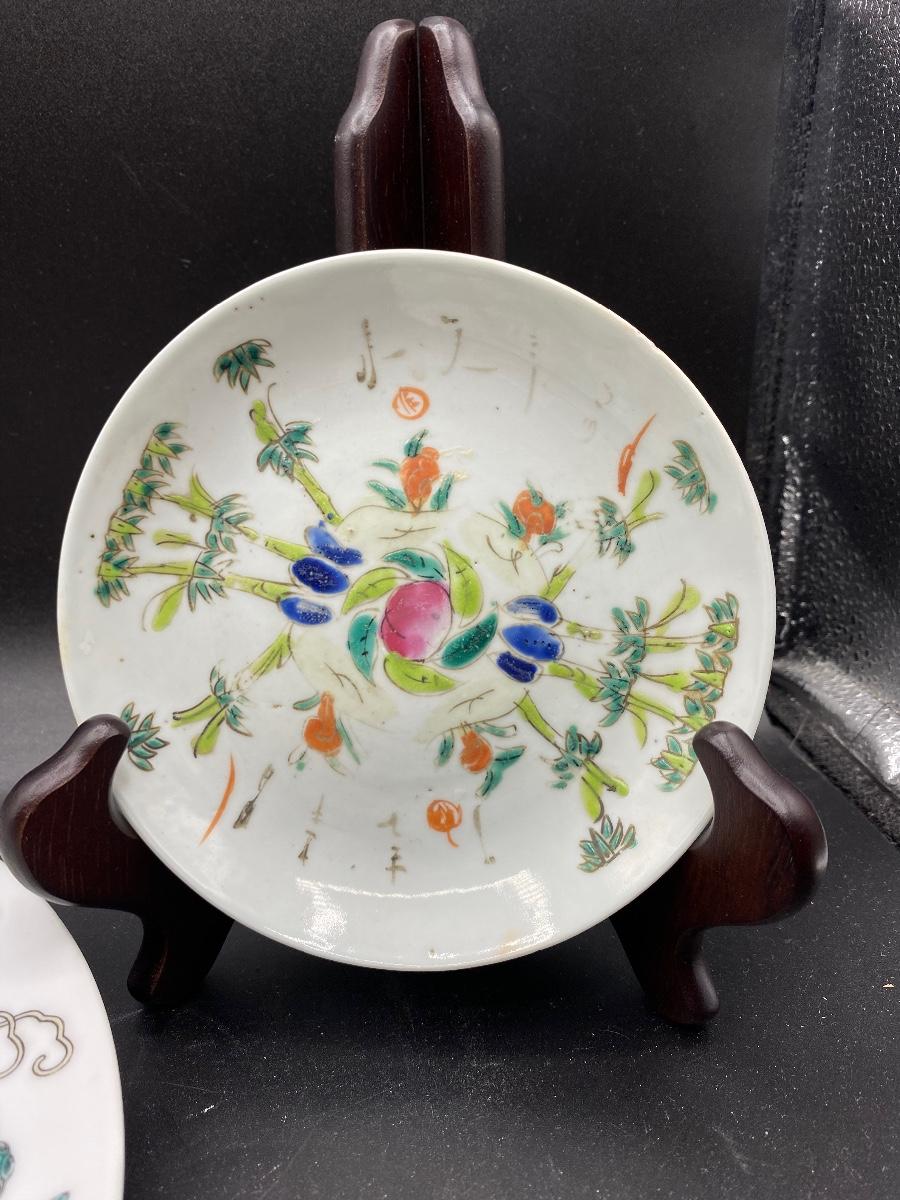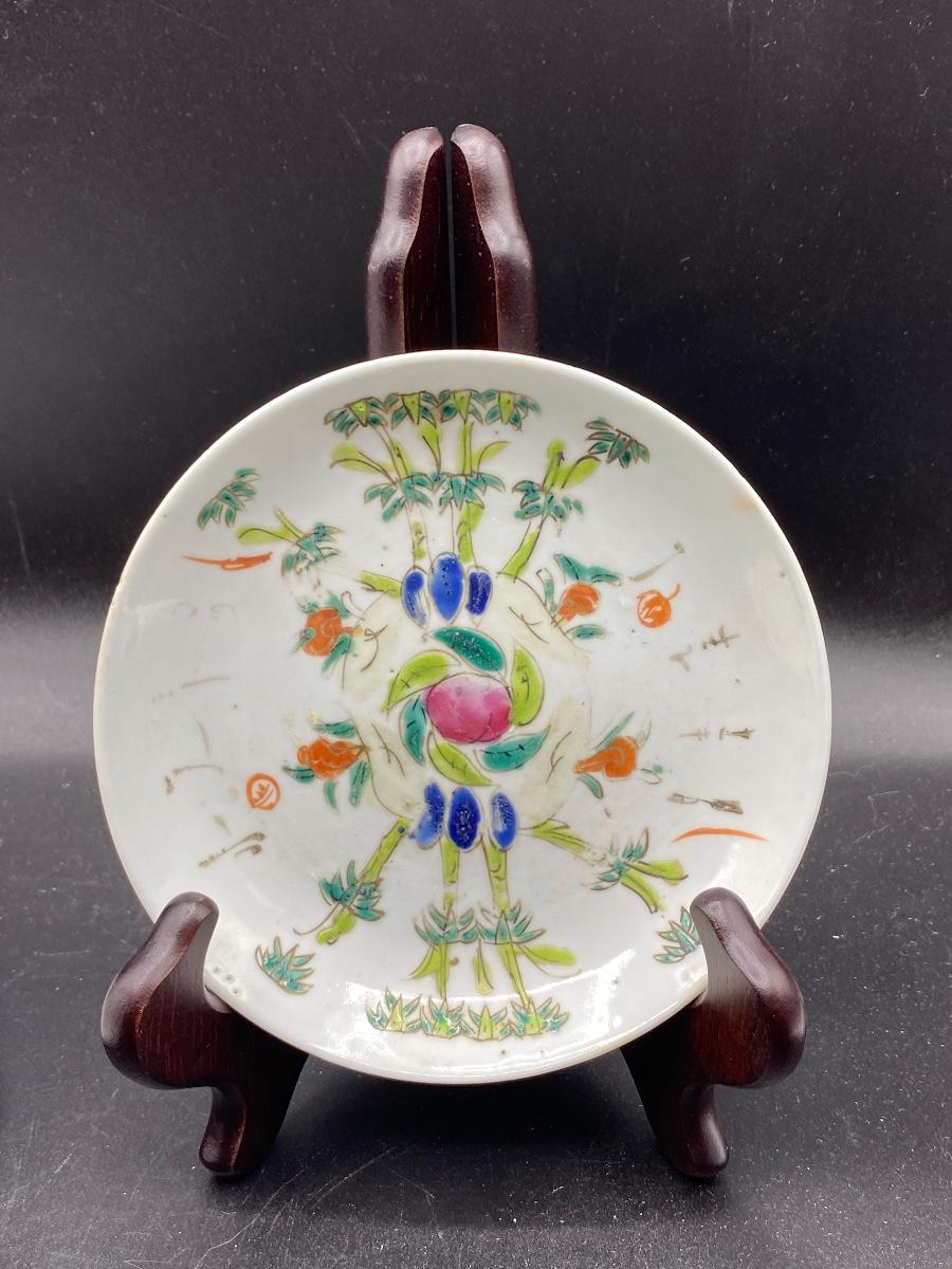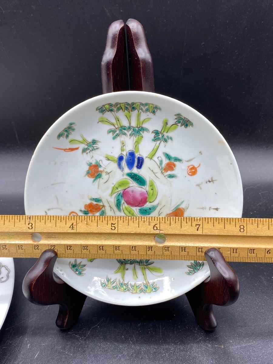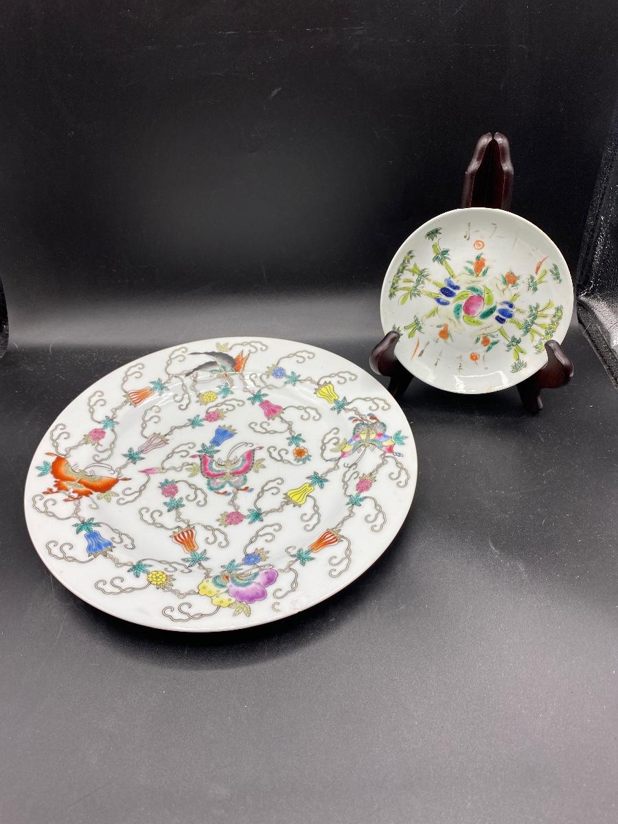 Pair of antique Asian decorated plates. Colorful designs, one has butterflies and flowers. The saucer size plate does have wear to the pattern. No chips. Both are marked on the back, the large plate has a wax stamp along with mark.