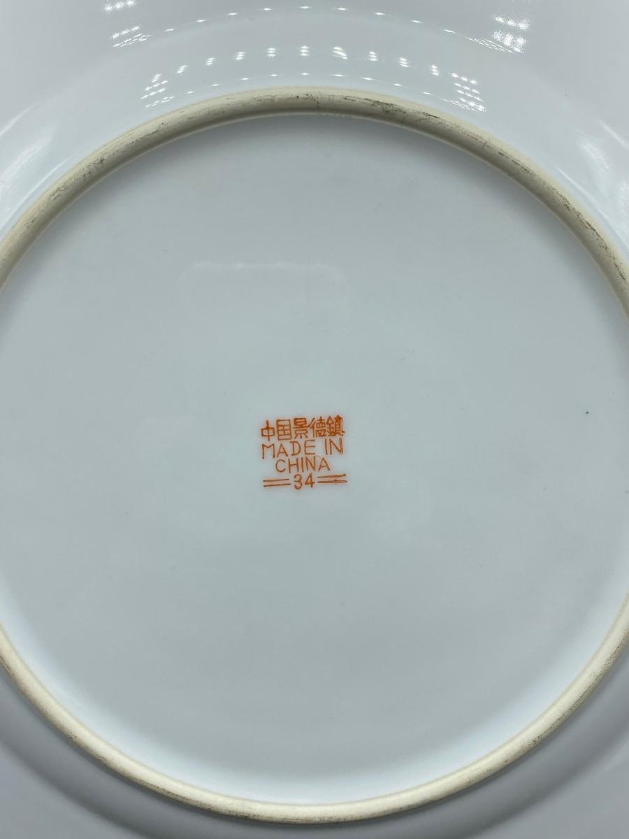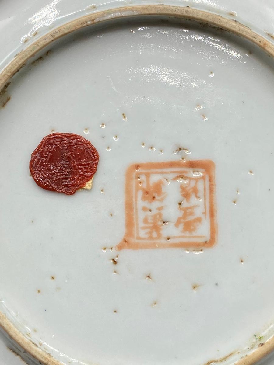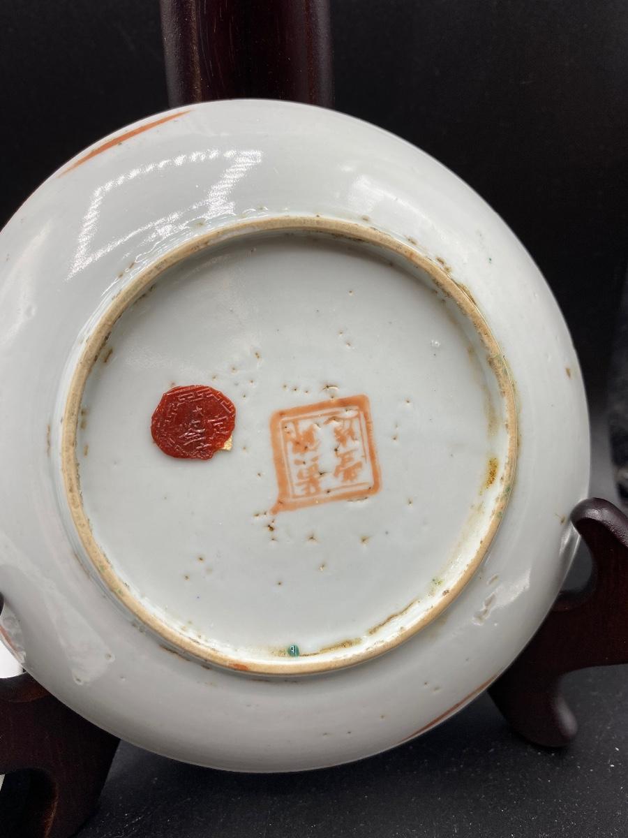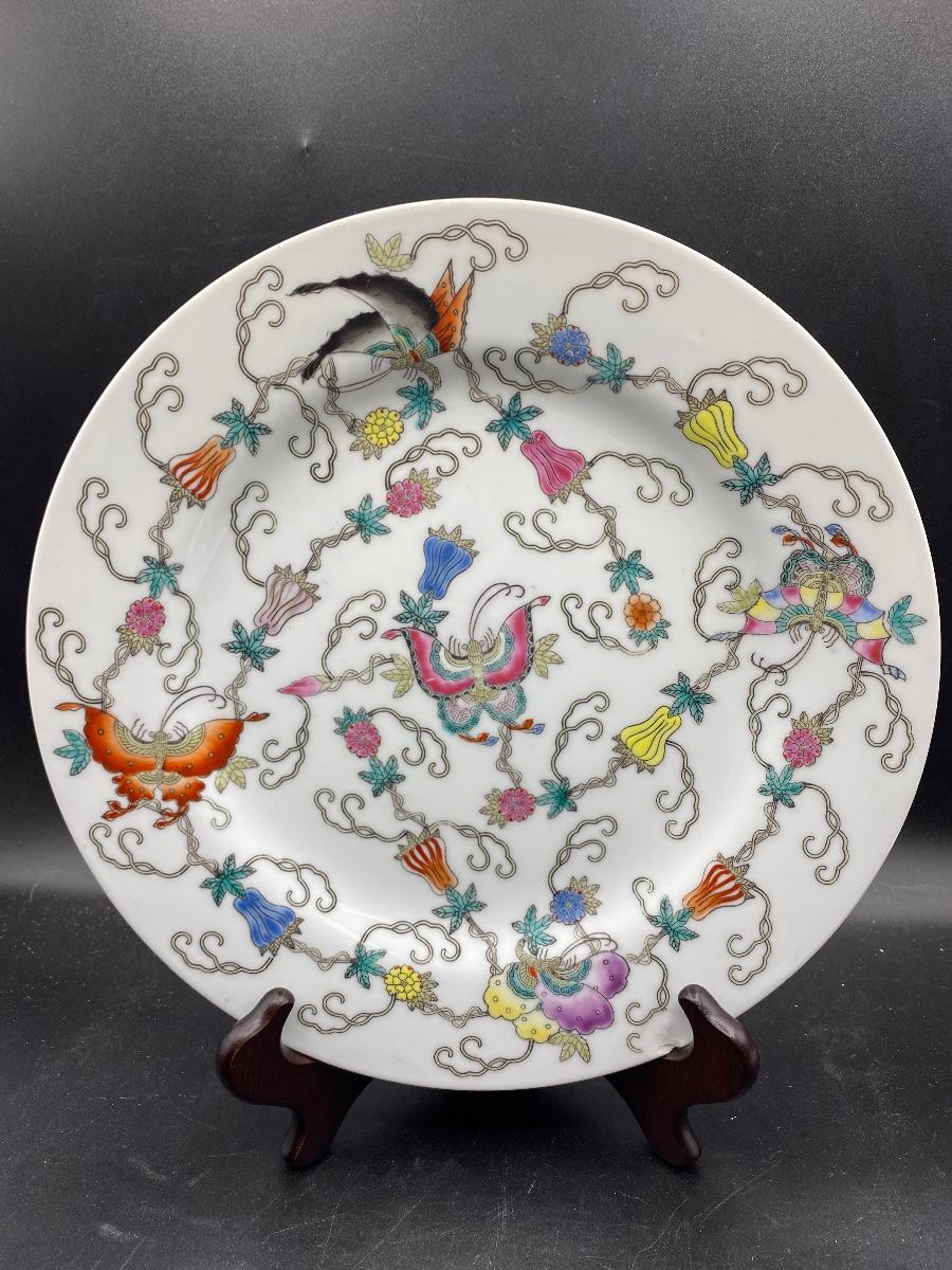 Pair of antique Asian decorated plates. Colorful designs, one has butterflies and flowers. The saucer size plate does have wear to the pattern. No chips. Both are marked on the back, the large plate has a wax stamp along with mark.