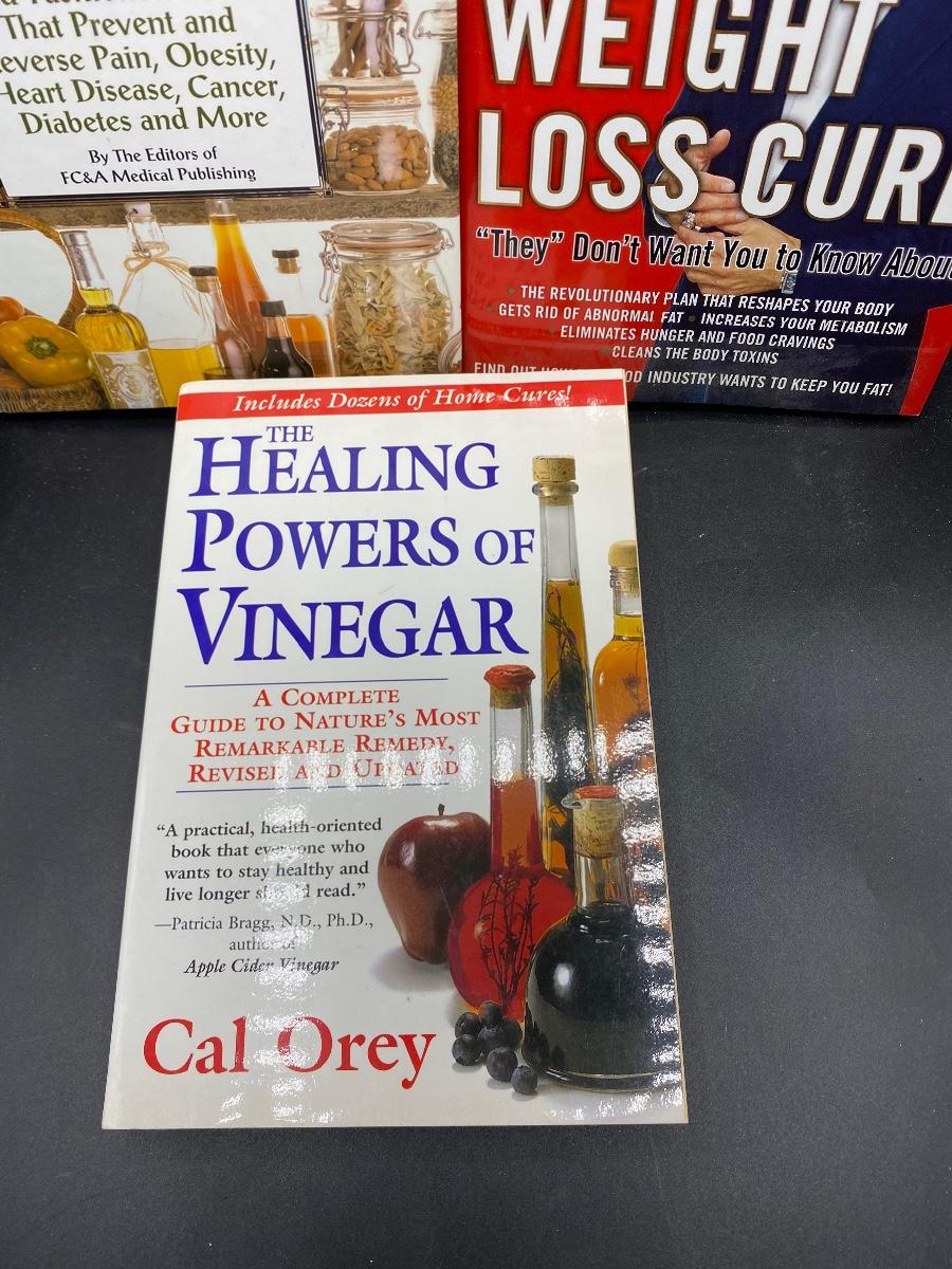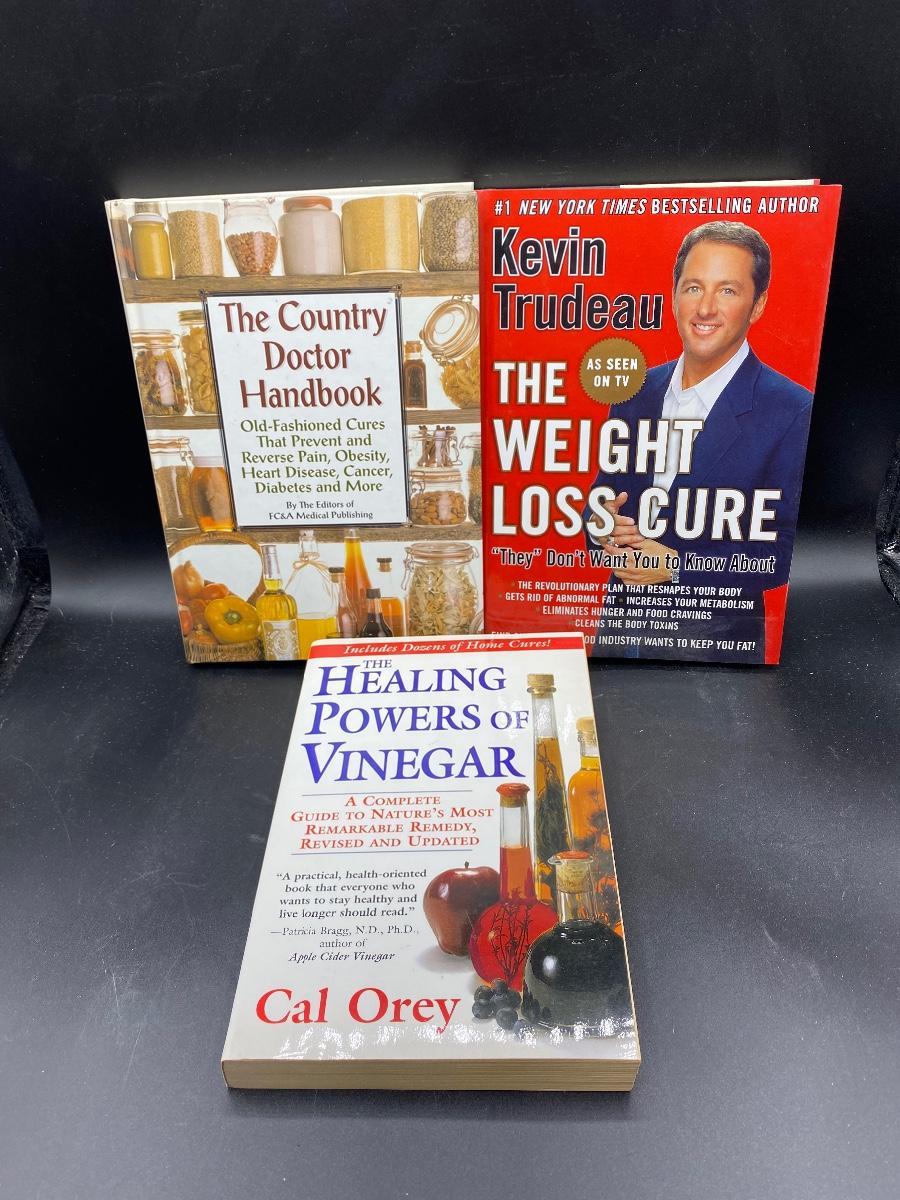 Lot of 3 hardback books for self improvement and health. The Country Doctor Handbook, Healing Powers of Vinegar, and The Weight Loss Cure. All in good condition.