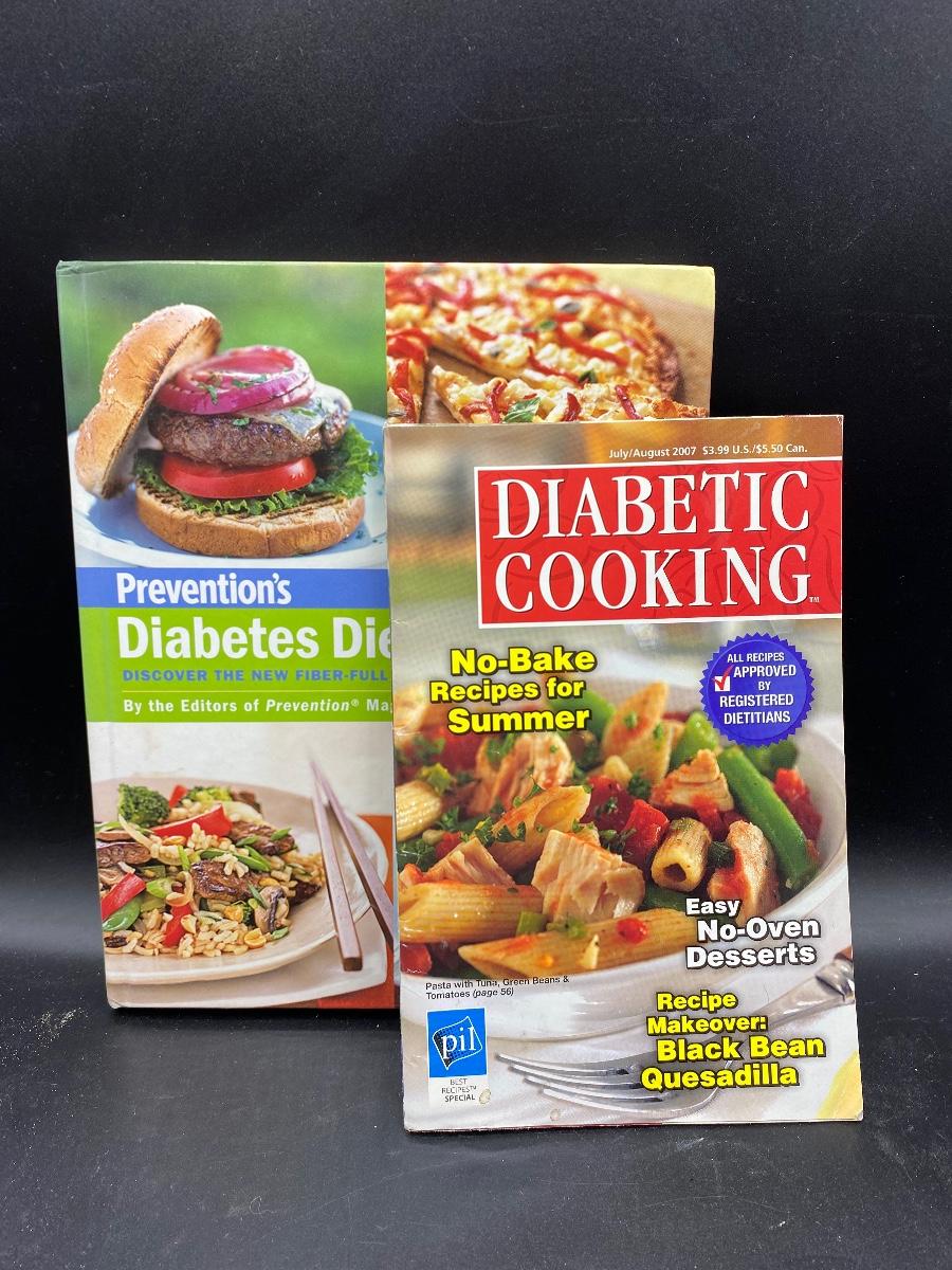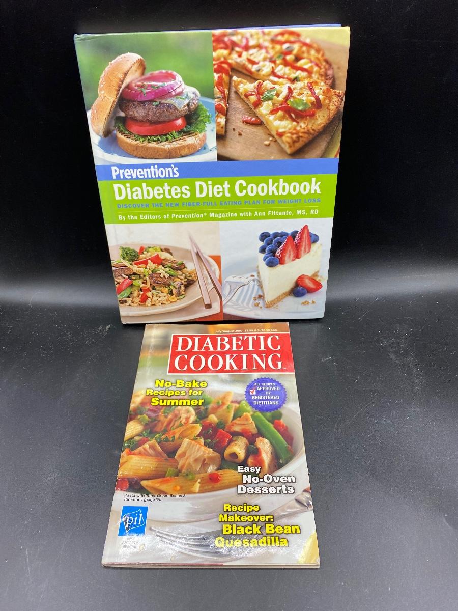 Pair of diabetes diet cookbooks. One hardback from Prevention Magazine, the other is a small paperback cookbook. Both are in good condition.