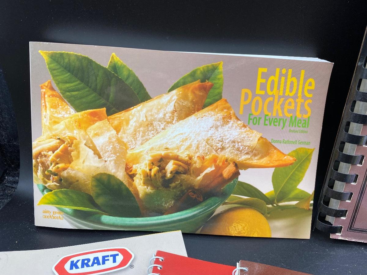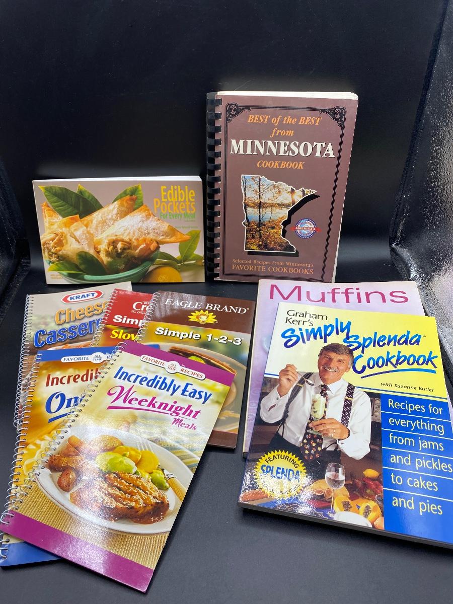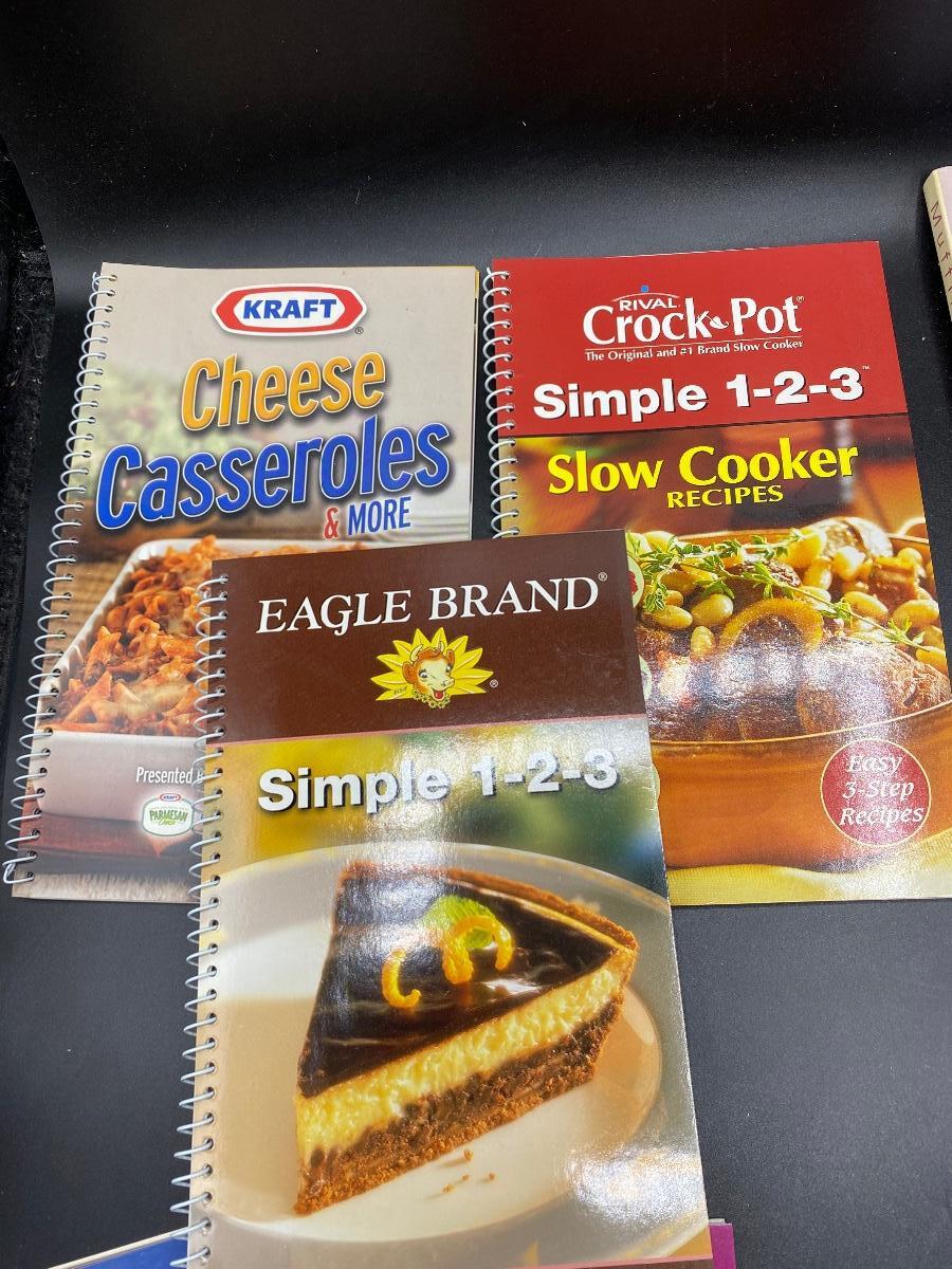 Set of 9 Softcover Spiral Recipe Cookbooks. Recipes from Kraft, Eagle Brands, Splenda, Crock Pot, and more. Good condition.