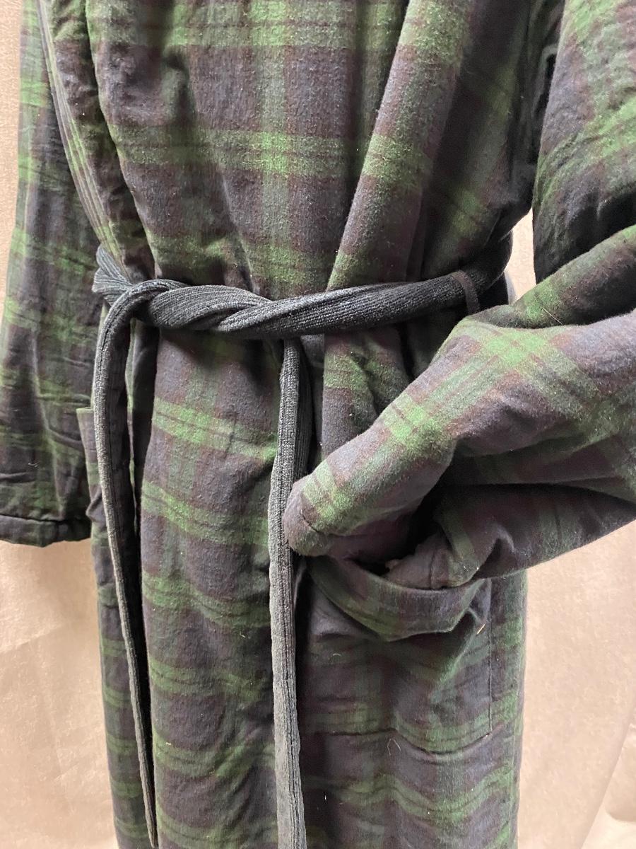 Men's thick fleece lined flannel bath robe from Goodfellow & Co. by Target. Blue green plaid outer with soft white fleece lining. Thick and cozy. In good previously worn condition. Size tag has been removed, but guessing it is a medium based on the clothes from the estate.