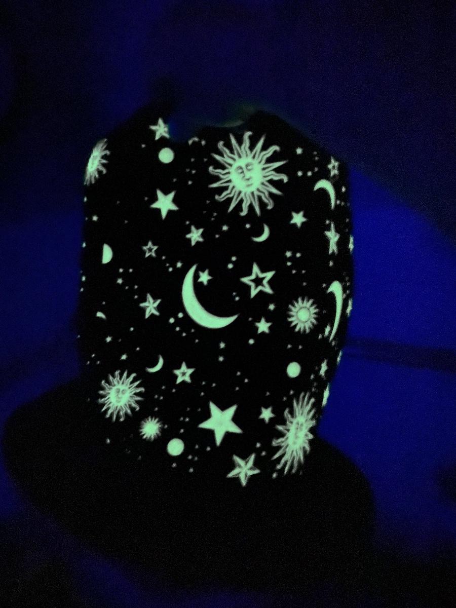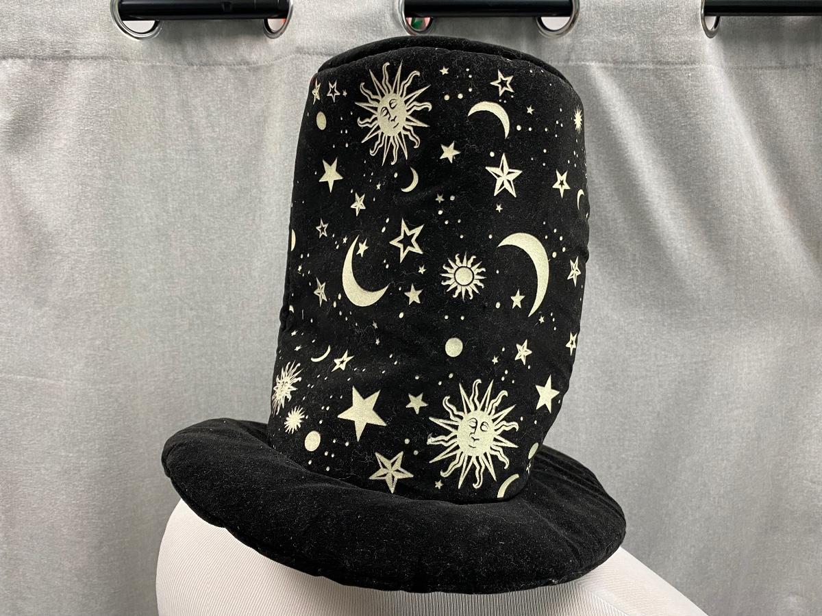 Glow in the Dark Star Covered Black Velvet Novelty Top Hat. Glows pretty well in the dark. Foam lined. Made by Creations Inc. No size.