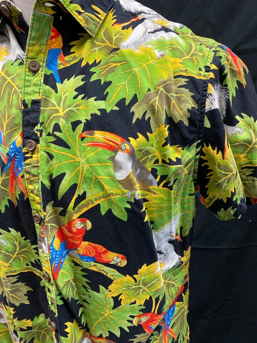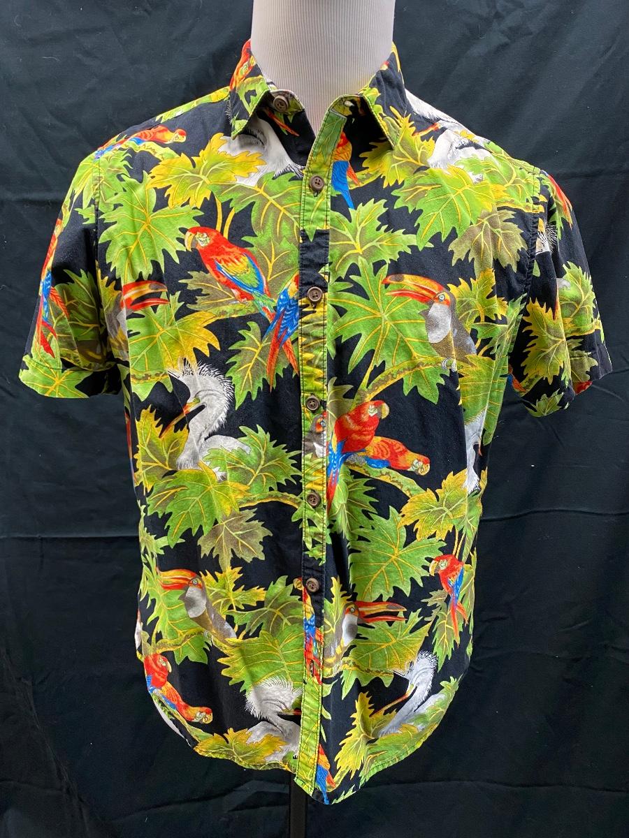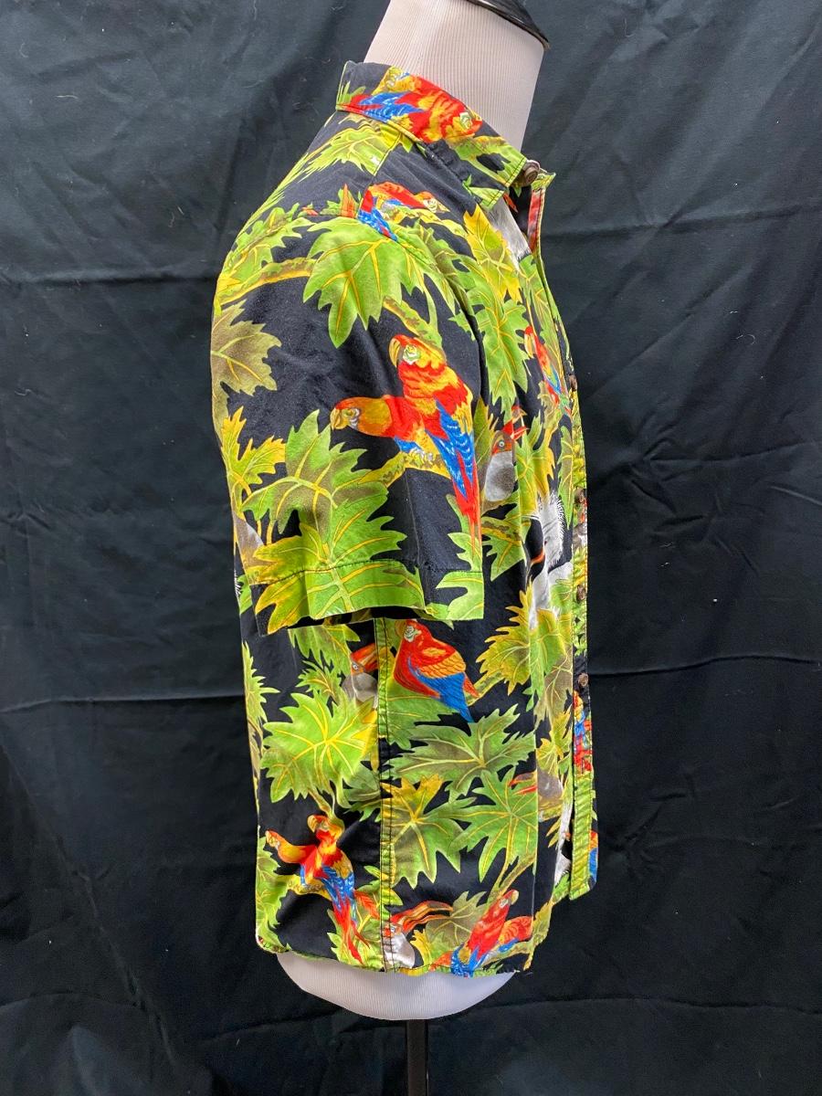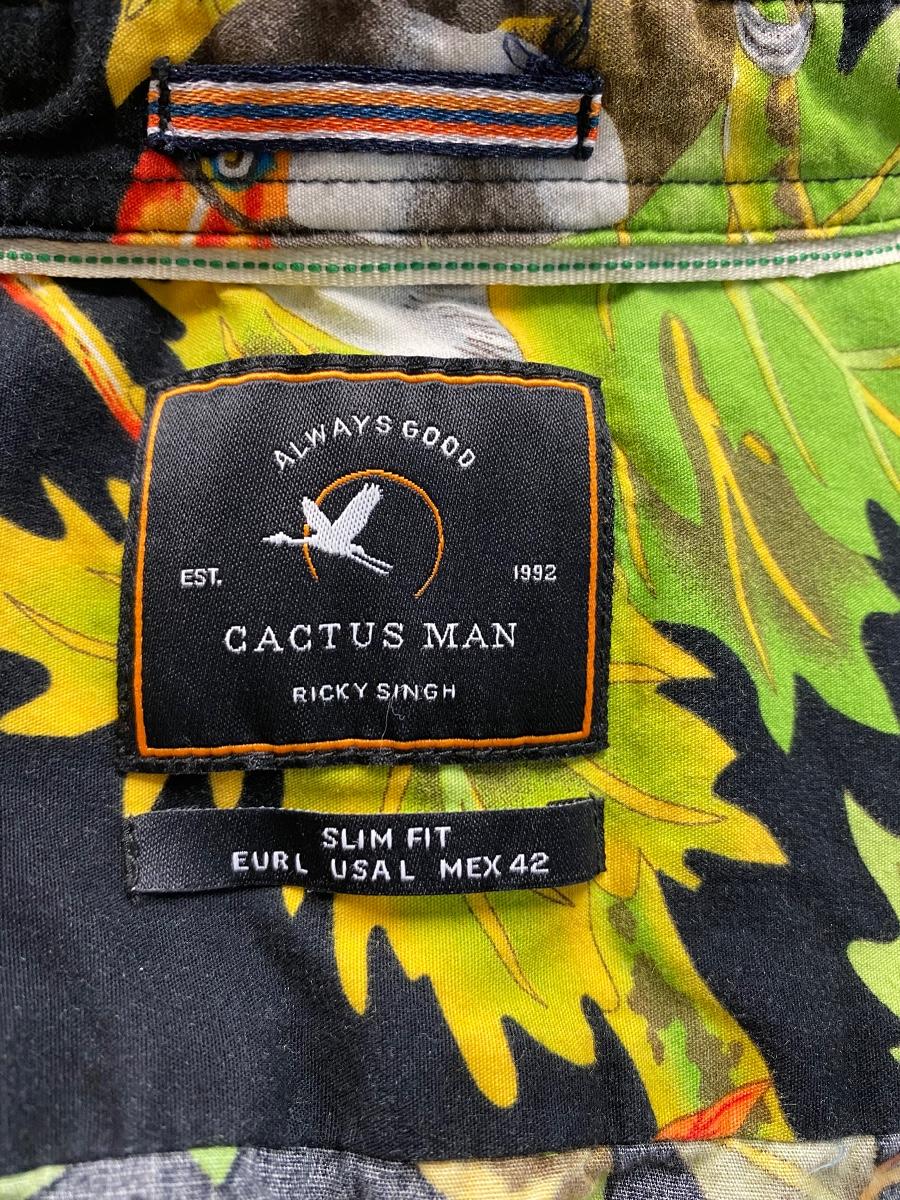 Men's tropical bird parrot shirt from Cactus Man Ricky Singh. Colorful button front Hawaiian shirt, slim fit size large. In good condition.