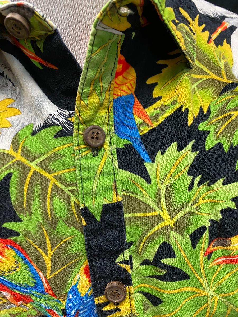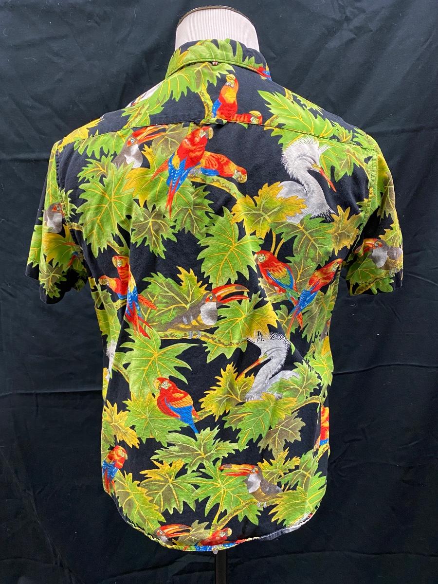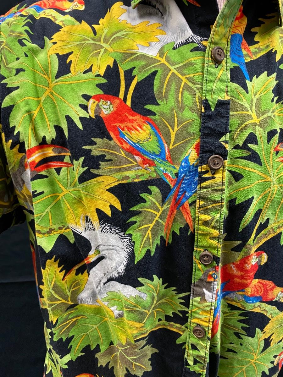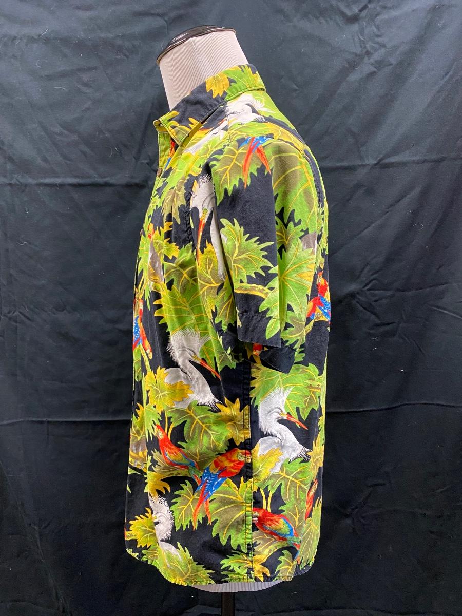 Men's tropical bird parrot shirt from Cactus Man Ricky Singh. Colorful button front Hawaiian shirt, slim fit size large. In good condition.