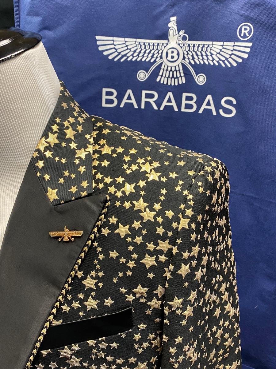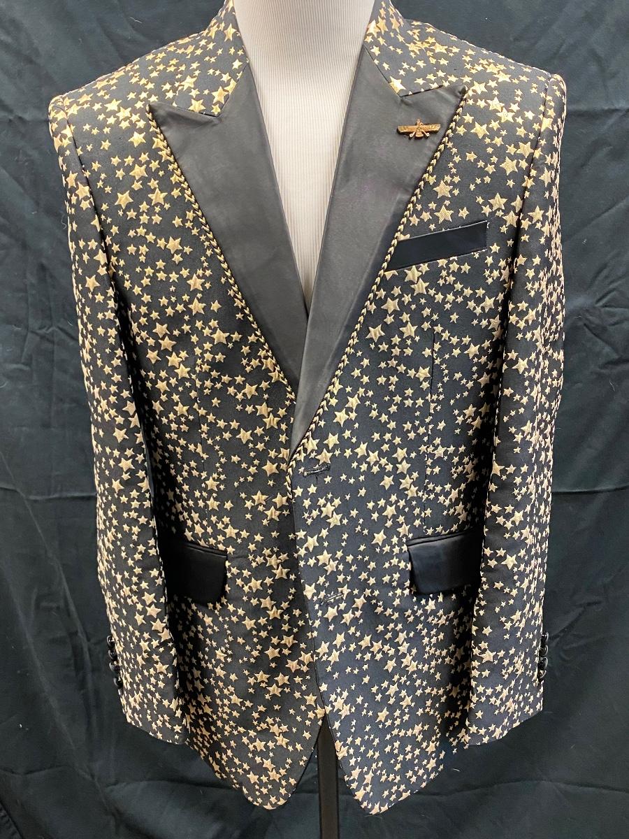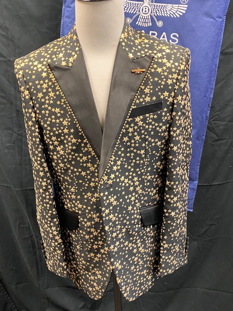 Flashy black with gold stars formal blazer suit jacket from Barabas. Slim fit, size 42R/L (large). Comes with protective storage bag. In very good condition. Great for formal events and parties.