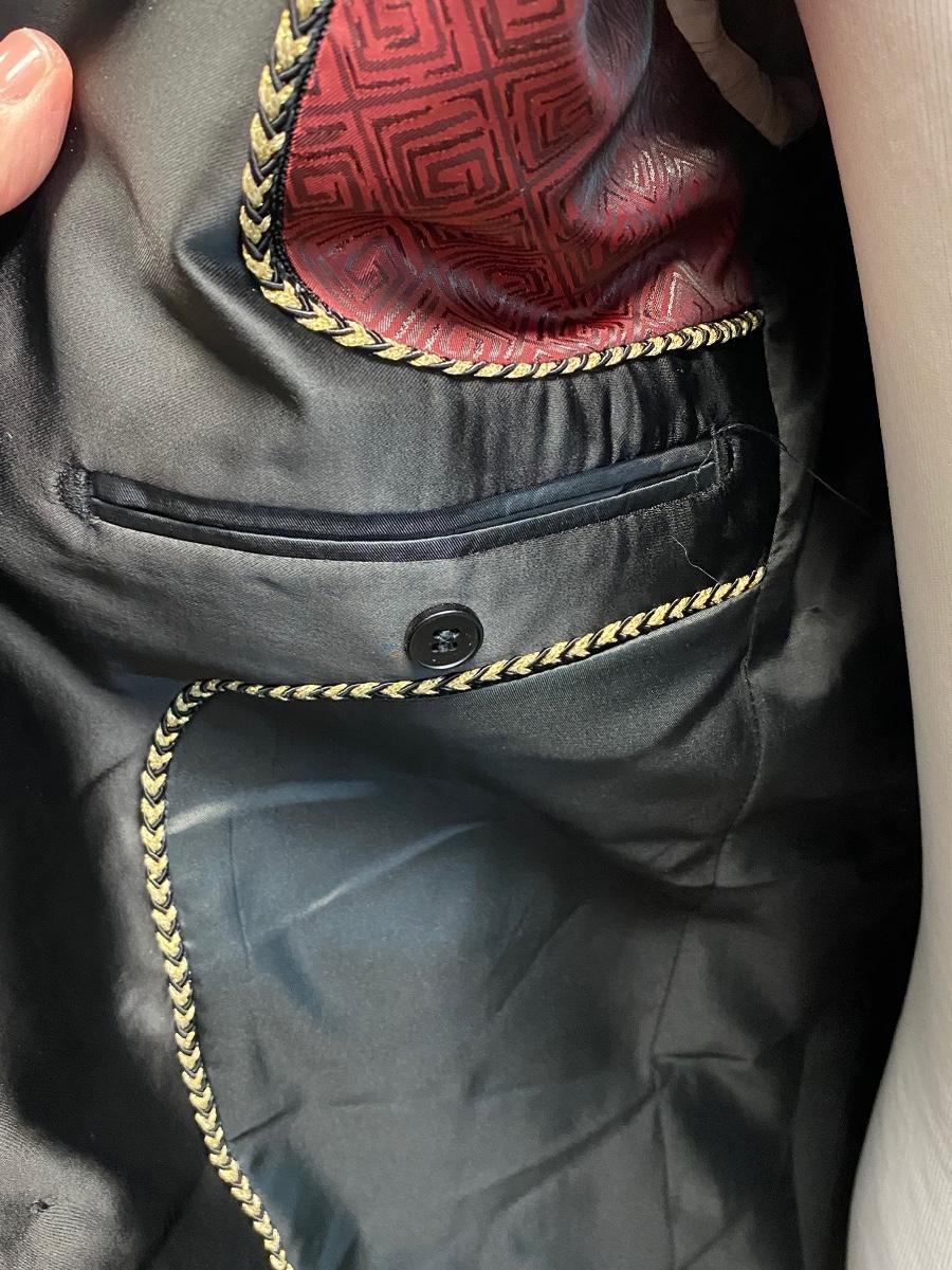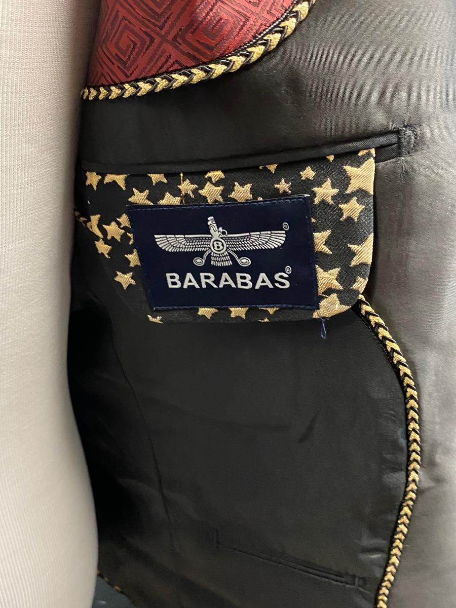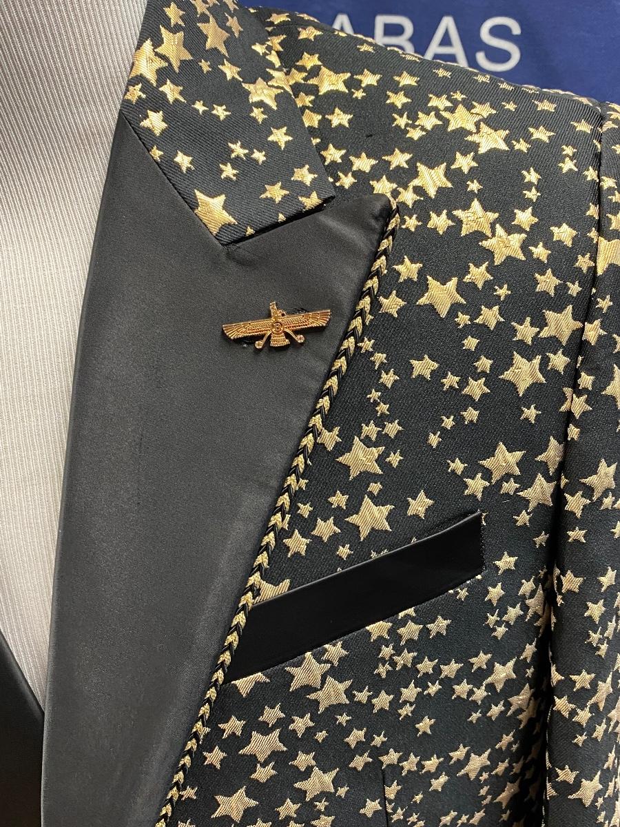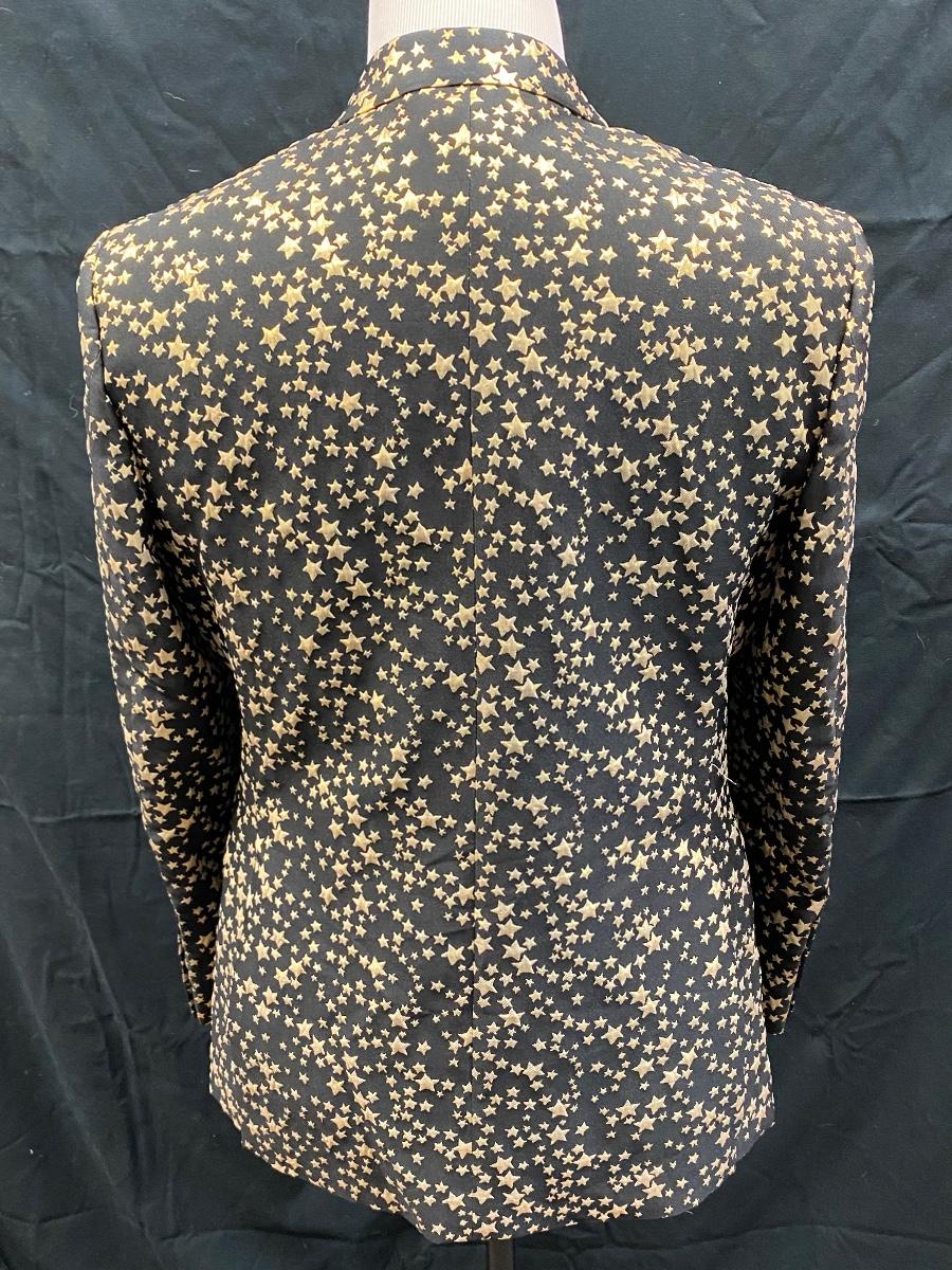 Flashy black with gold stars formal blazer suit jacket from Barabas. Slim fit, size 42R/L (large). Comes with protective storage bag. In very good condition. Great for formal events and parties.