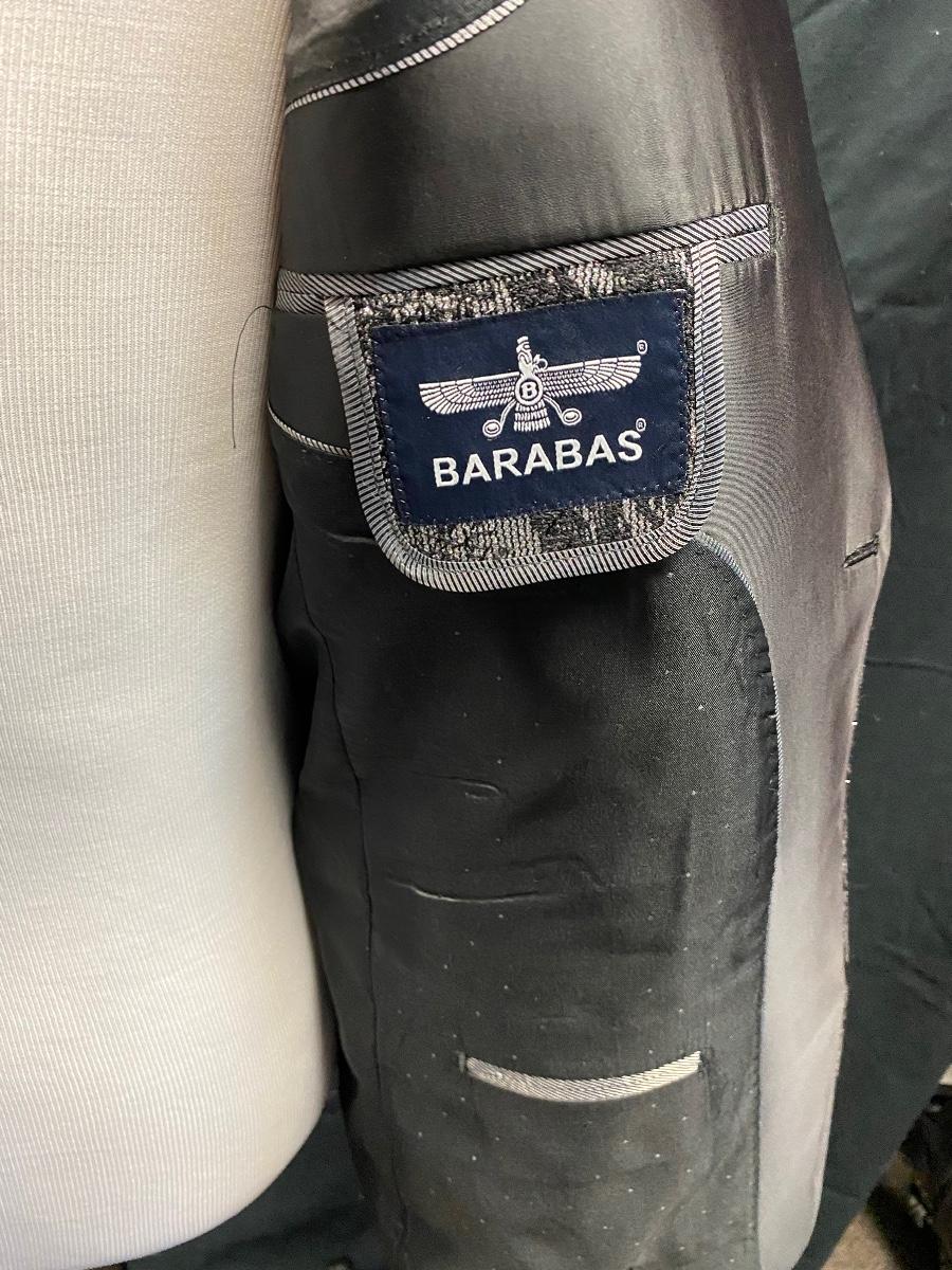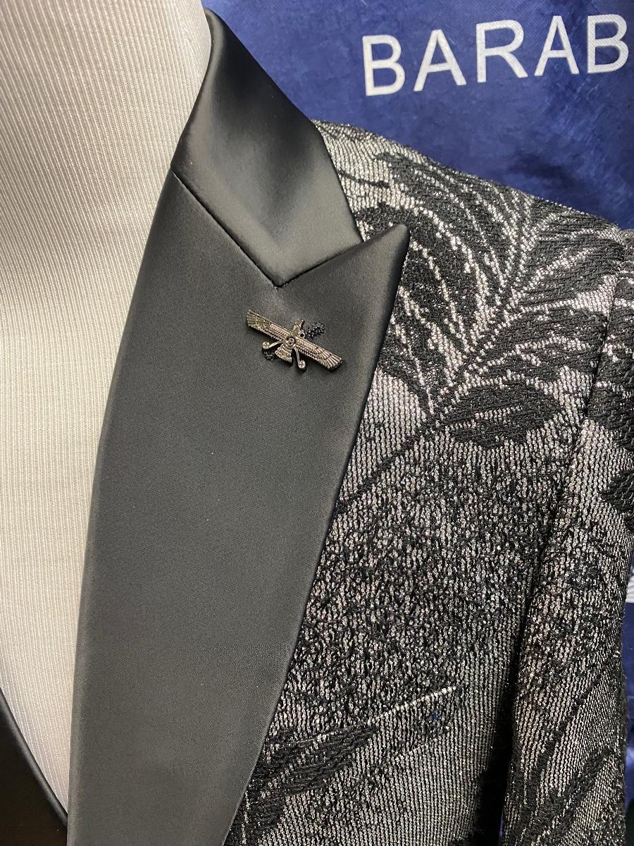Barabas Black on Black Leaf Pattern Formal Tuxedo Blazer Jacket. In excellent condition. Comes with Barabas protective storage bag. Size is 42R/L (large). Great for formal events and parties.