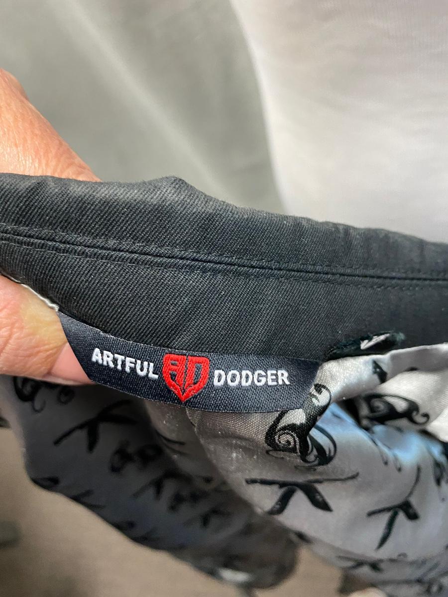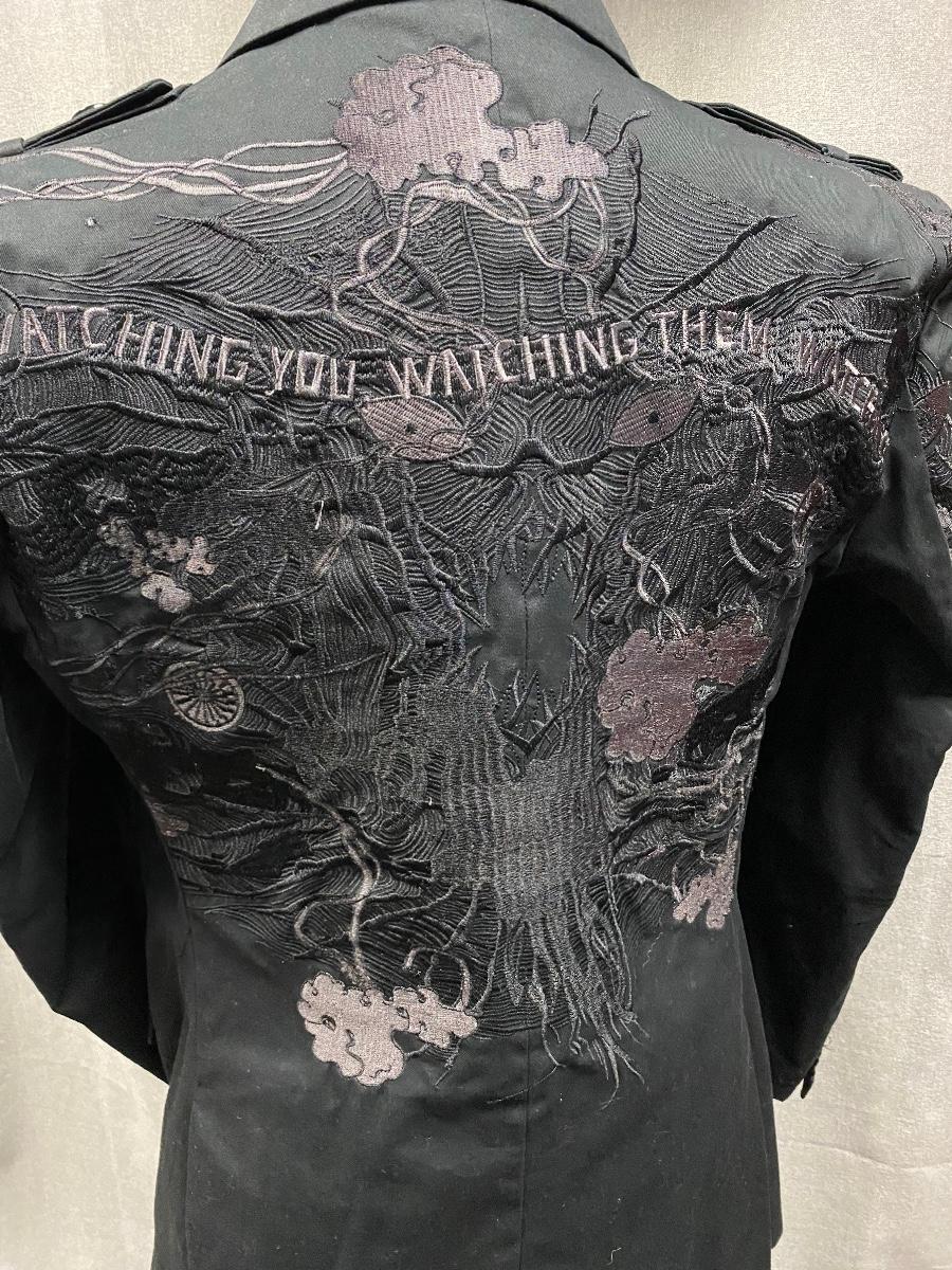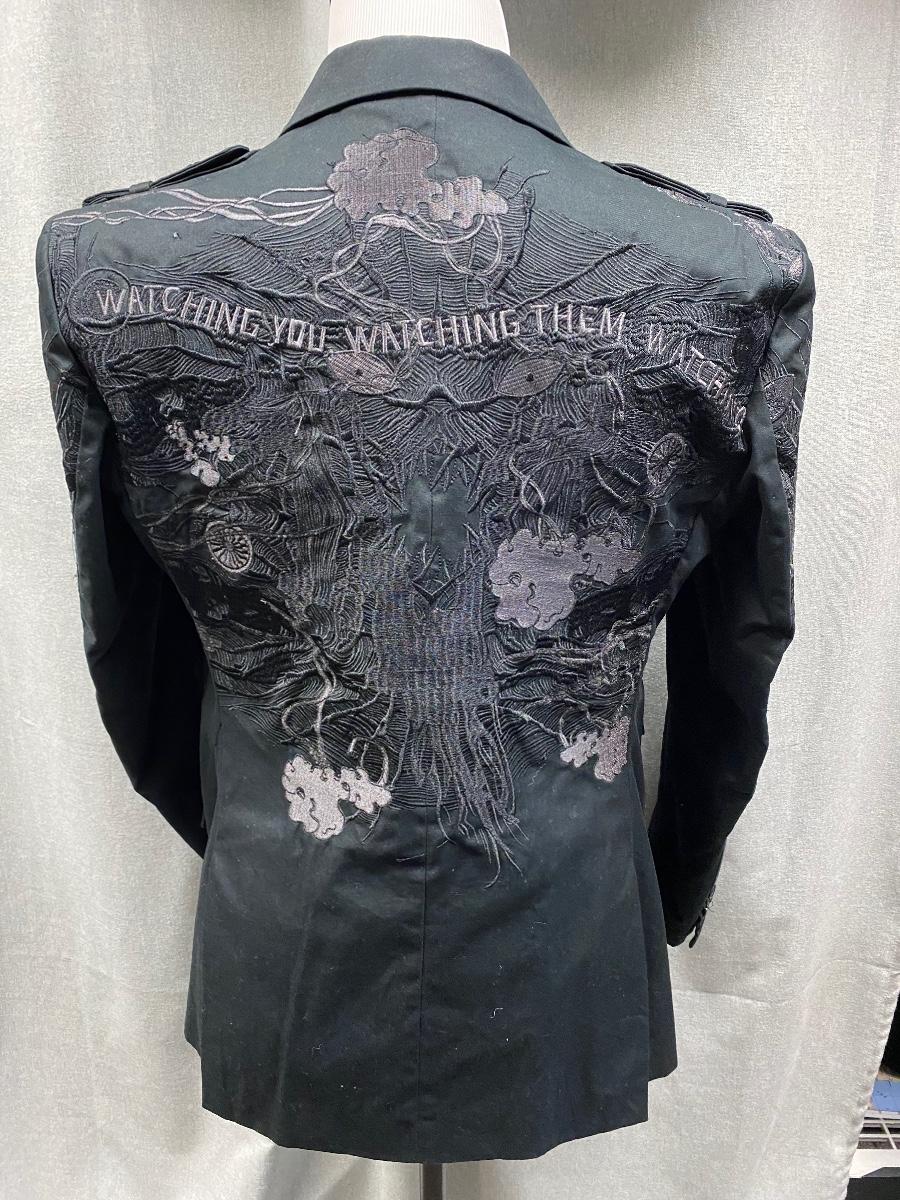 Men's Artful Dodger black on black dinner jacket sports coat. Back is heavily embroidered an Asian inspired dragon design with the phrase Watching You Watching Them Watching You. Size tag has been removed, looks like it might be a slim fit cut, large maybe medium size. Good condition.