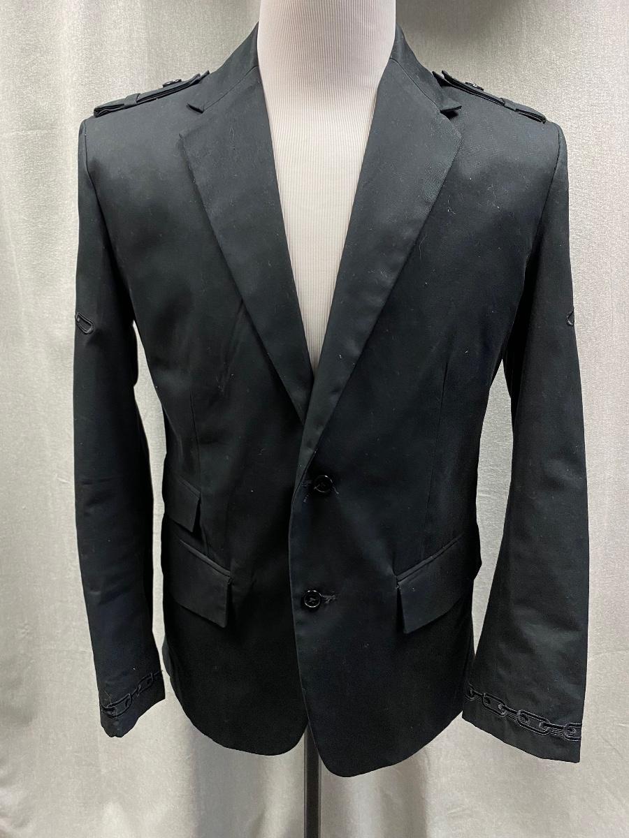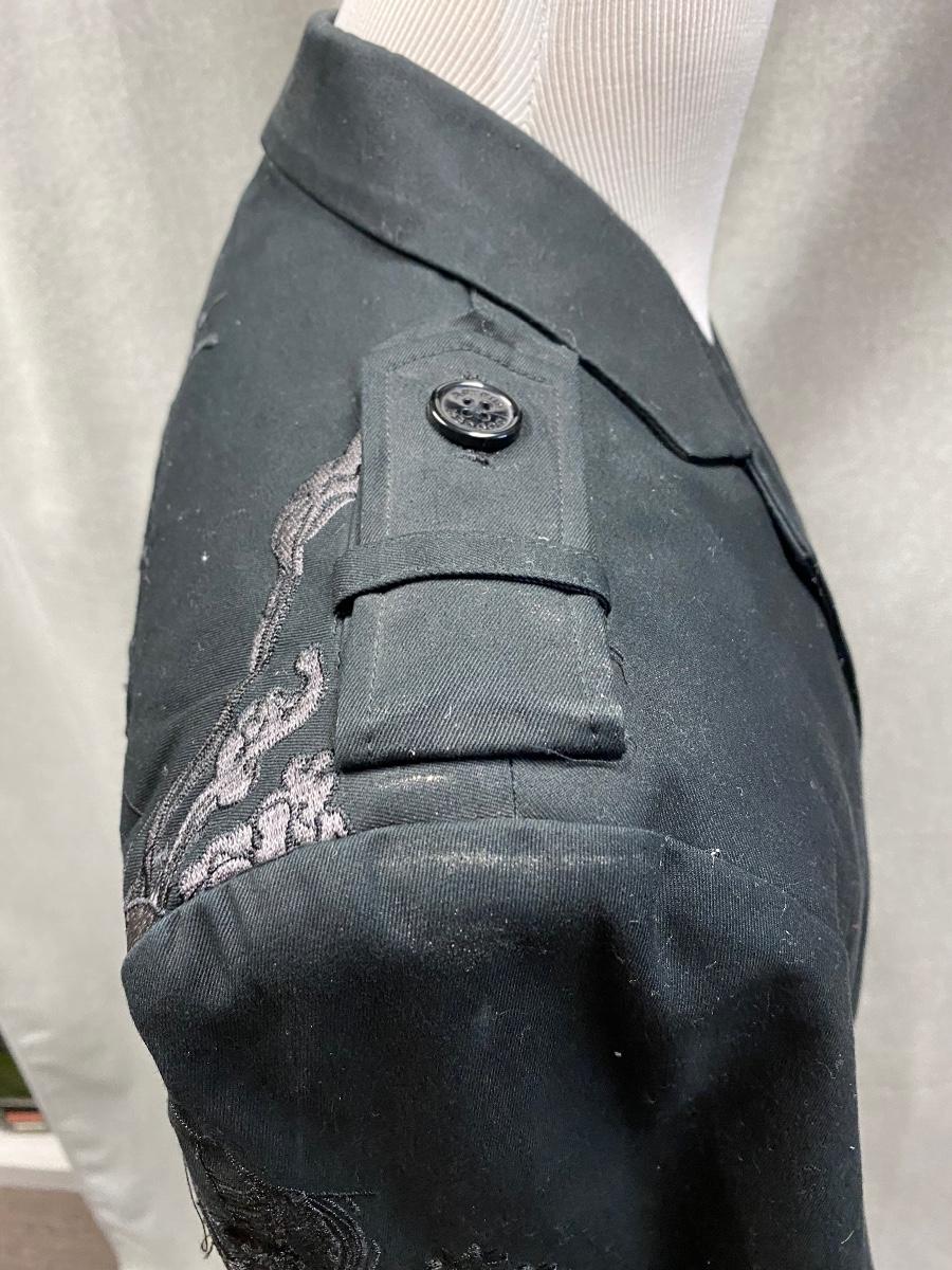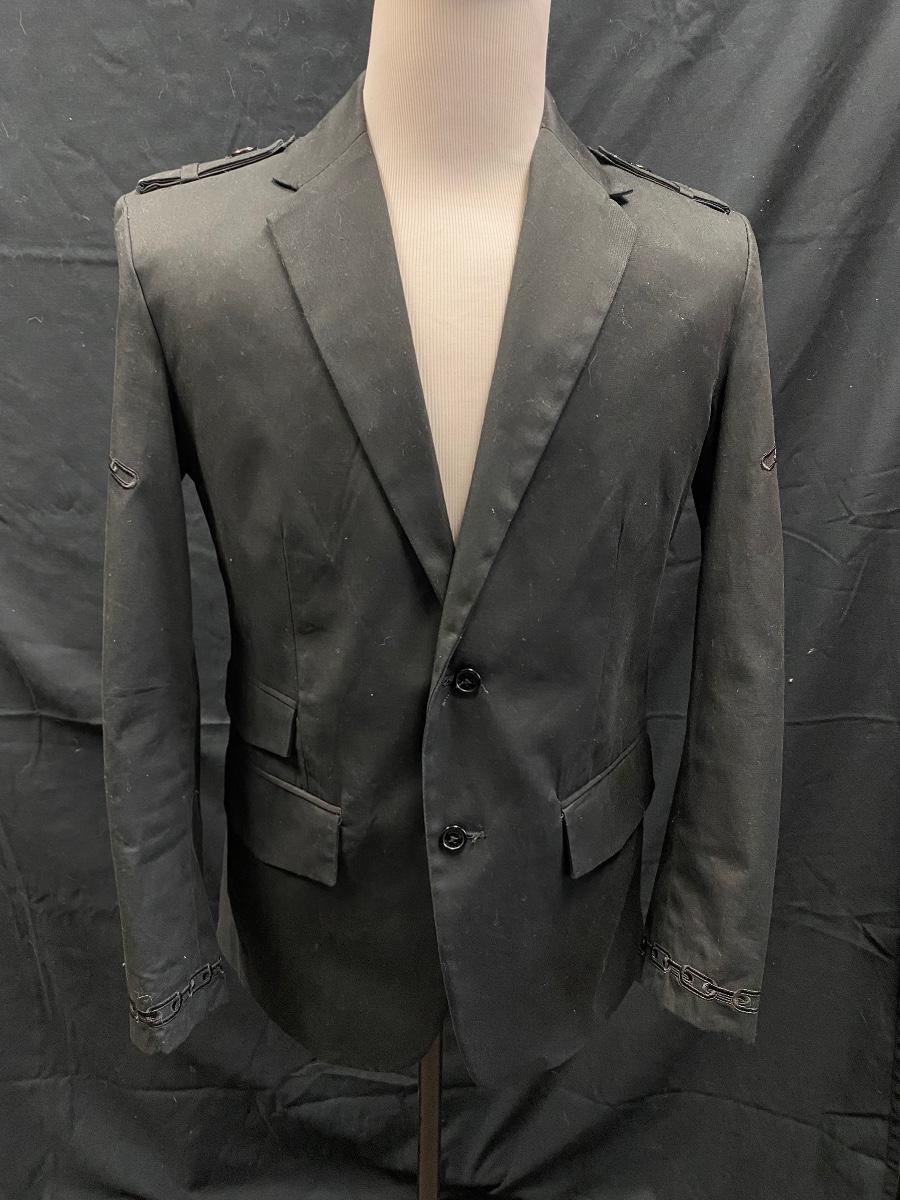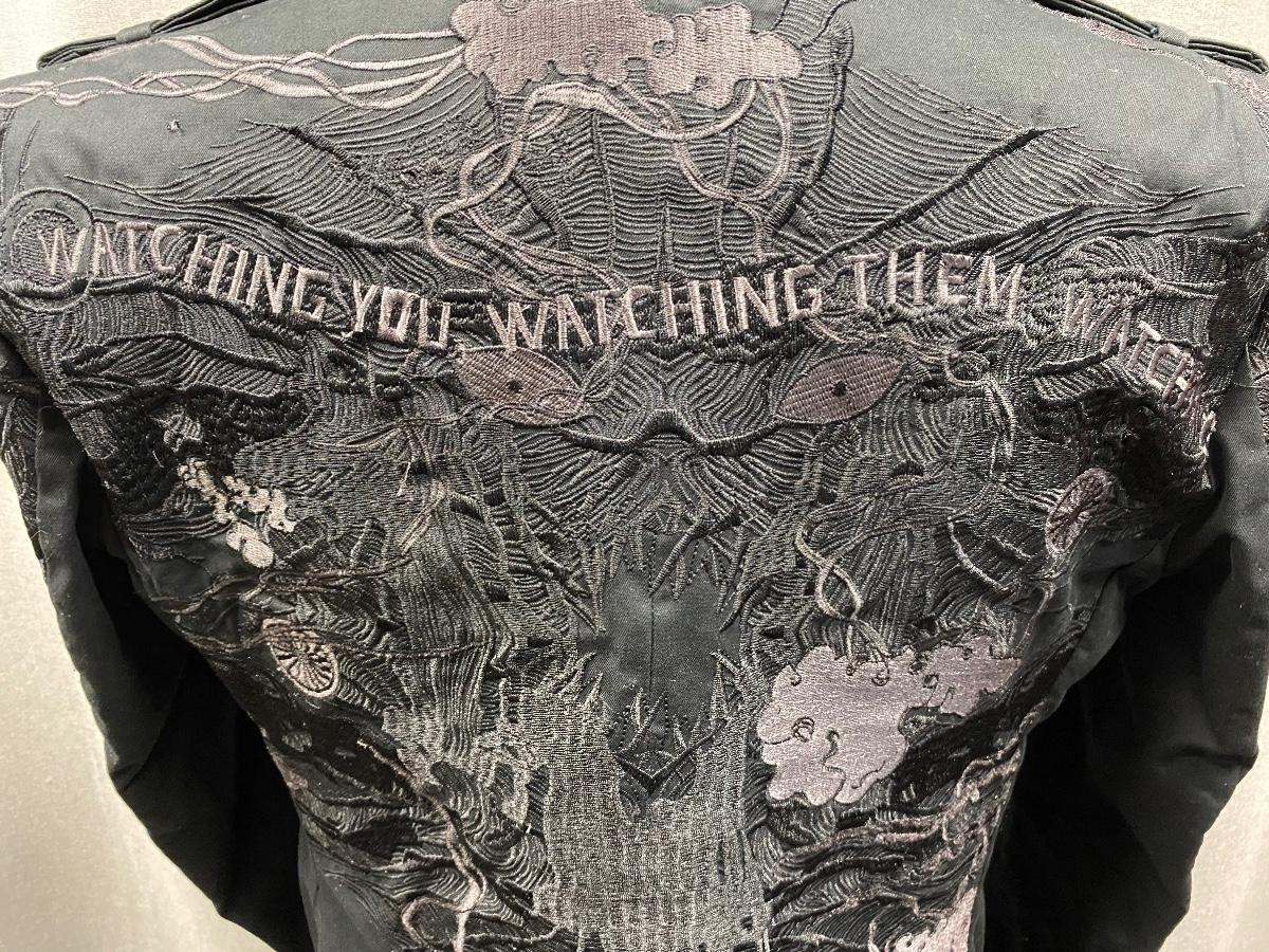 Men's Artful Dodger black on black dinner jacket sports coat. Back is heavily embroidered an Asian inspired dragon design with the phrase Watching You Watching Them Watching You. Size tag has been removed, looks like it might be a slim fit cut, large maybe medium size. Good condition.