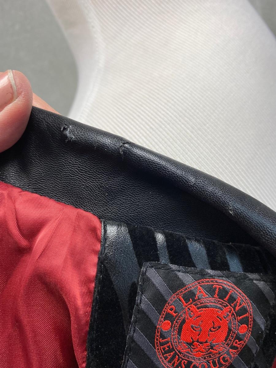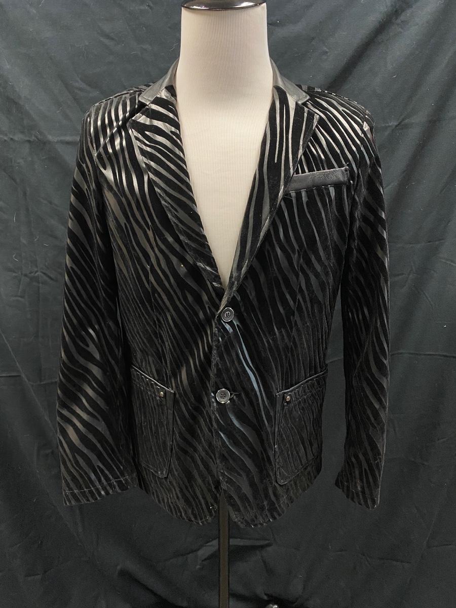 Men's Platini Jeans Cougar flashy dinner jacket sports coat. Black velvet on black faux leather tiger/zebra stripe design. In good condition. Size Large. Great for parties and events.
