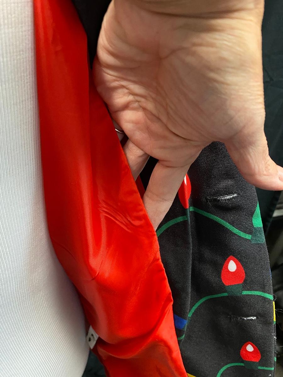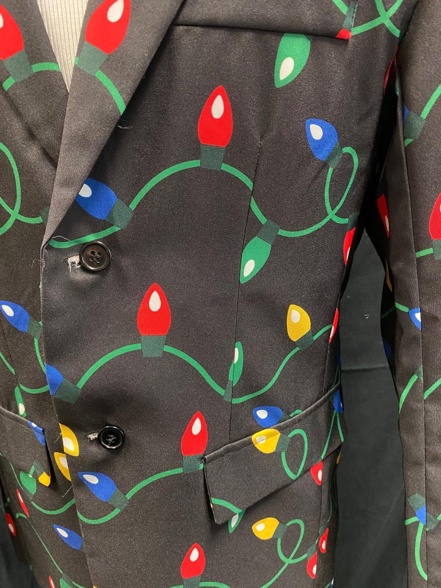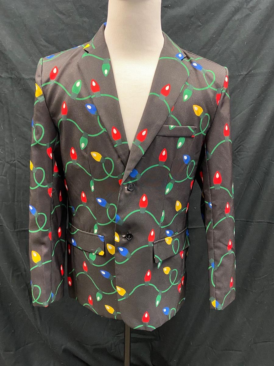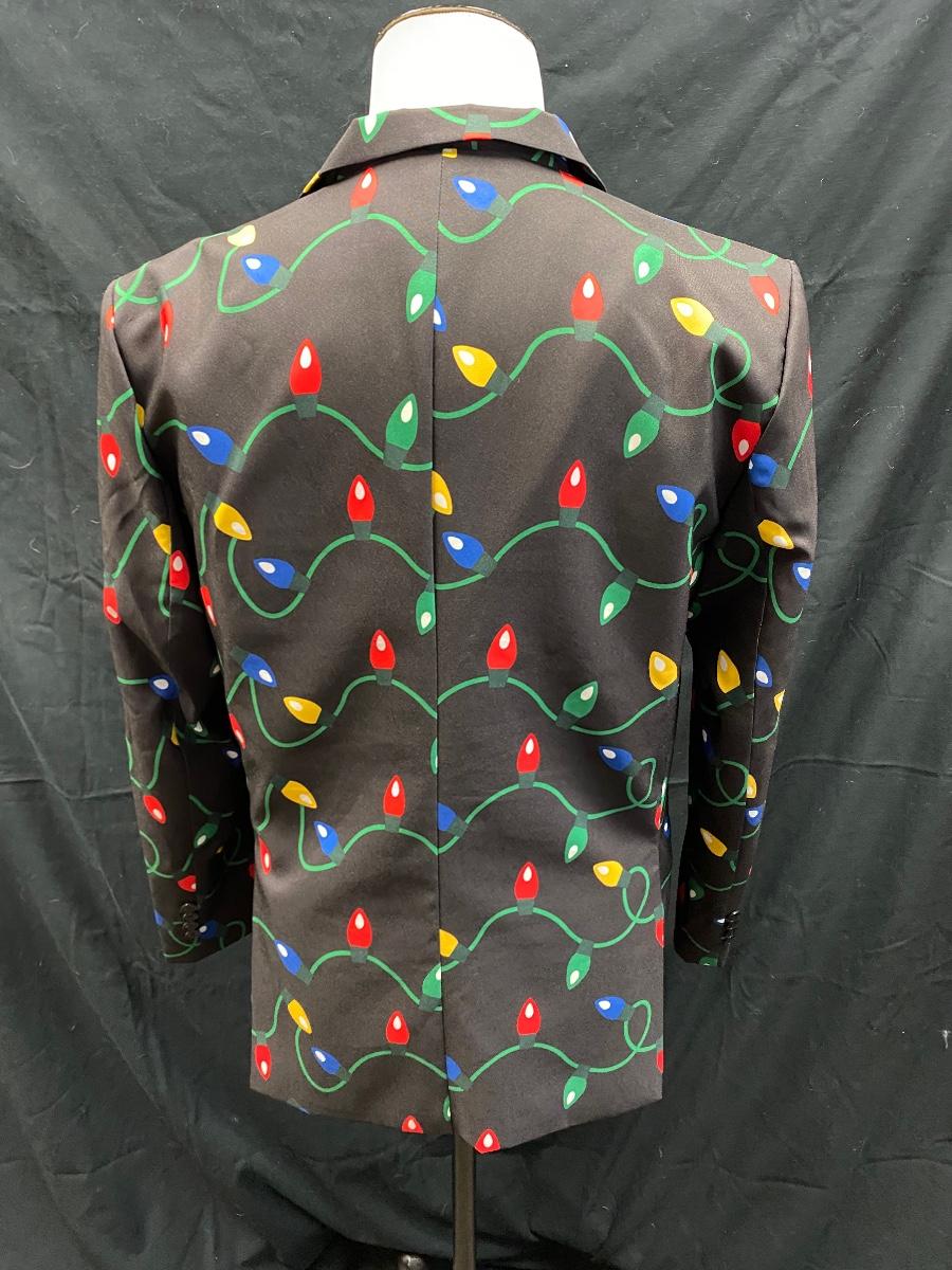 Men's novelty Christmas holiday sports coat jacket. Black with a colorful Christmas light pattern. Faux outside pockets but there is an inside pocket along the lapel edge on one side. Lightweight, great for holiday parties and photos. Size tag removed, probably a large, maybe medium.