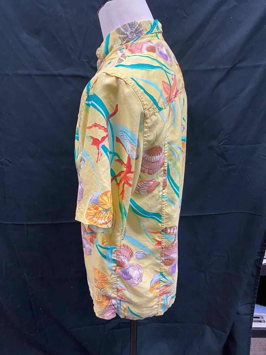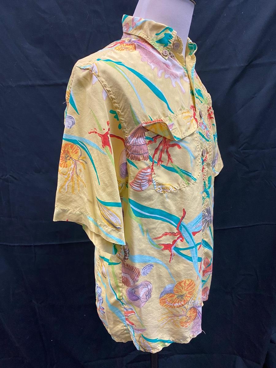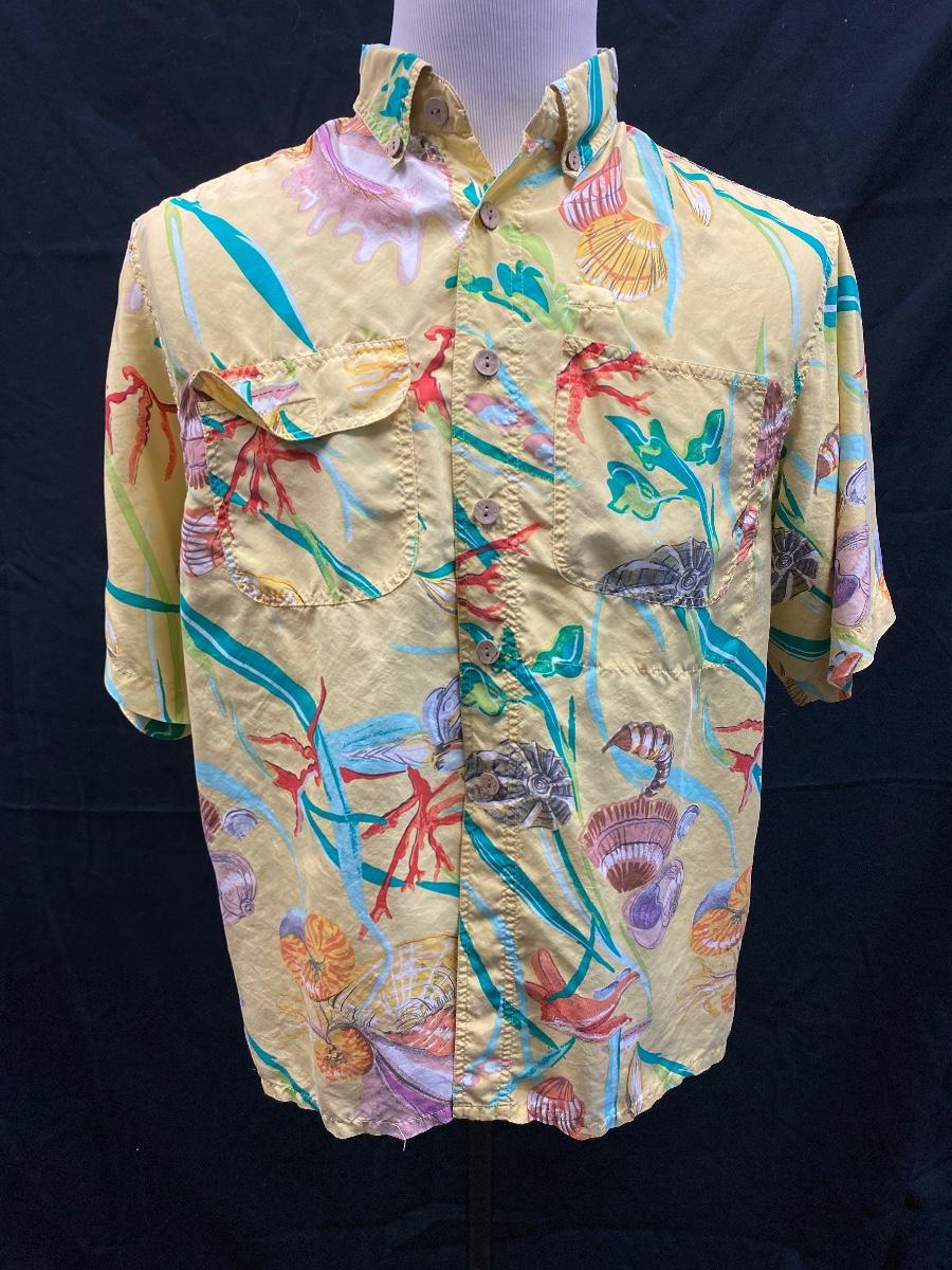 Men's tide pool sea life themed Hawaiian shirt from Coconut Cove. Pale yellow with ocean theme, button front, short sleeves. Multiple pockets including a pen pocket. Size tag removed, looks like a large.