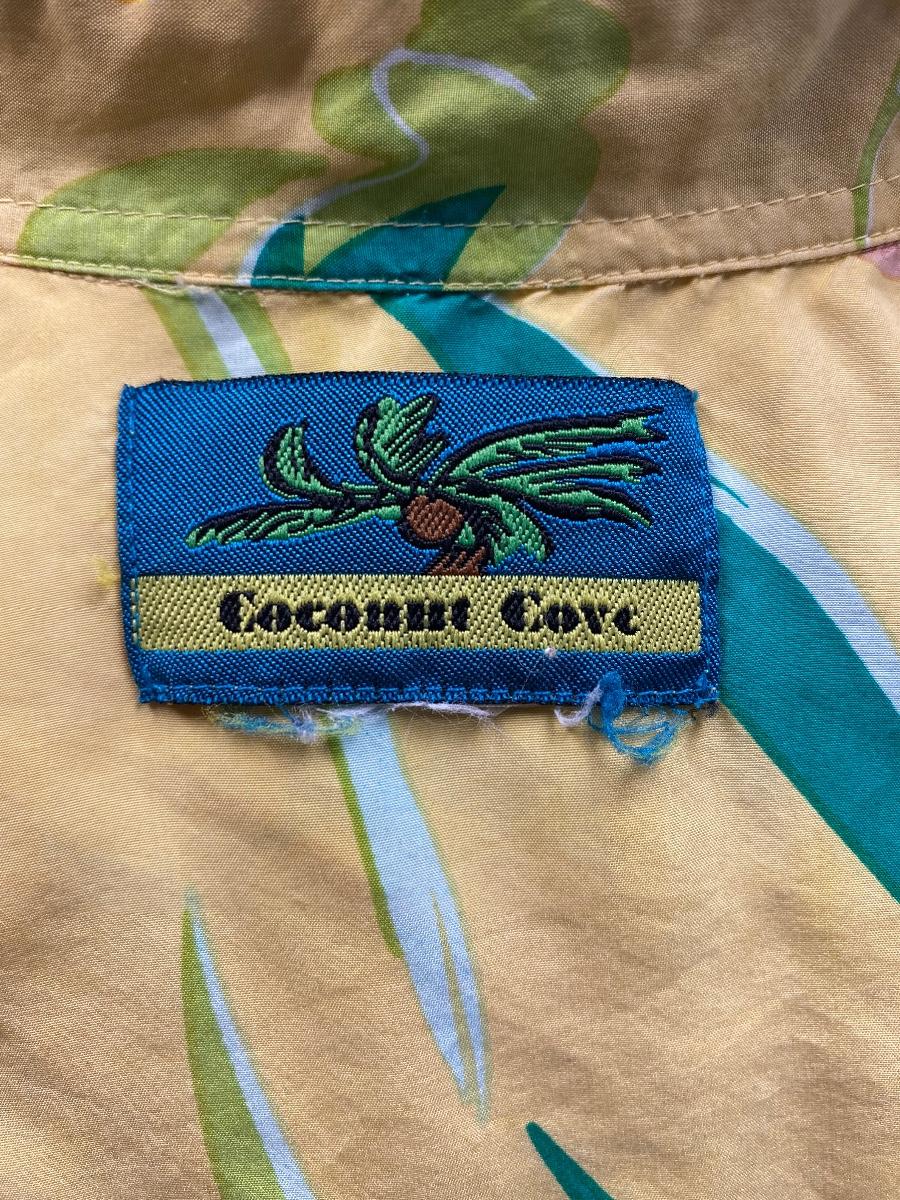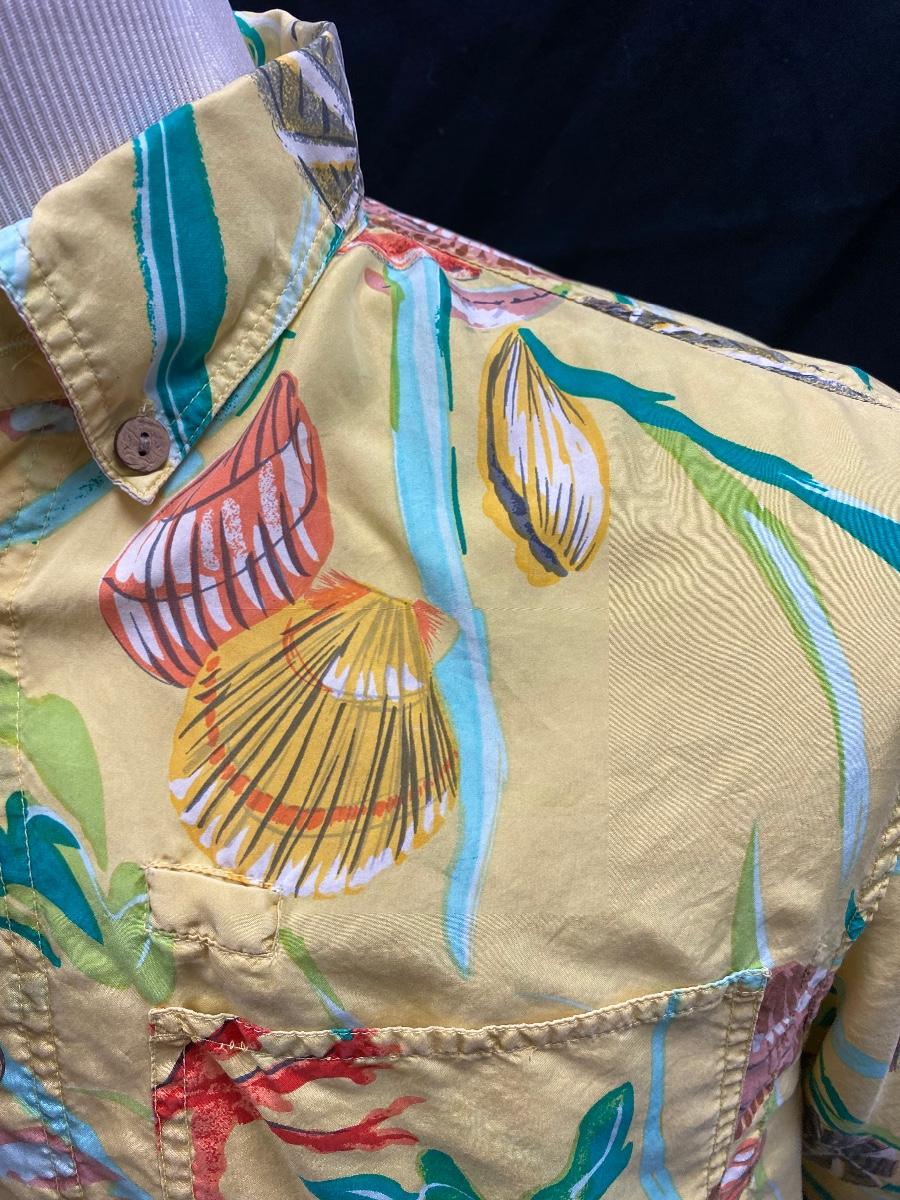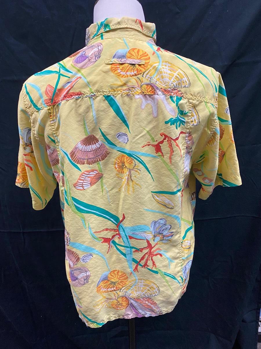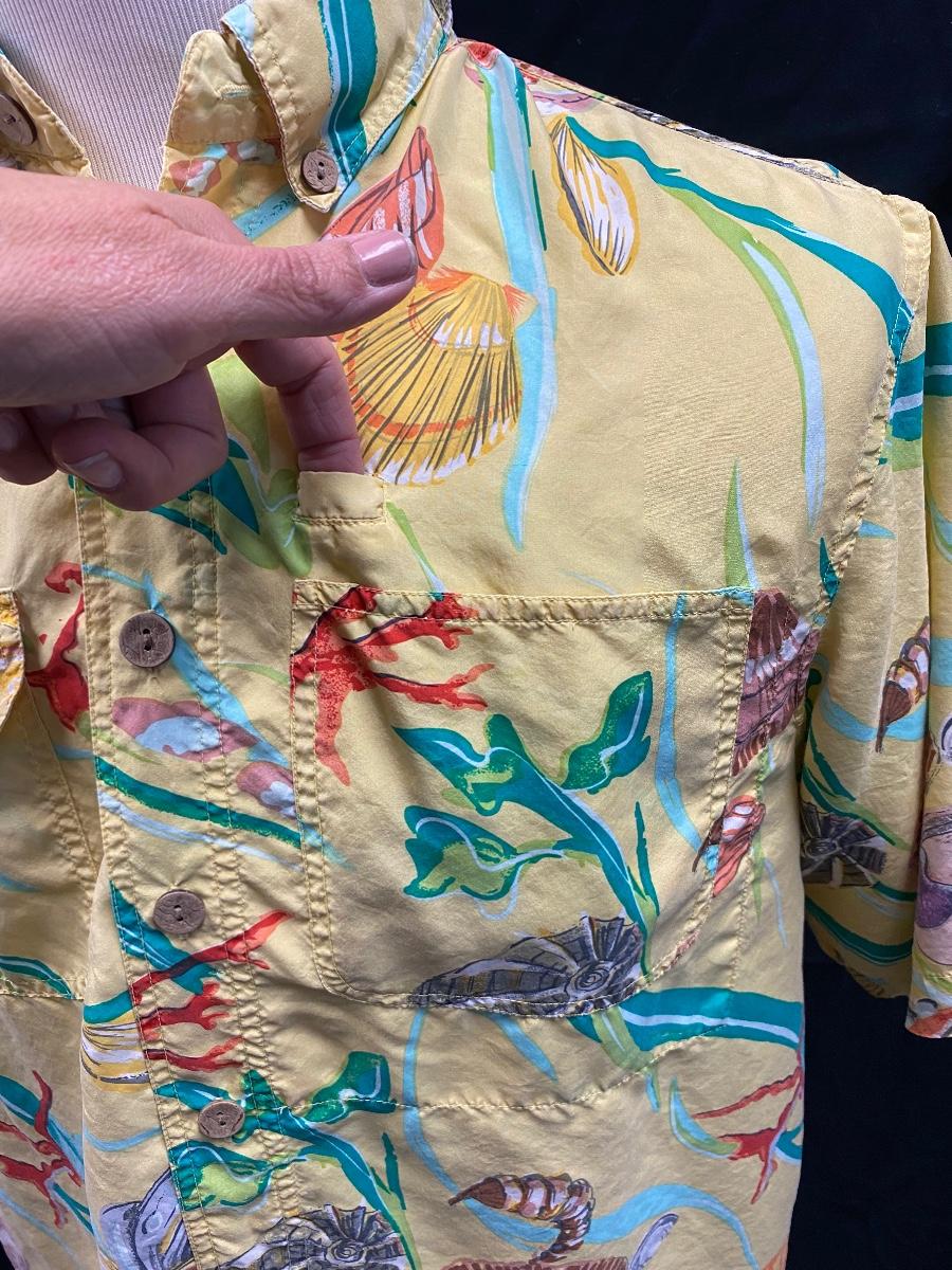 Men's tide pool sea life themed Hawaiian shirt from Coconut Cove. Pale yellow with ocean theme, button front, short sleeves. Multiple pockets including a pen pocket. Size tag removed, looks like a large.